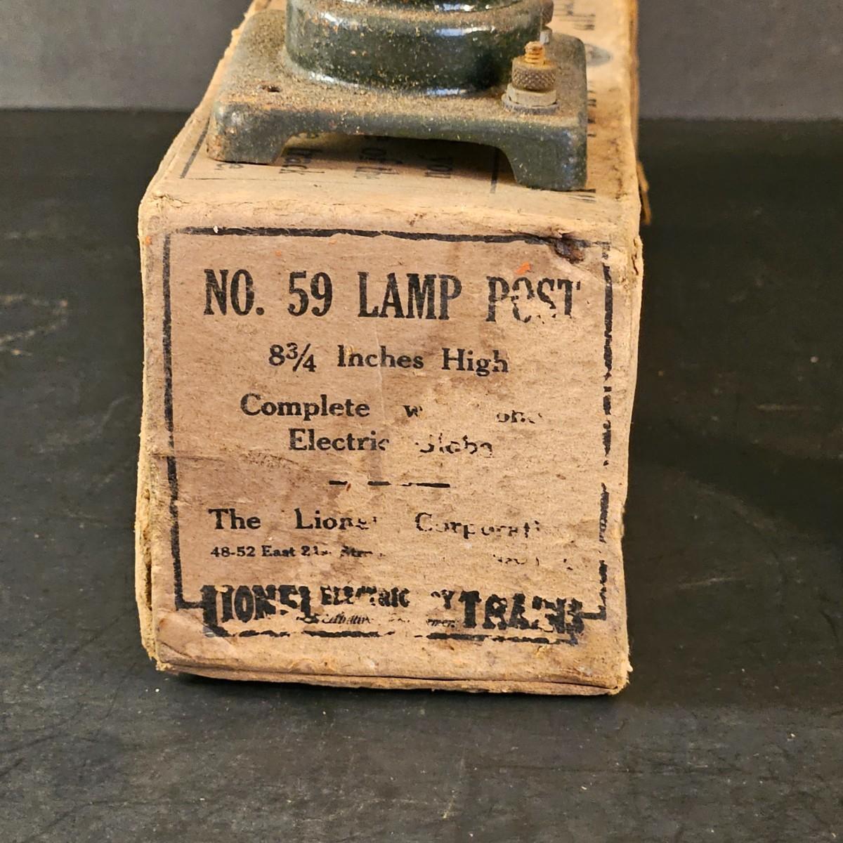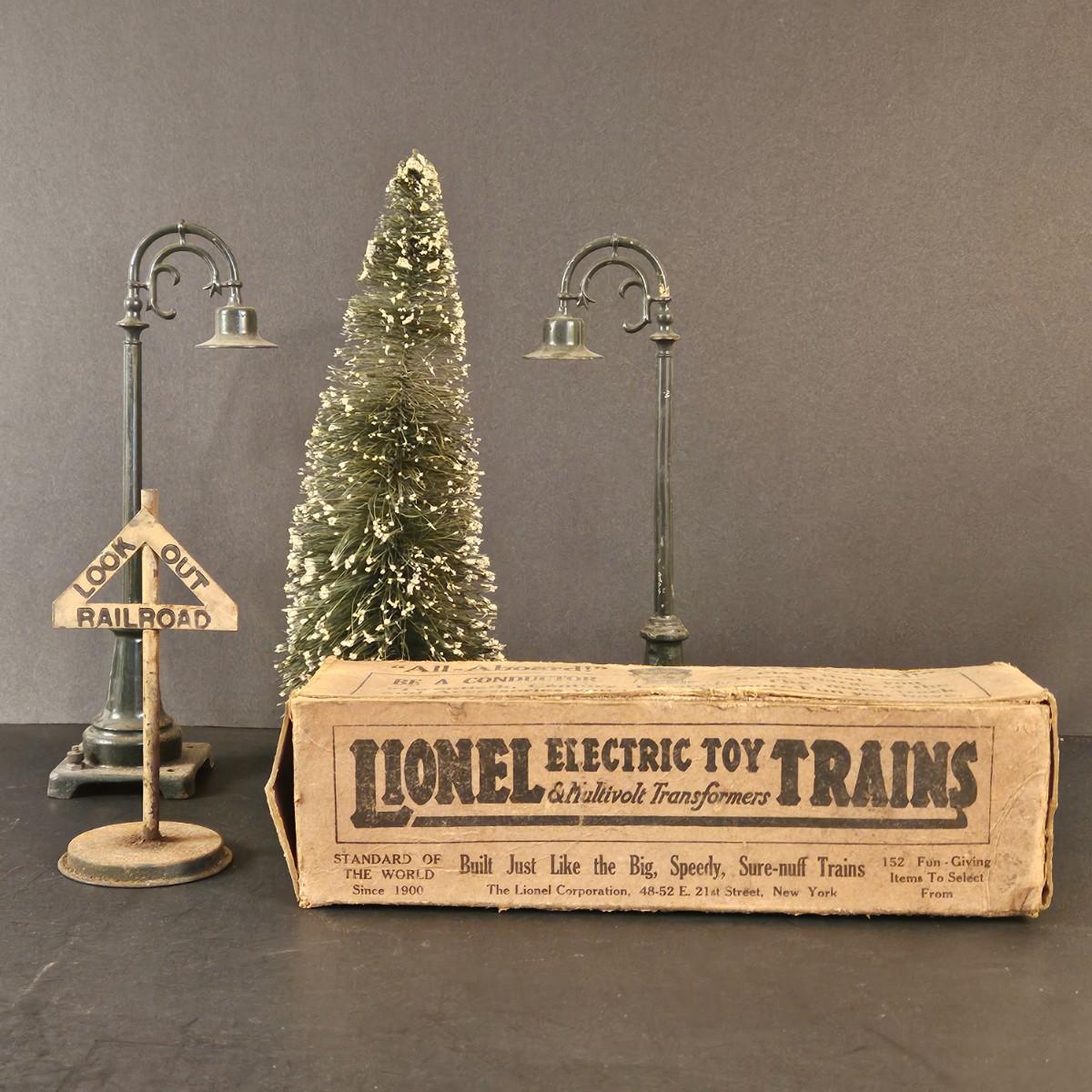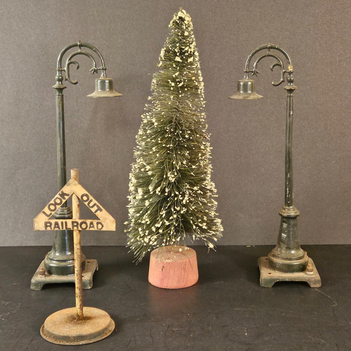 LOT 303S: Vintage Lionel #58, O Gauge Lamp Posts w/Box, Railroad Lookout Sign & Bottle Brush Tree