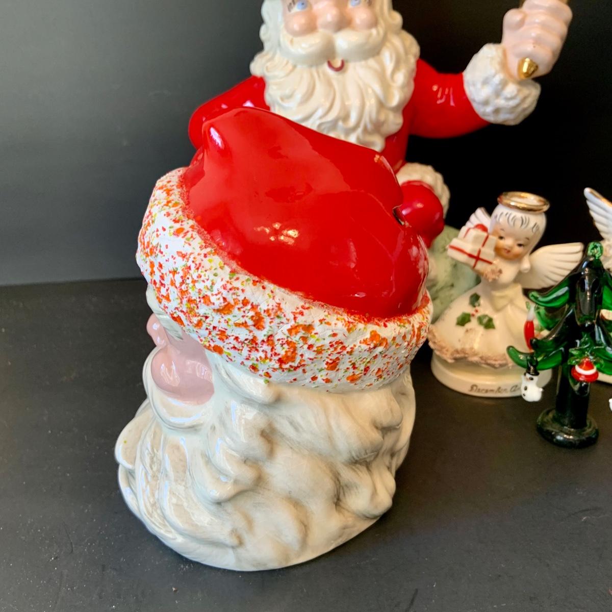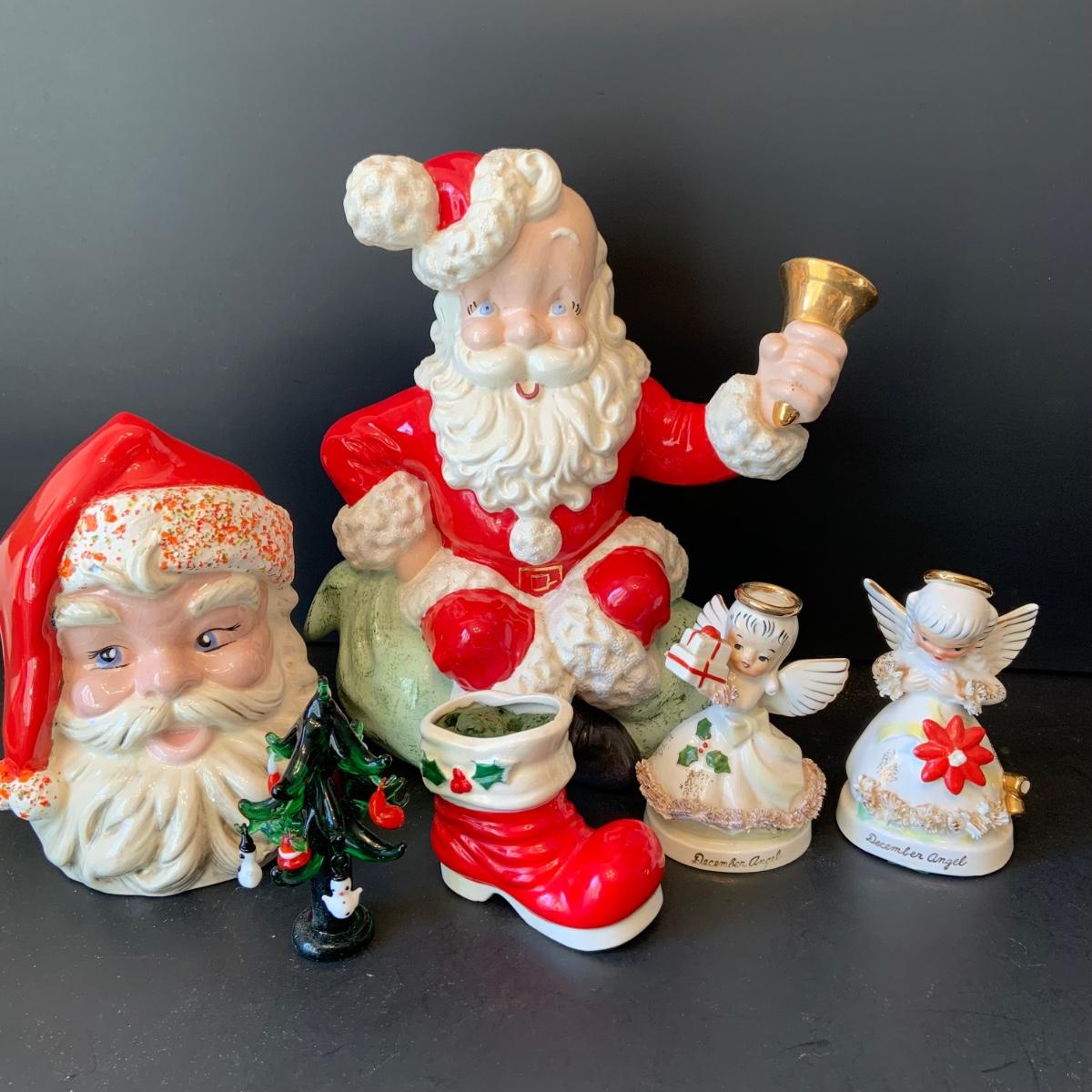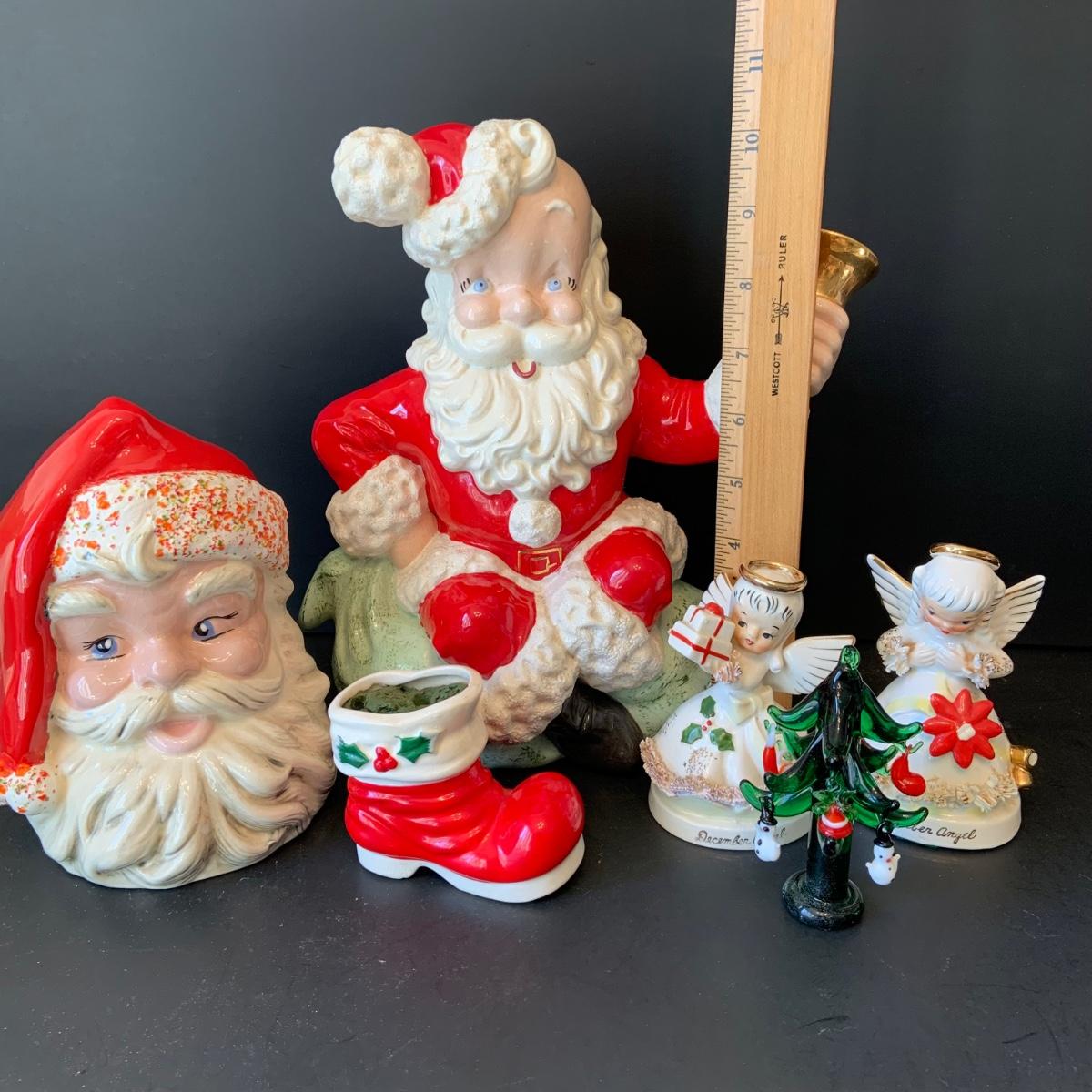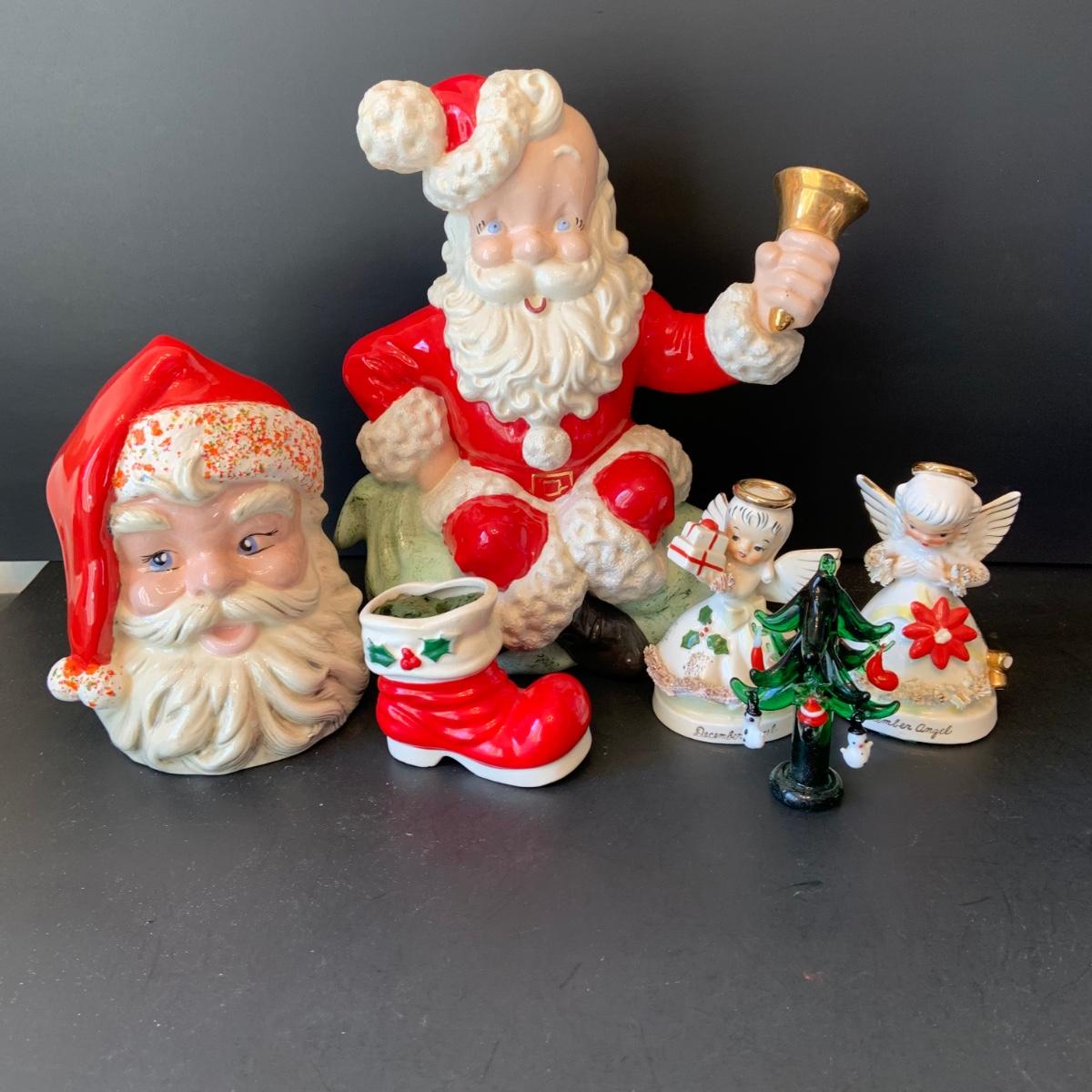 LOT:317G: Old Fashion Christmas Collection with Vintage Ceramic Santas - Holland Mold Santa Head Bank, Atlantic Mold Wind-upSanta with Bell, Glass Tree, Napco December Angles and More