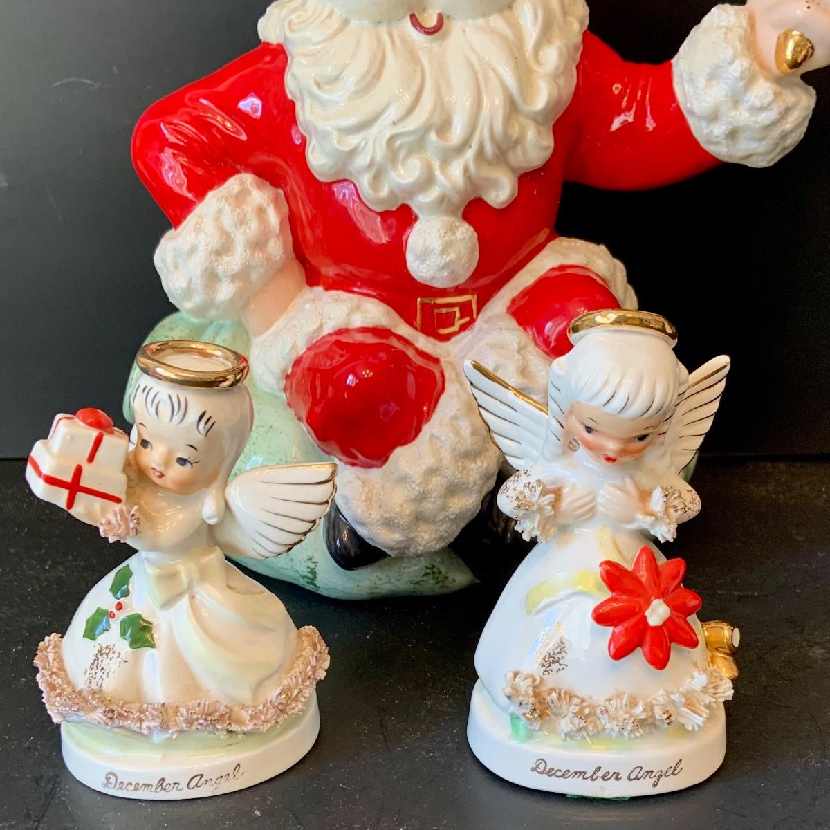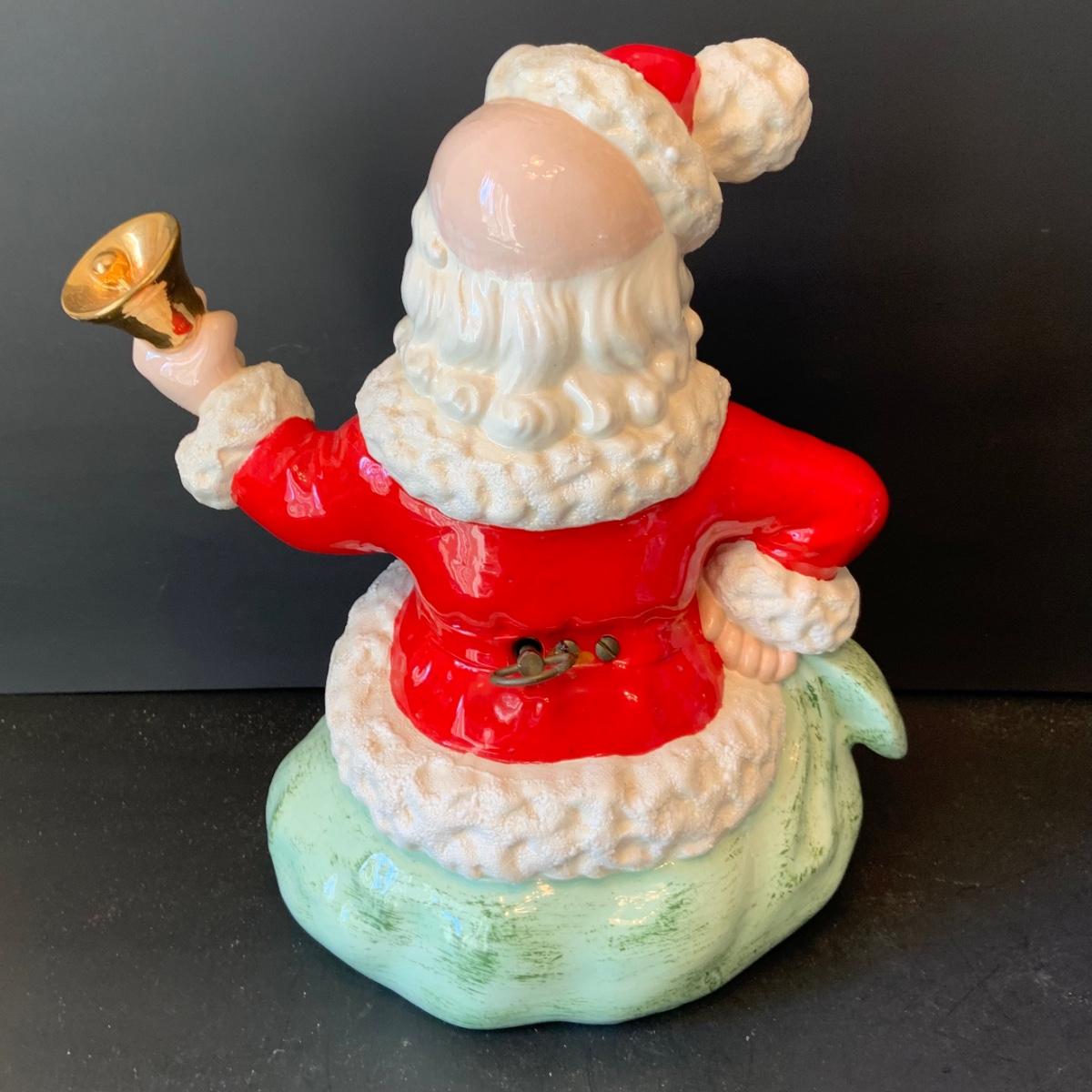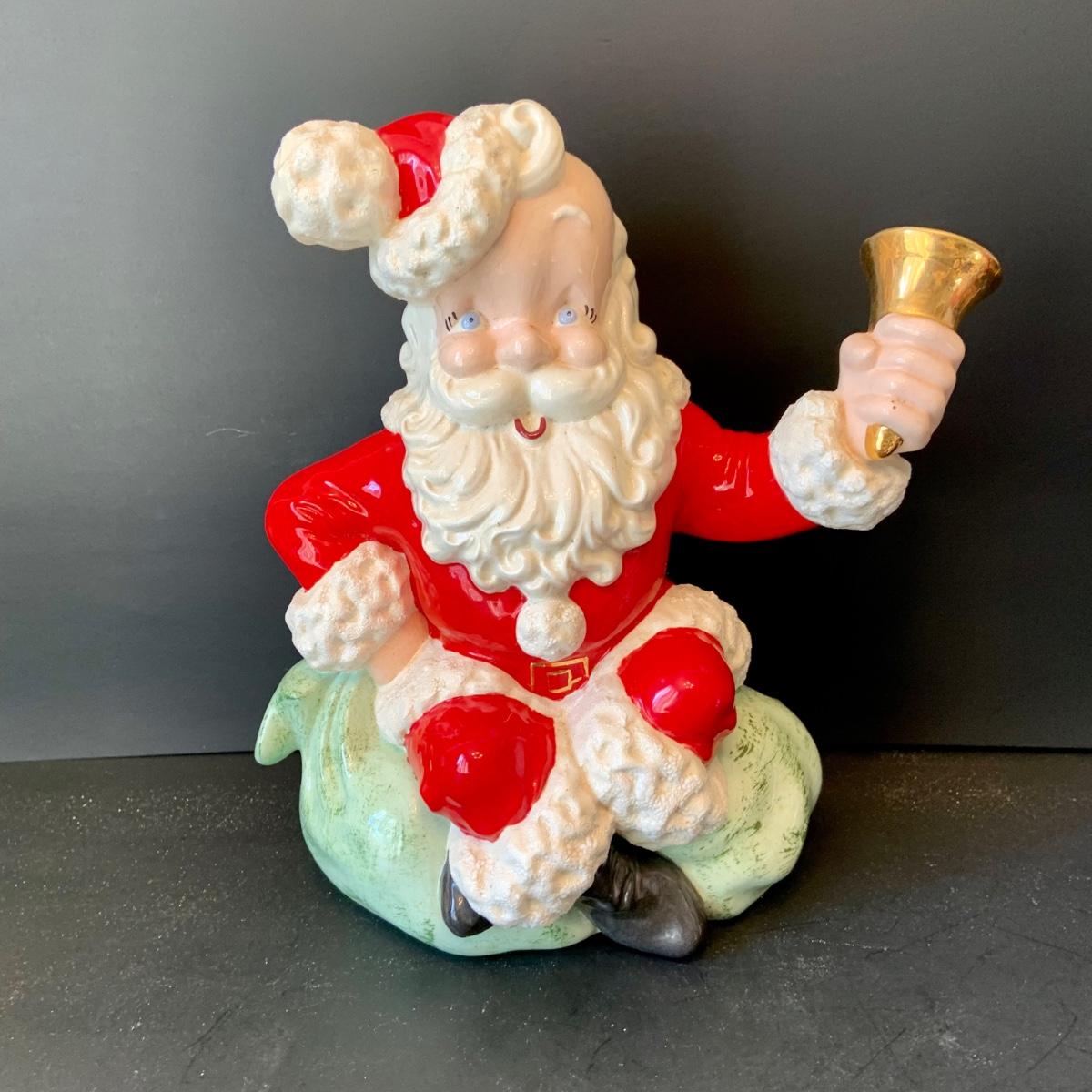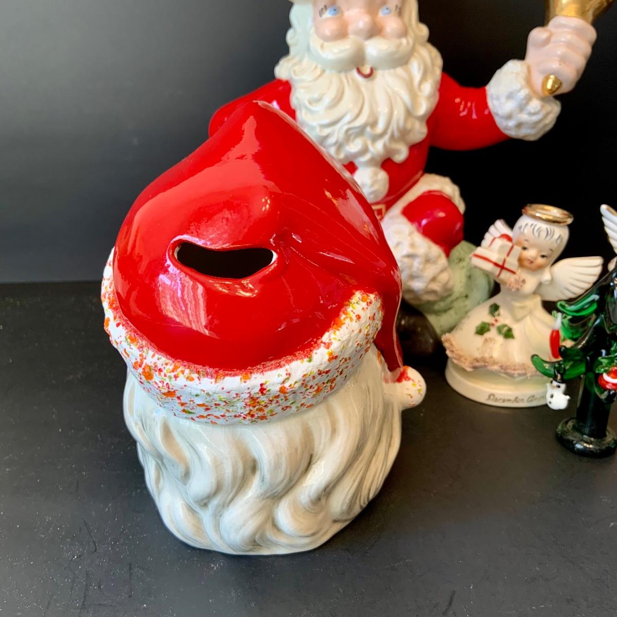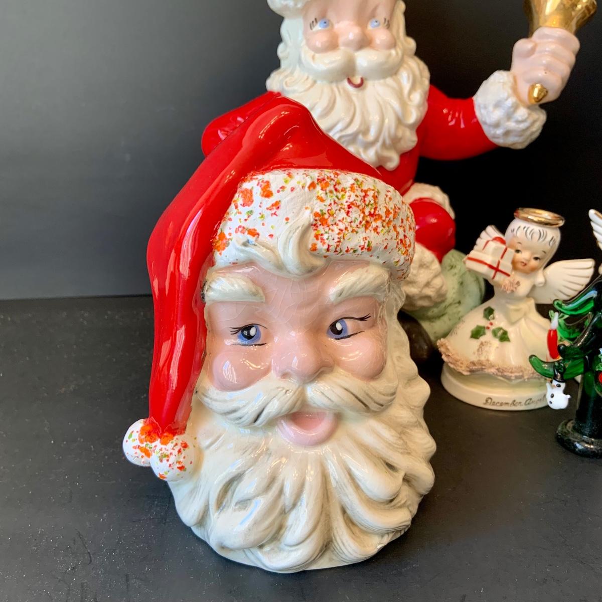 LOT:317G: Old Fashion Christmas Collection with Vintage Ceramic Santas - Holland Mold Santa Head Bank, Atlantic Mold Wind-upSanta with Bell, Glass Tree, Napco December Angles and More
