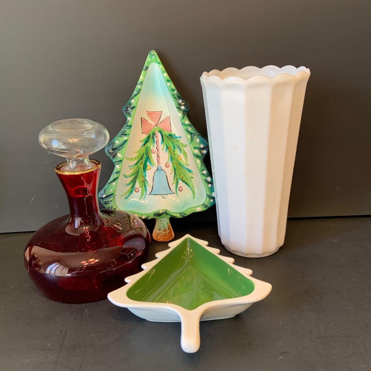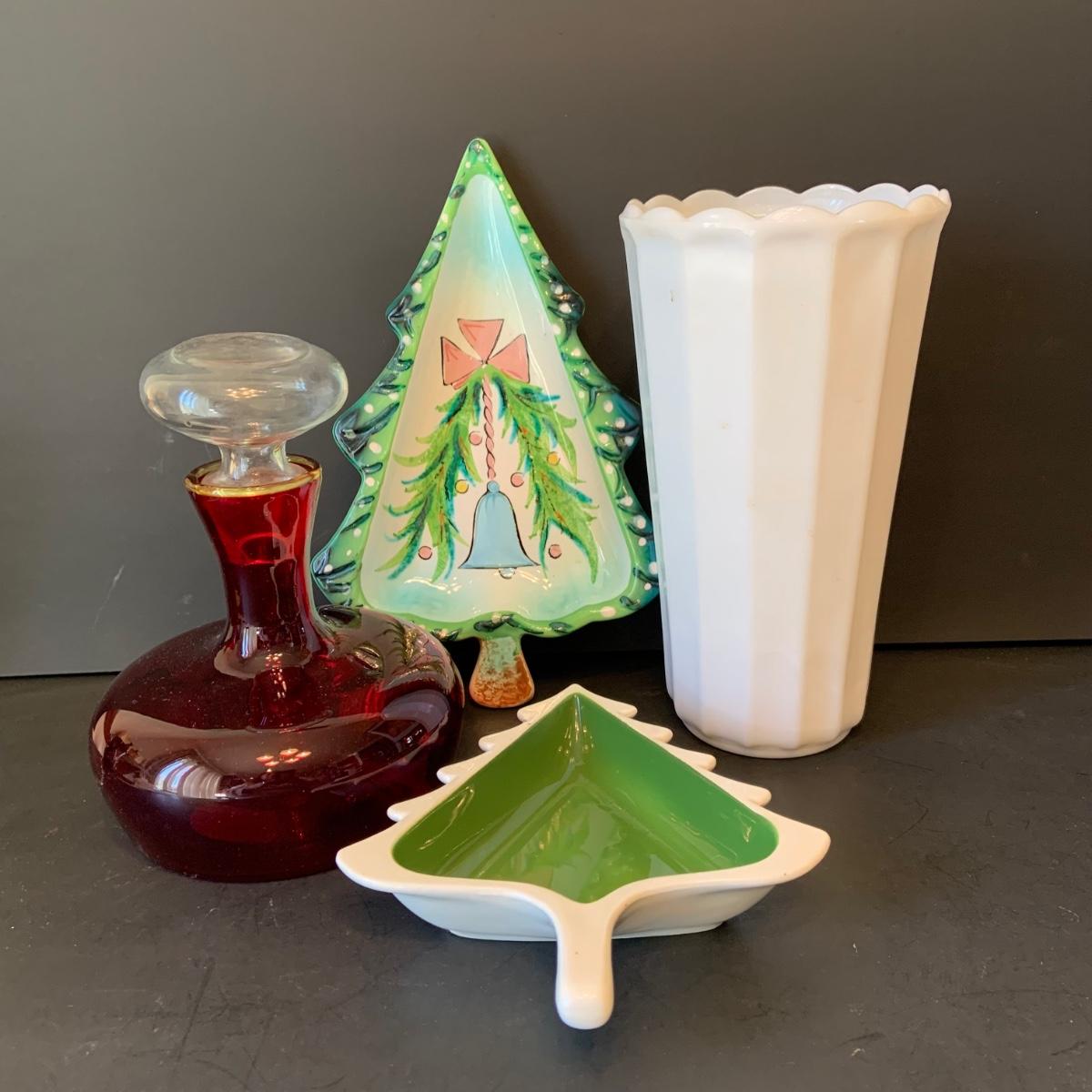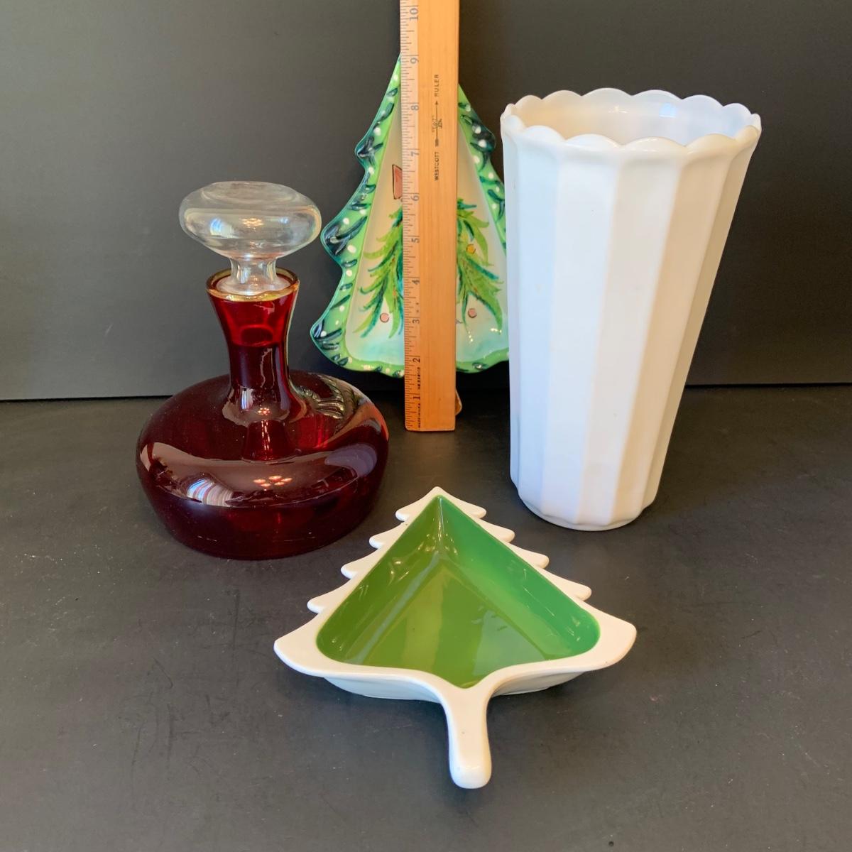 LOT:319G:  Vintage Christmas Decor Featuring 1959 Holt Howard Japan Tree Dish, Milk Glass Vase and Ruby Red Decanter and More
