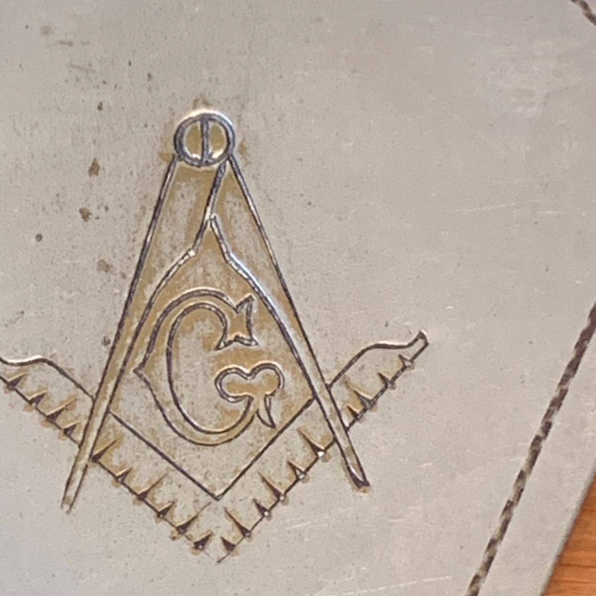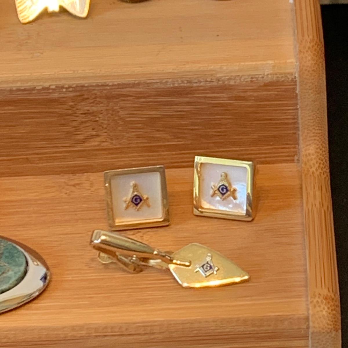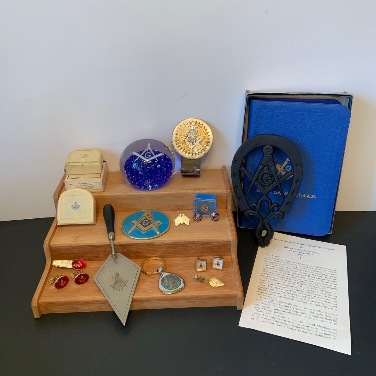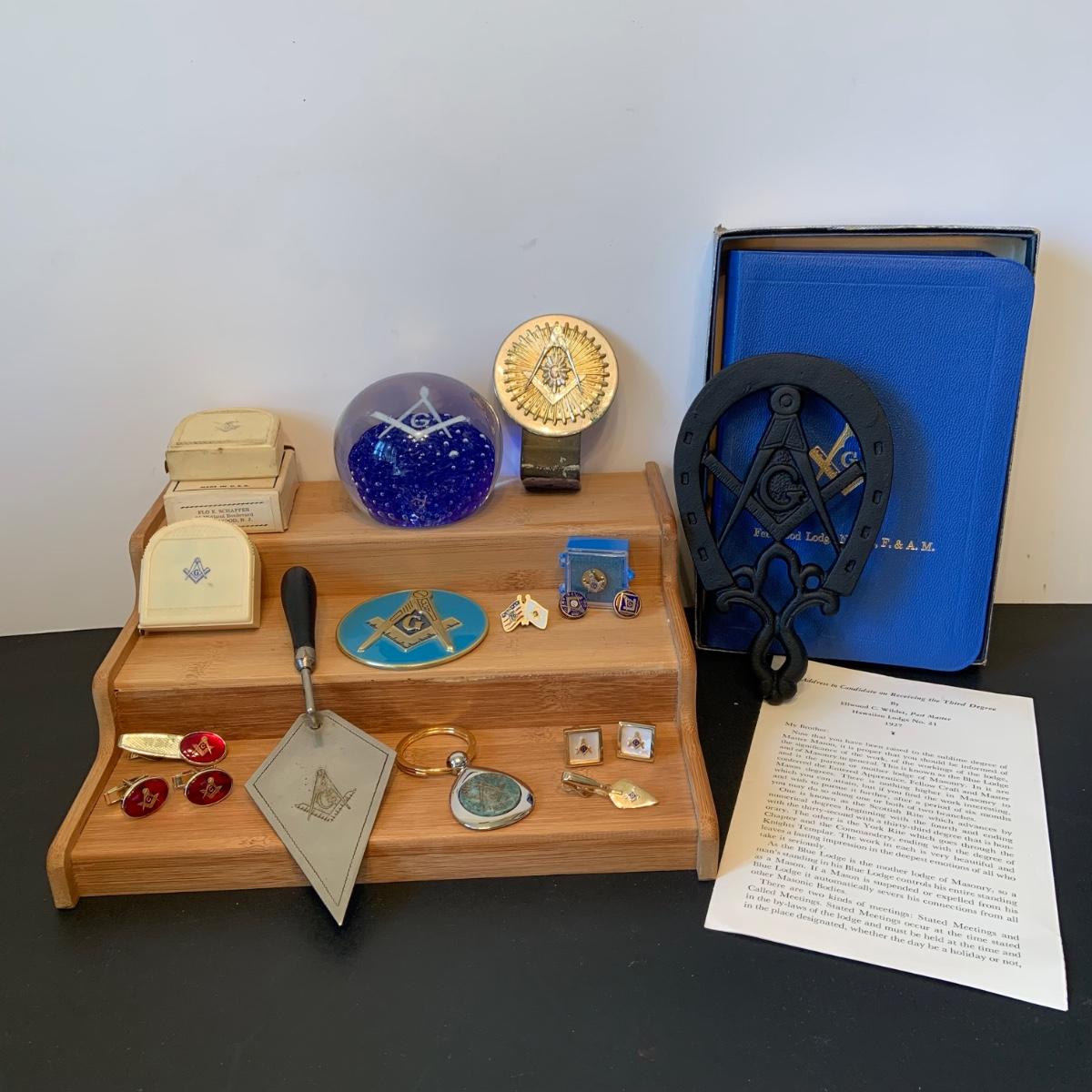 LOT:320G: Vintage FREEMASON Collection; Bible, John Gentile Paperweight,Cuff Links, Tie Pins, Commemorative Trowel Dated March 20th, 1907 & More