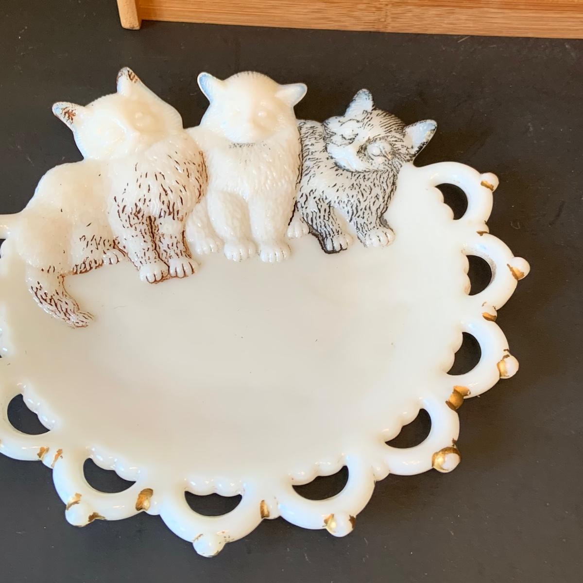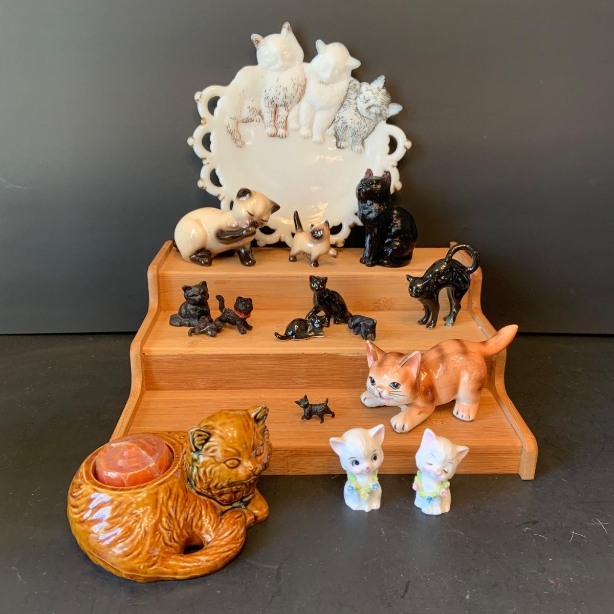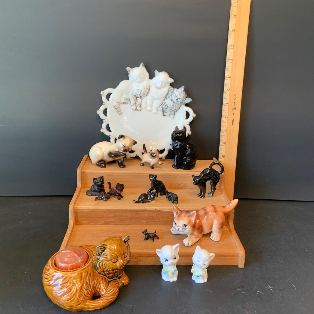 LOT:322G: Vintage Cat & Kitten Figurines; 1940's Robert Summon Tutsy Siamese cats, Mosser Glass Cat, Milk Glass Cat Plate & More