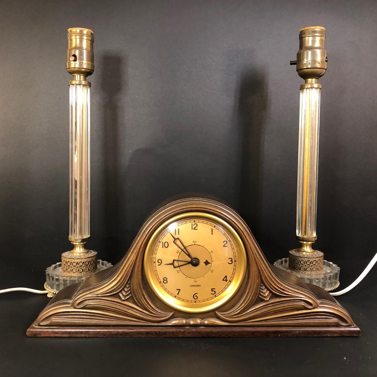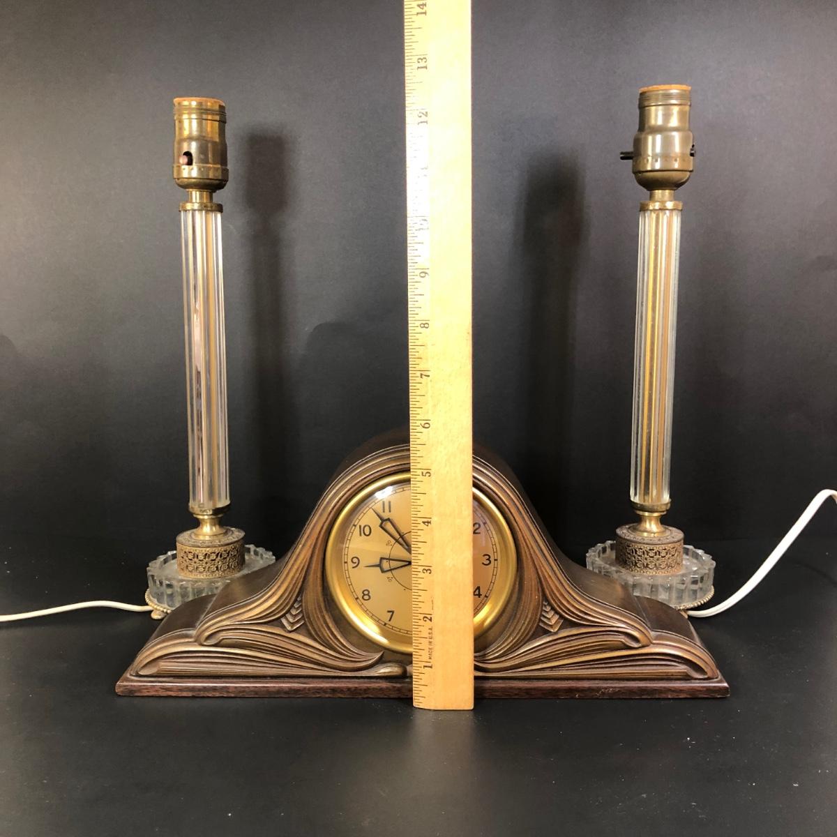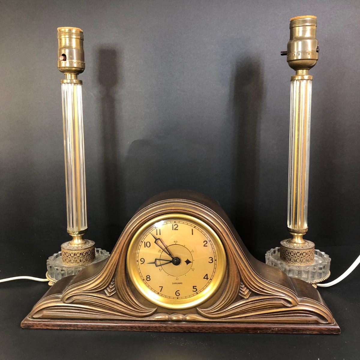 LOT 350M: Vintage Sangamo Electric Mantle Clock w/ Pair of Art Deco Candlestick Lamps