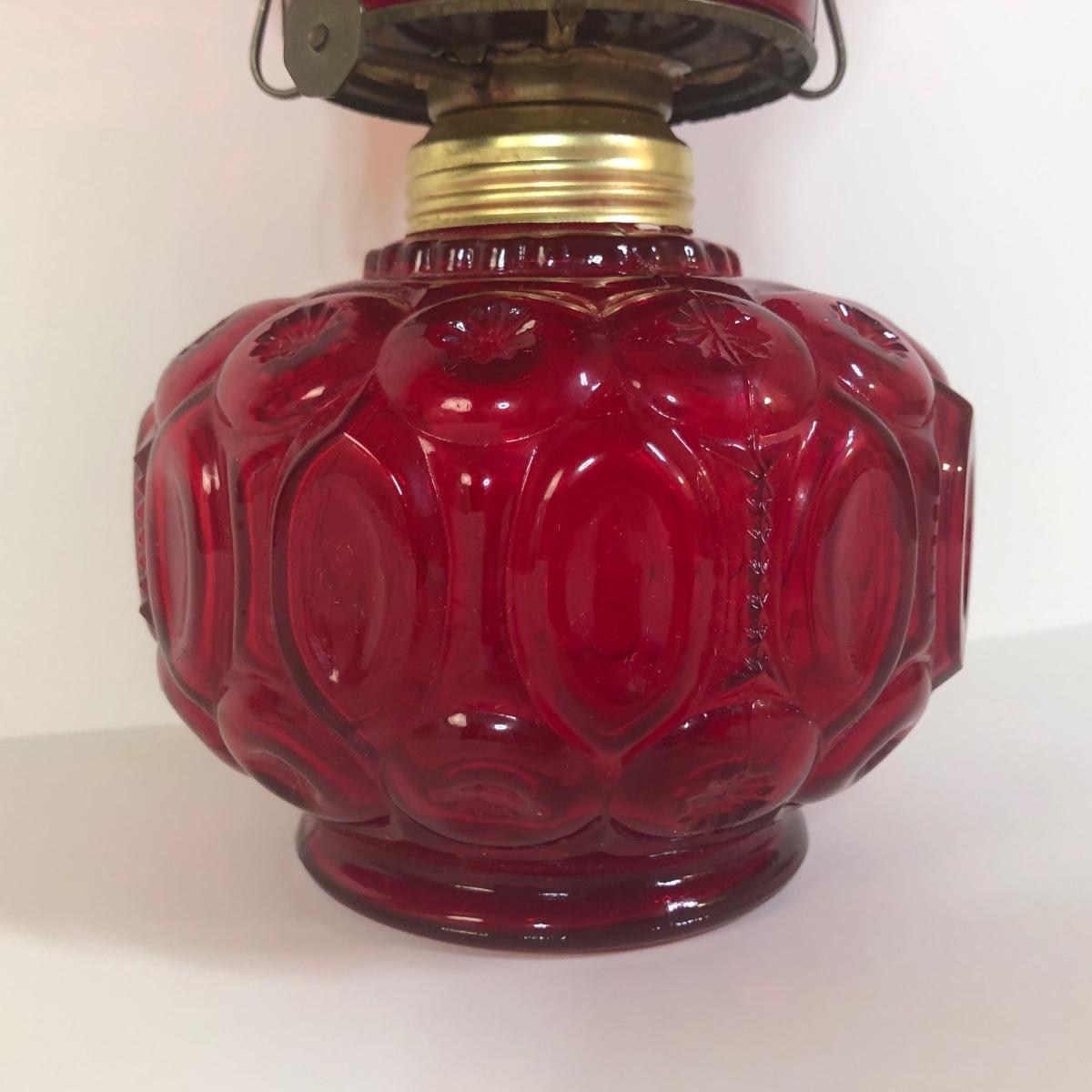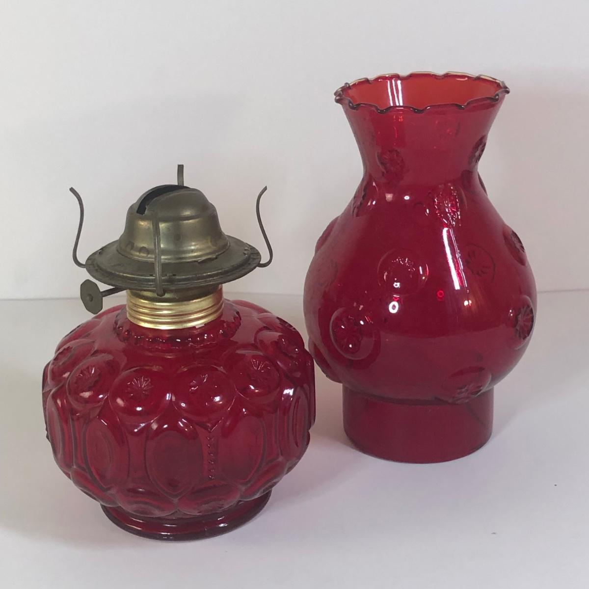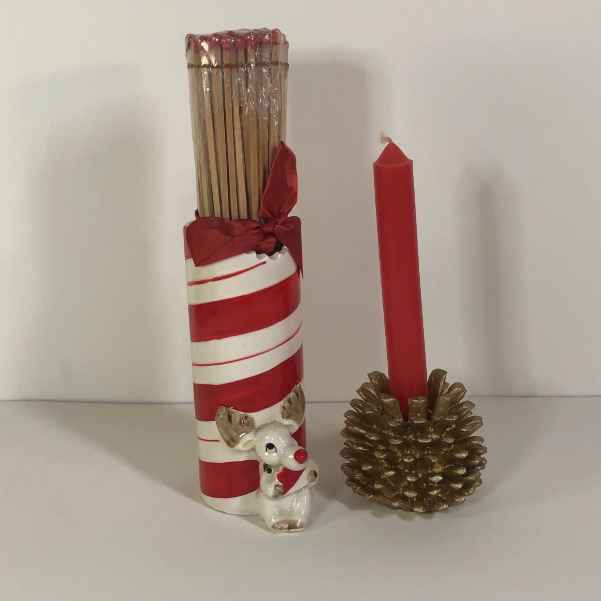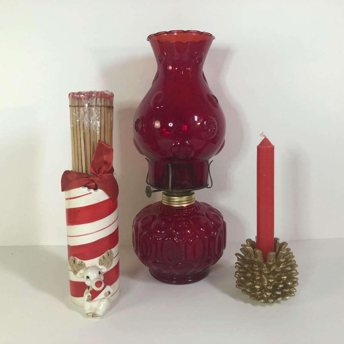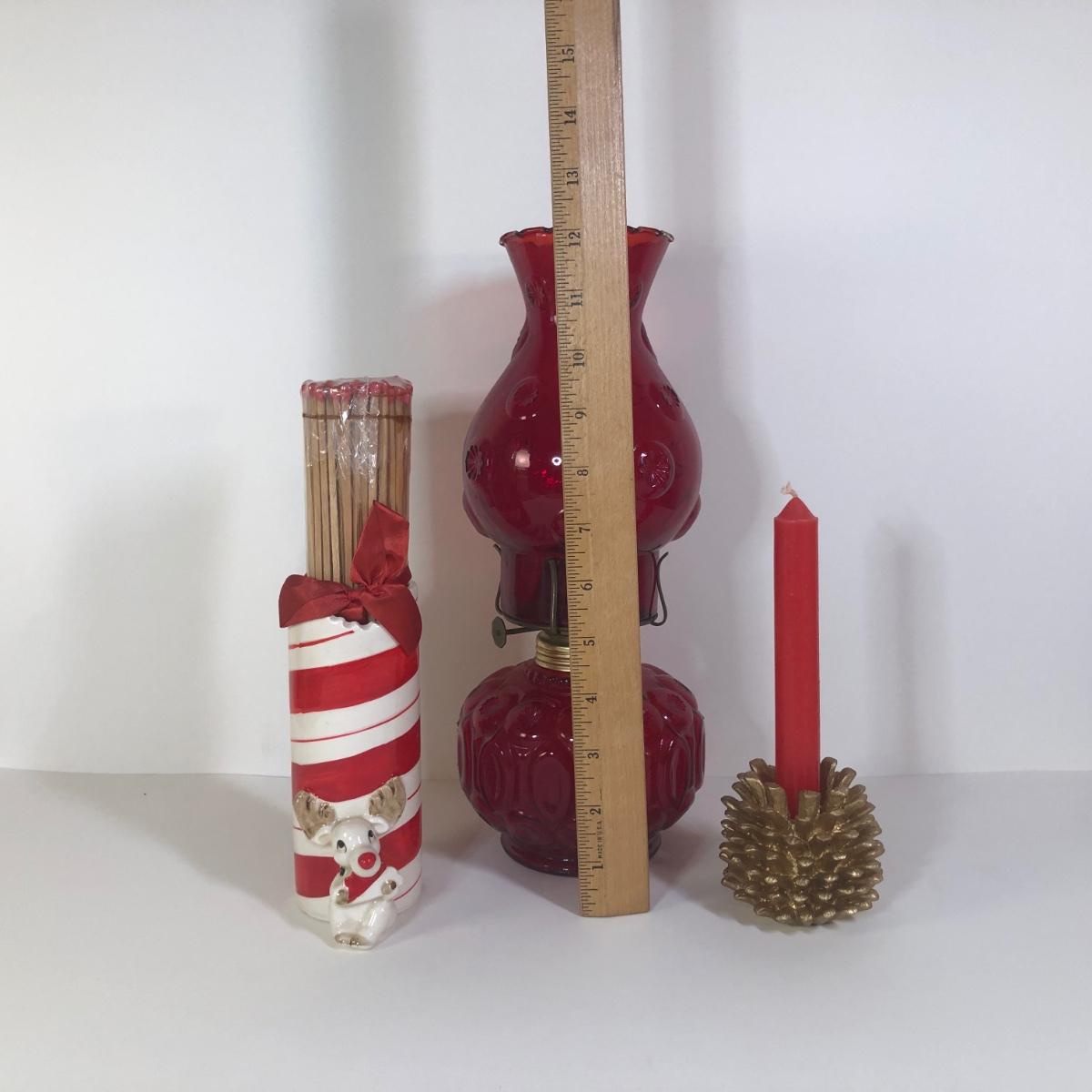 LOT 369M: Vintage Ruby Red Glass Moon & Stars Oil Lamp, Fitz & Floyd Reindeer Candle Holder, Pinecone Candle Holder & Long Matches