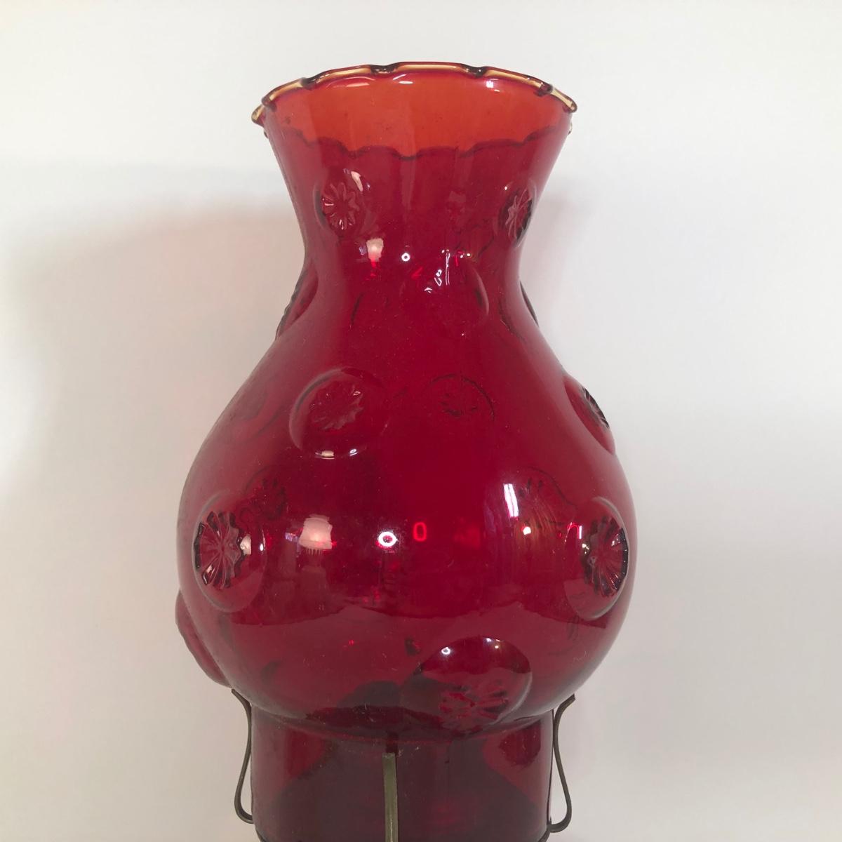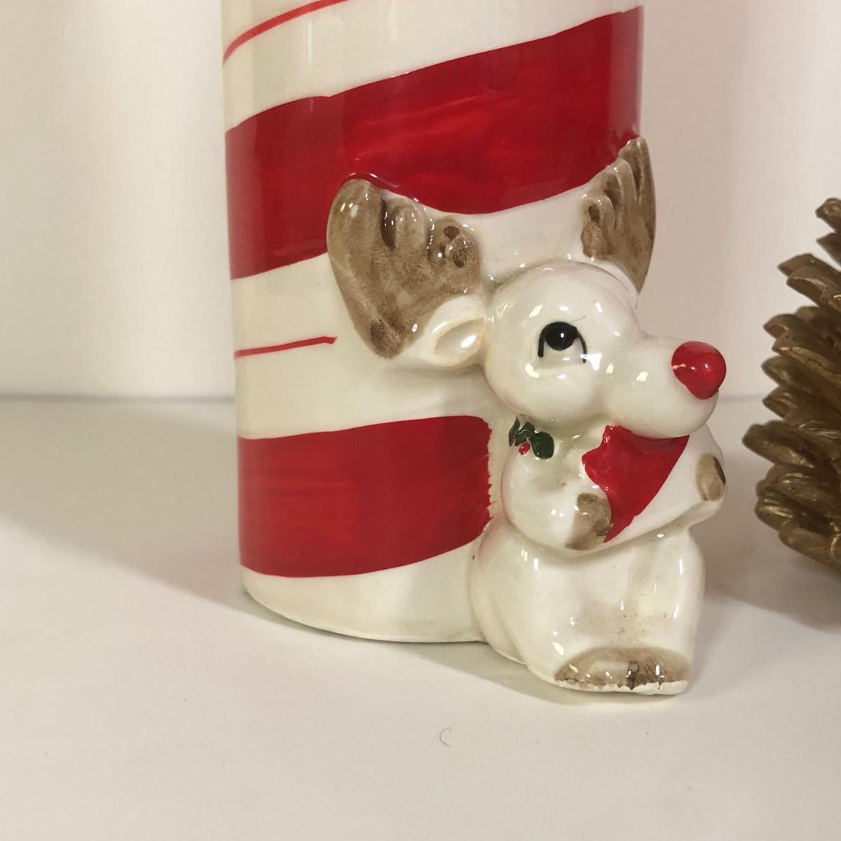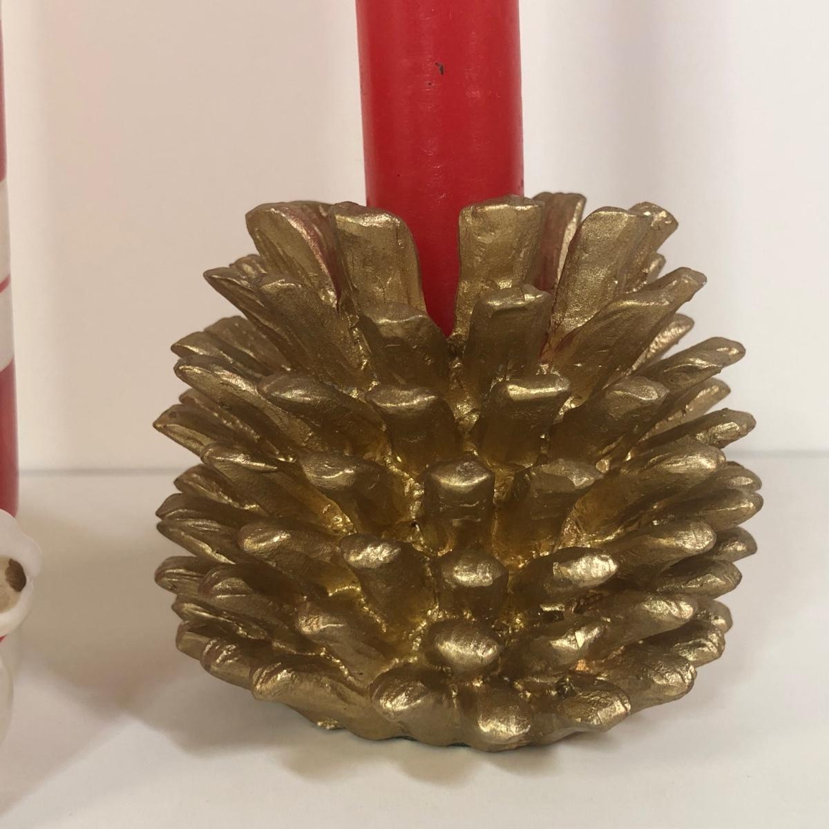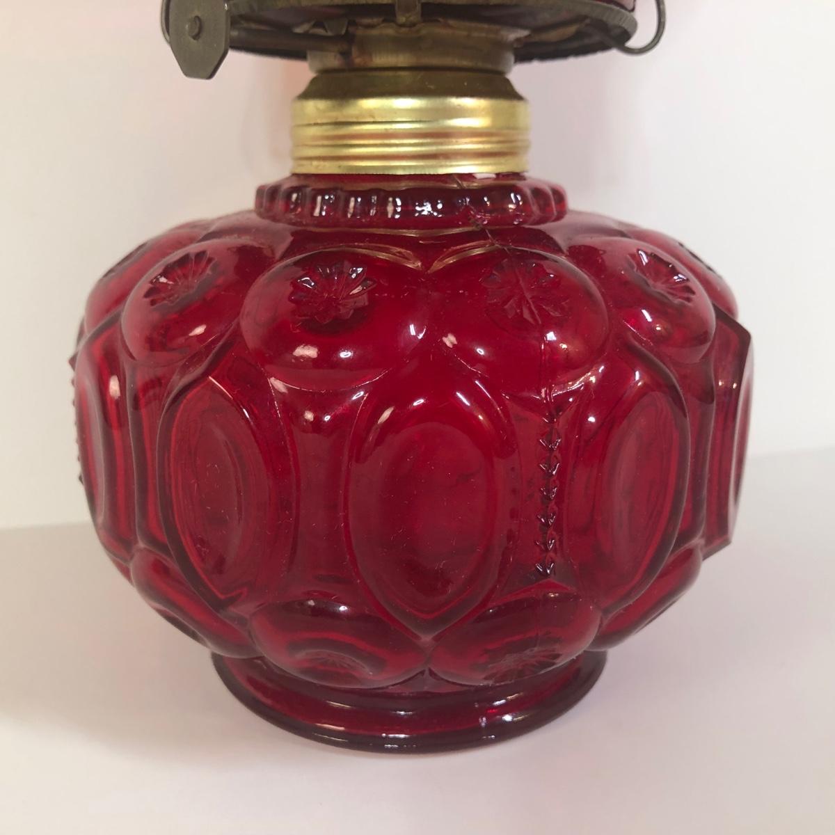 LOT 369M: Vintage Ruby Red Glass Moon & Stars Oil Lamp, Fitz & Floyd Reindeer Candle Holder, Pinecone Candle Holder & Long Matches