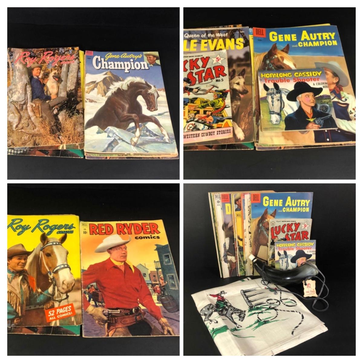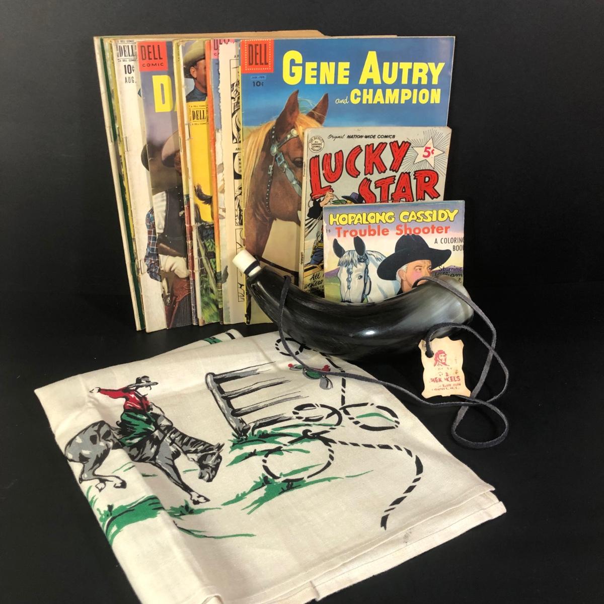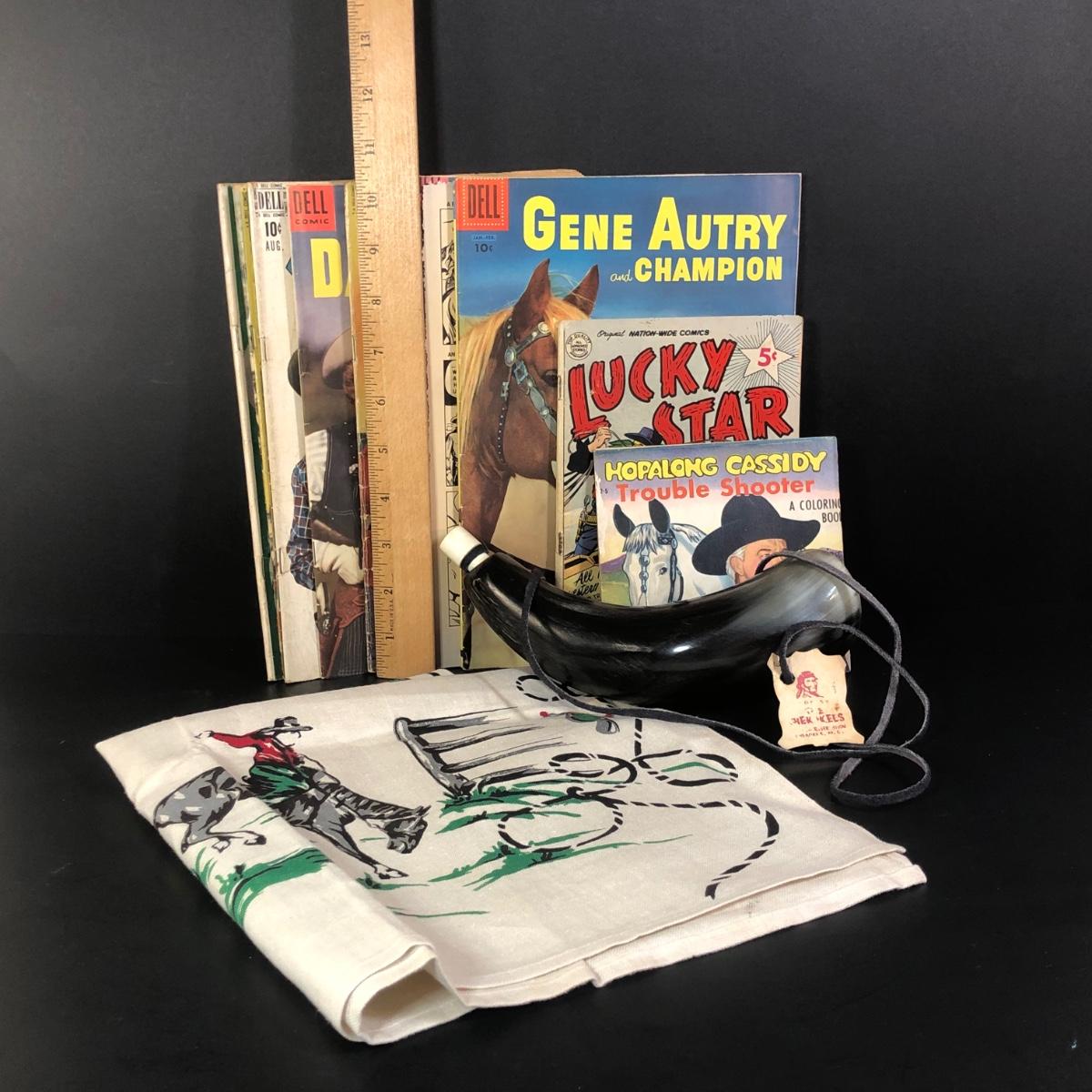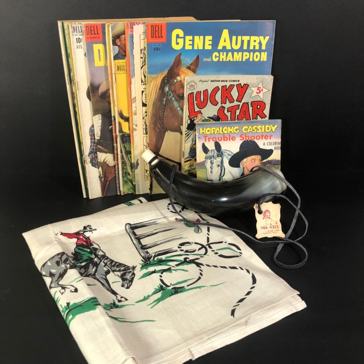 LOT 373M: Vintage Gene Autry Comics, Cowboy Handkerchief, Horn & More