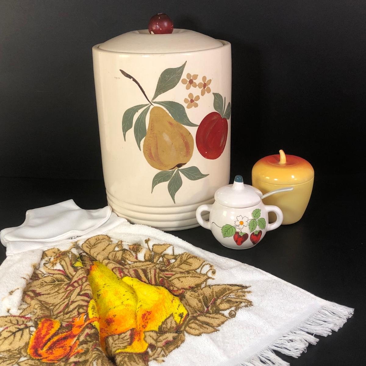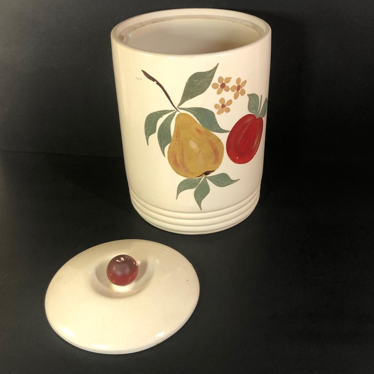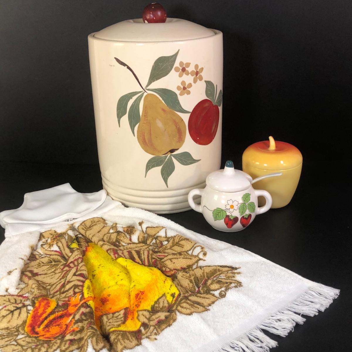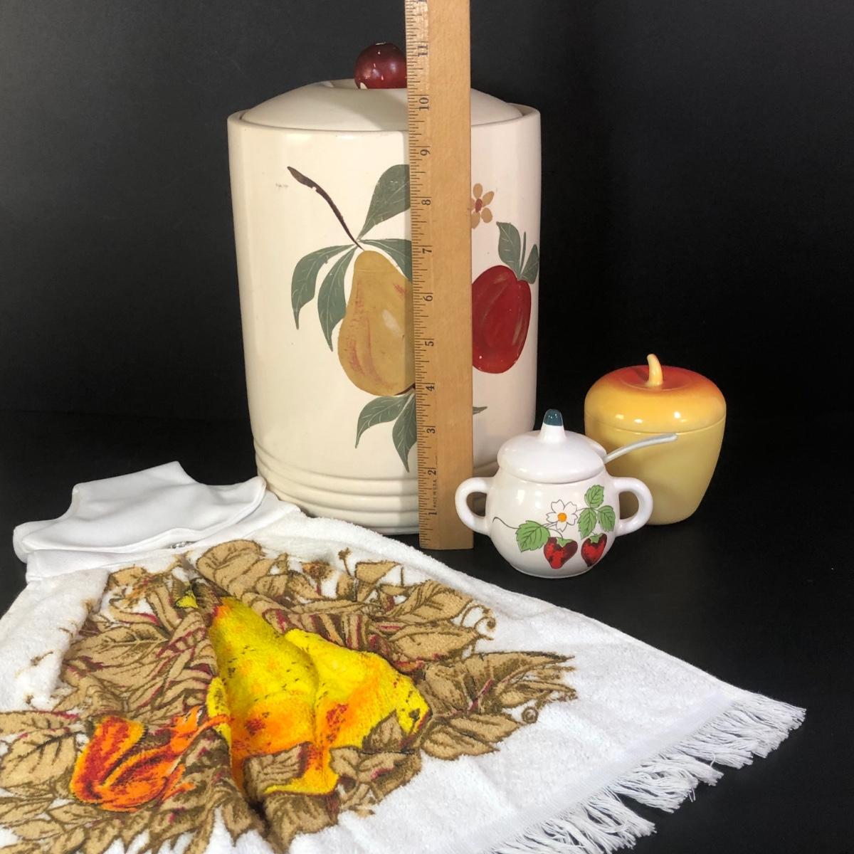 LOT 374M: Fruit Collection - Large Pottery Cookie Jar, Apple Jar & Sugar Bowl w/ Spoon