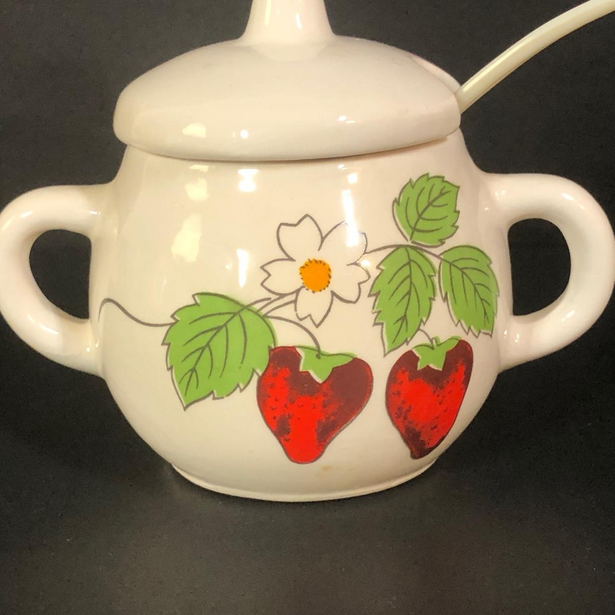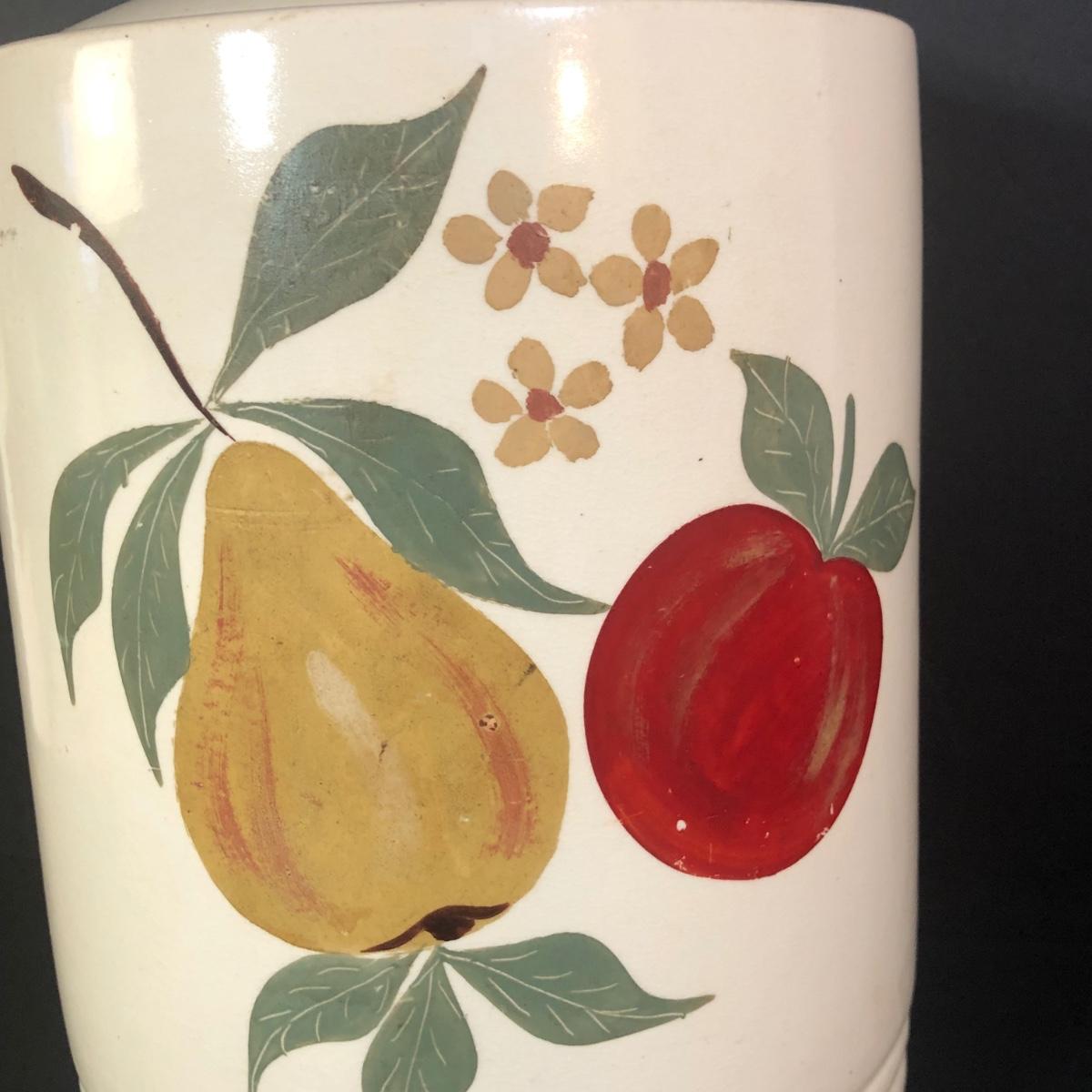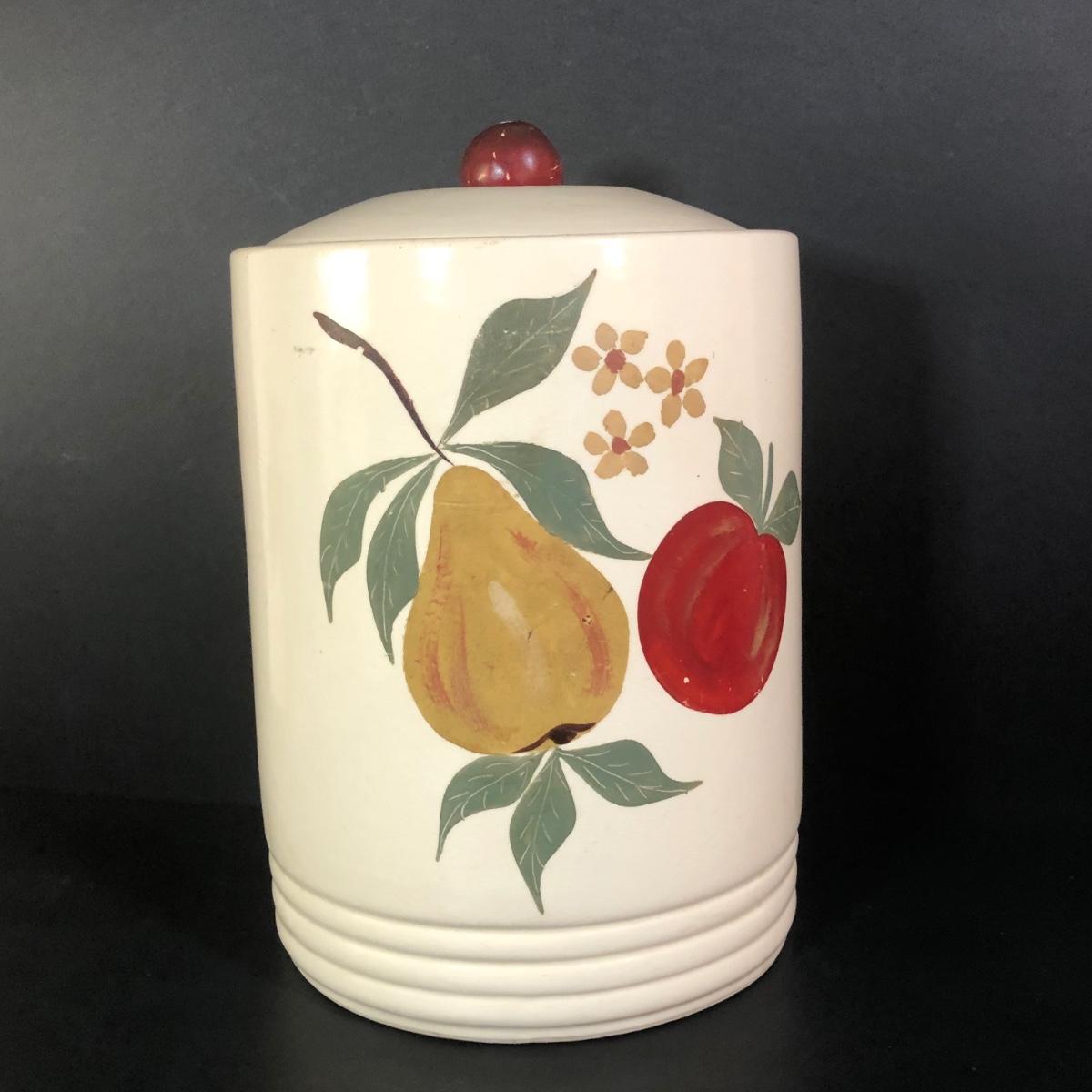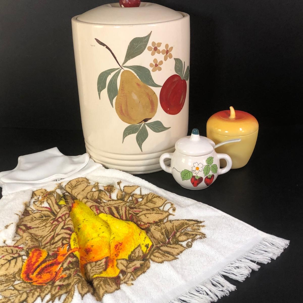 LOT 374M: Fruit Collection - Large Pottery Cookie Jar, Apple Jar & Sugar Bowl w/ Spoon