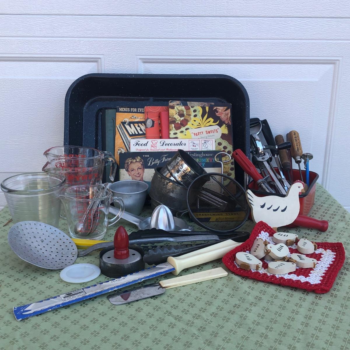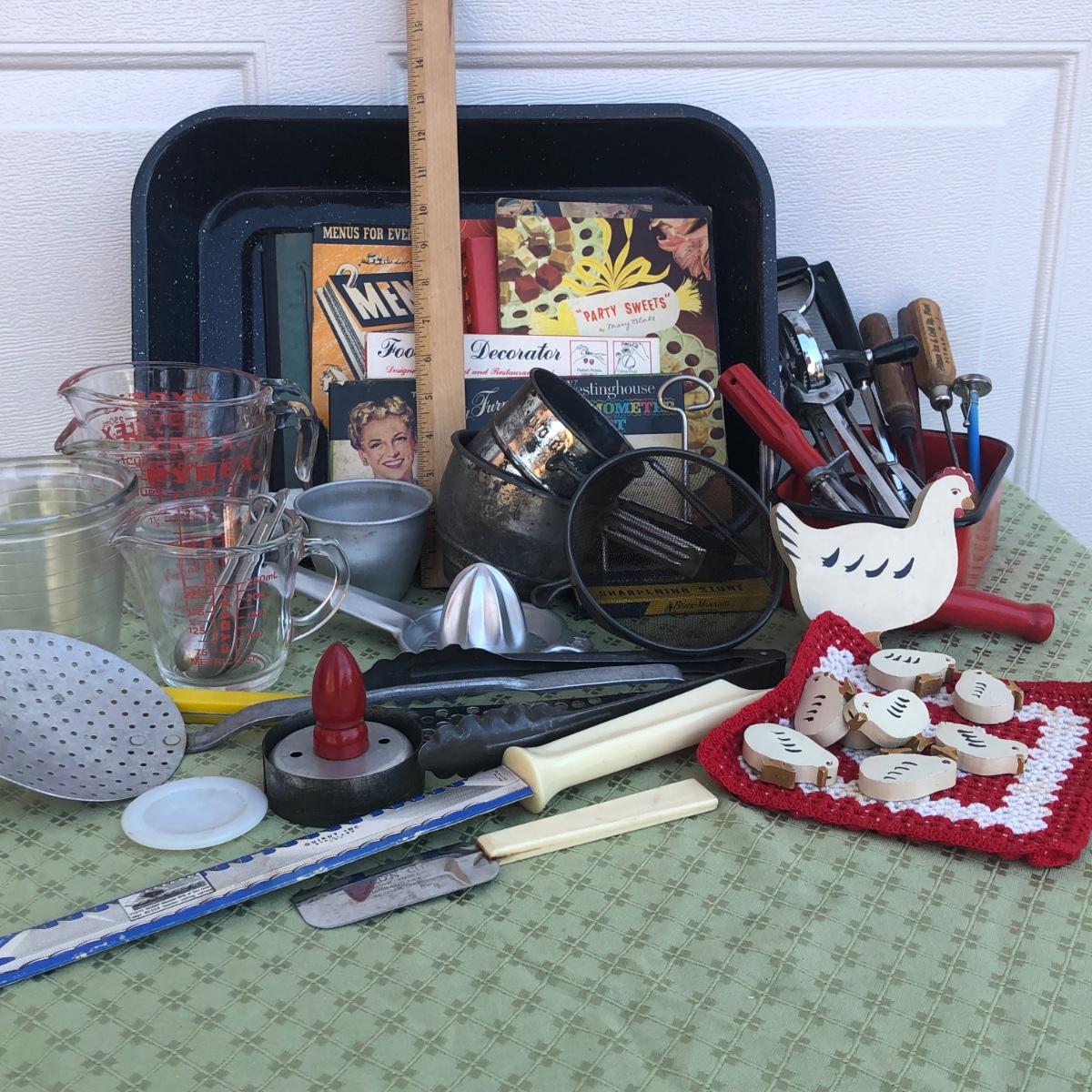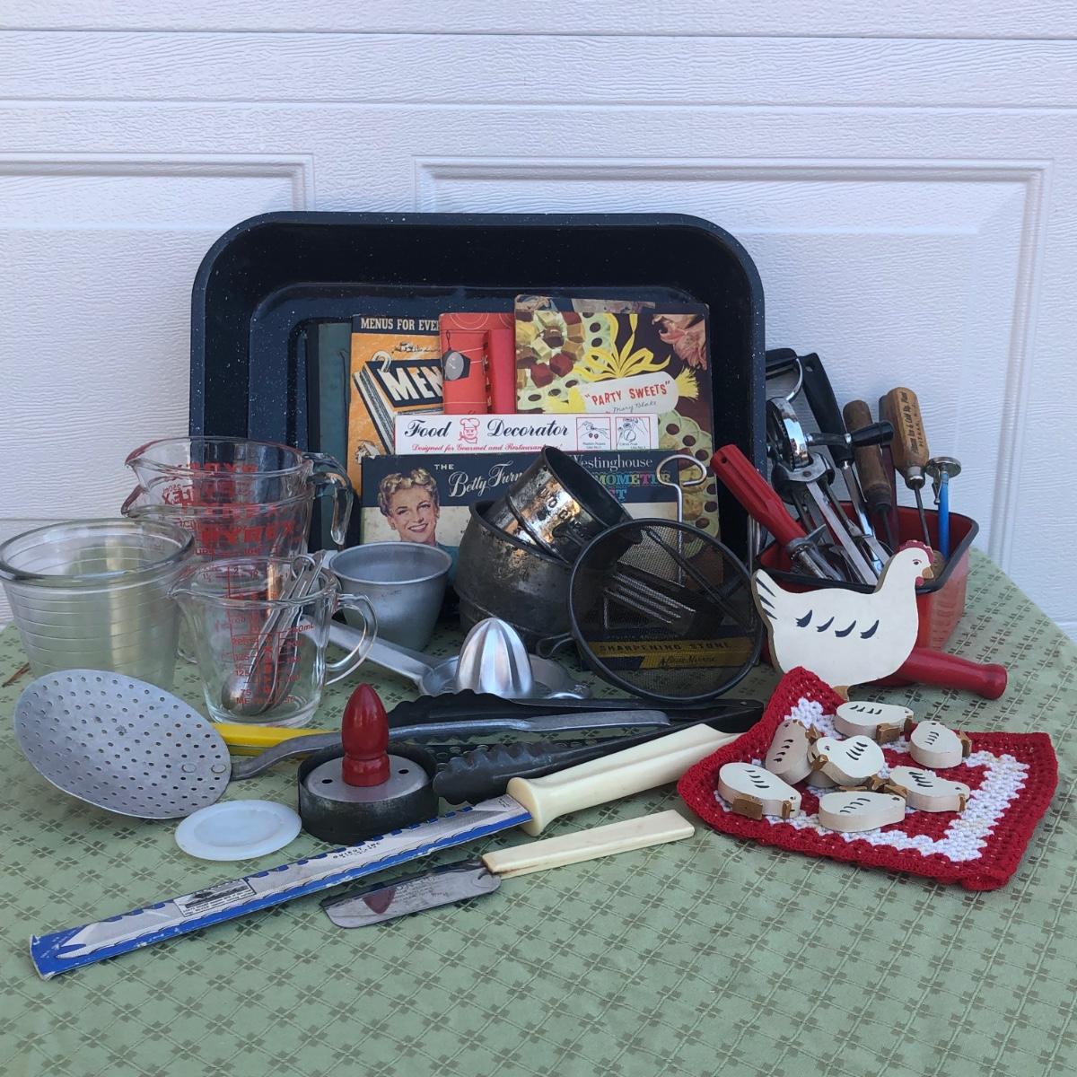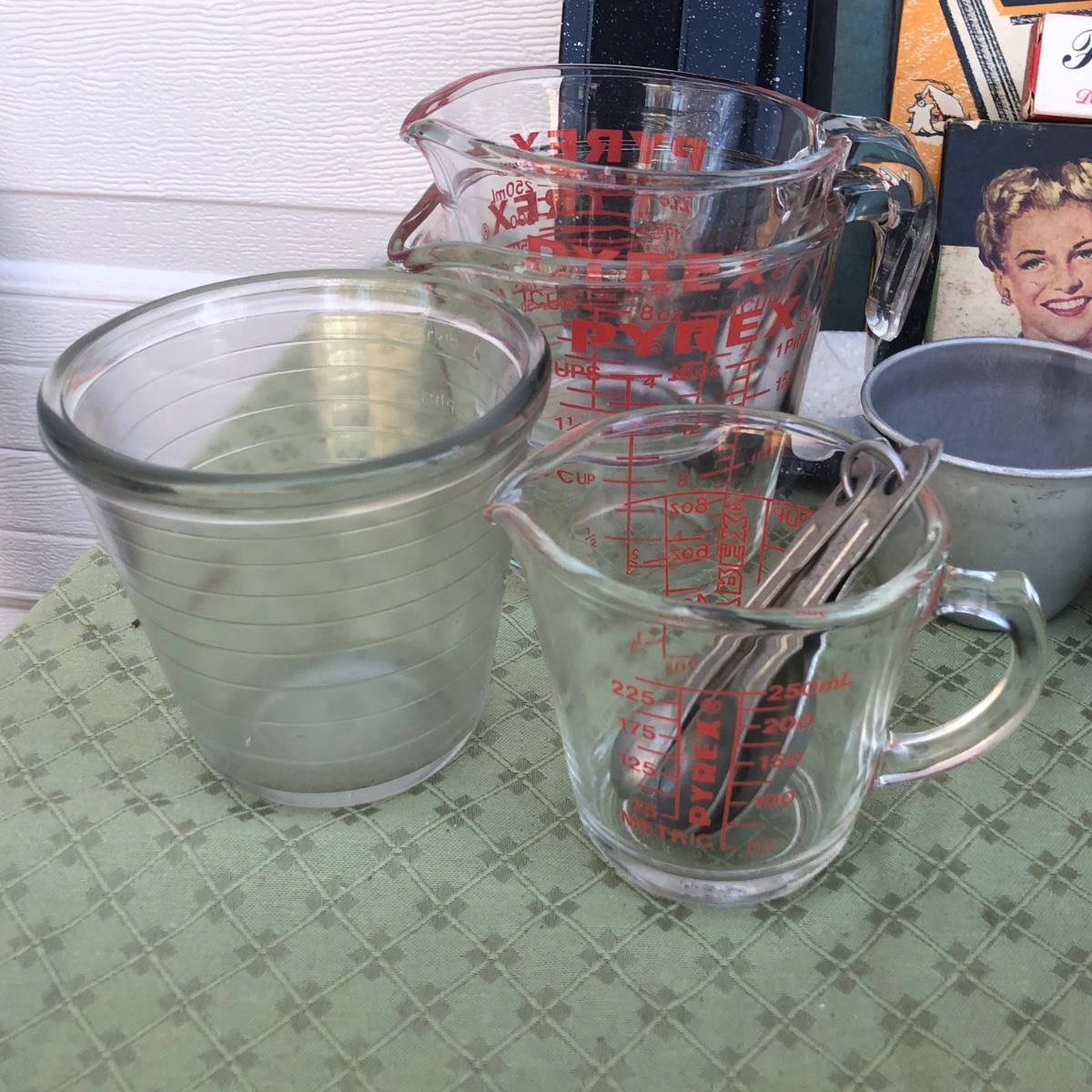LOT 377M: Vintage Kitchen Collection incl. Pyrex Measuring Cups, Sifters, Large Enamel Pan & More