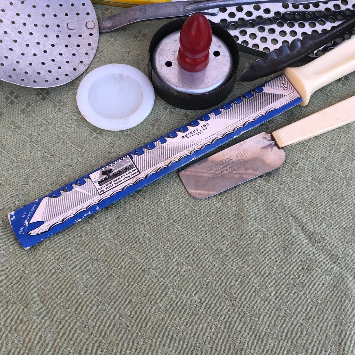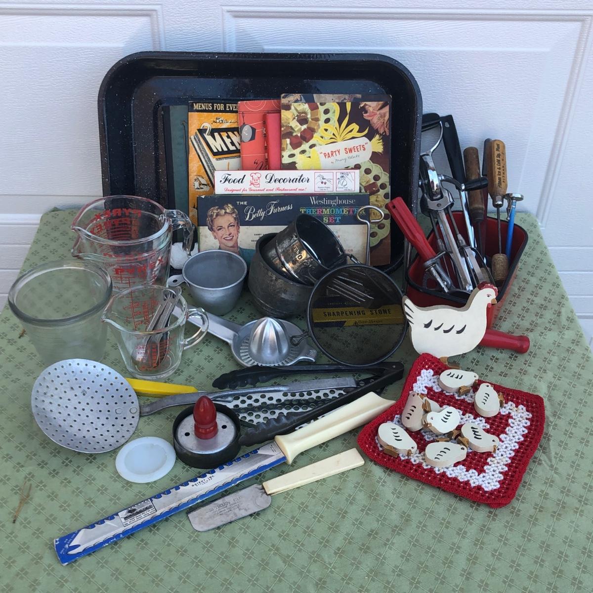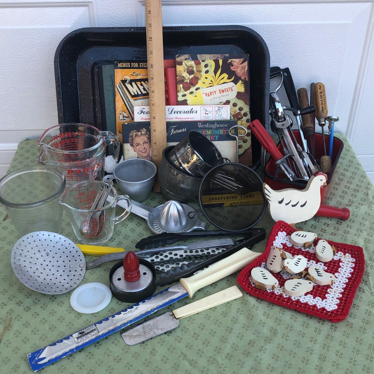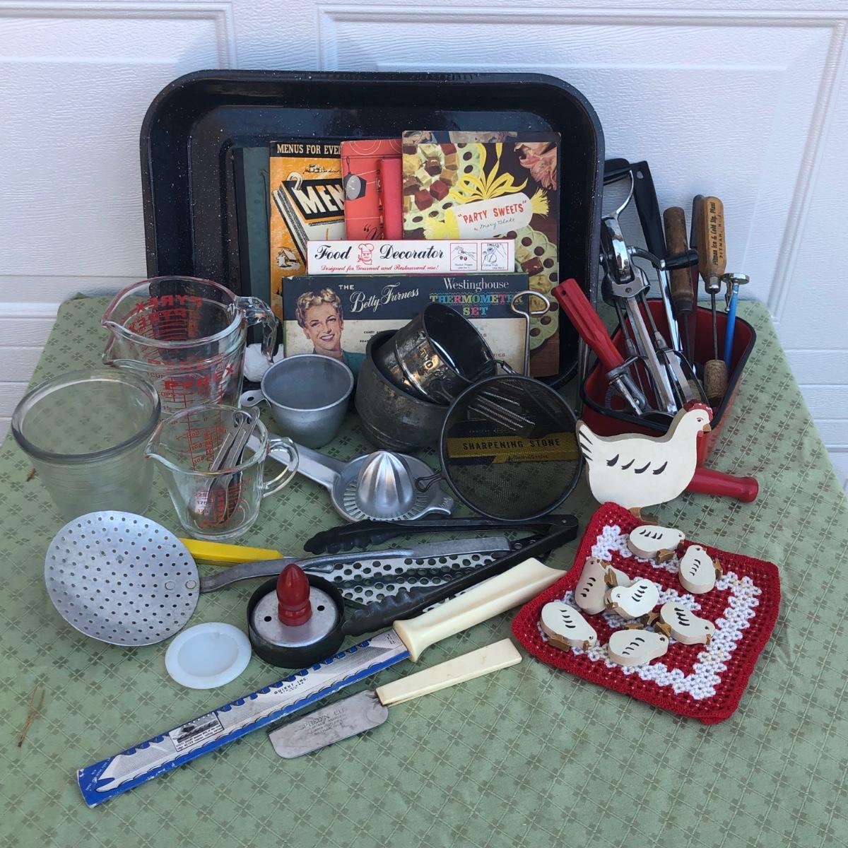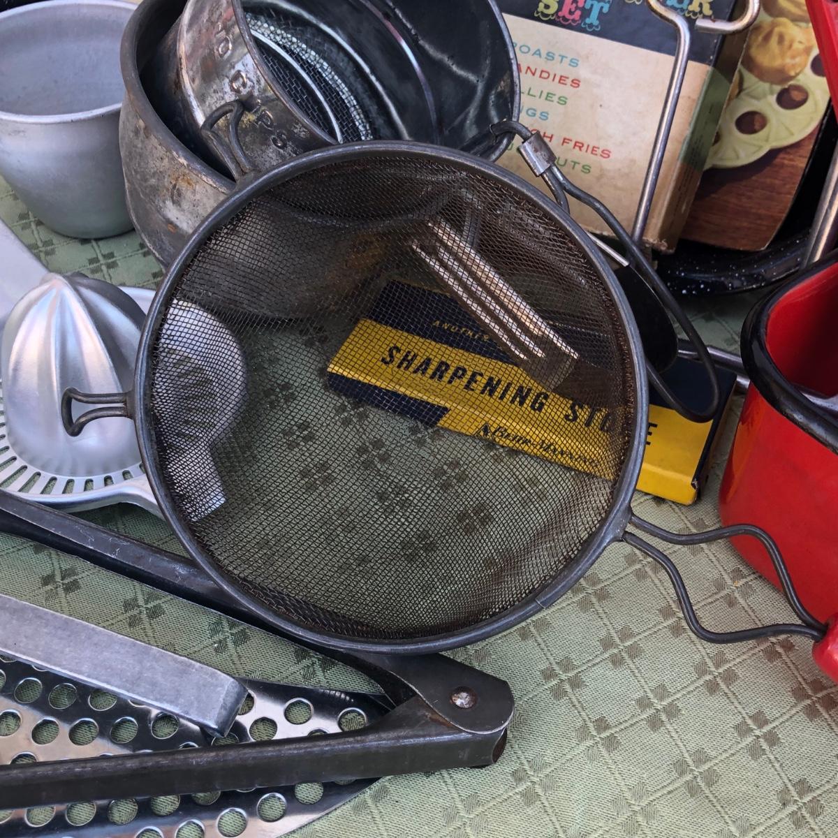 LOT 377M: Vintage Kitchen Collection incl. Pyrex Measuring Cups, Sifters, Large Enamel Pan & More