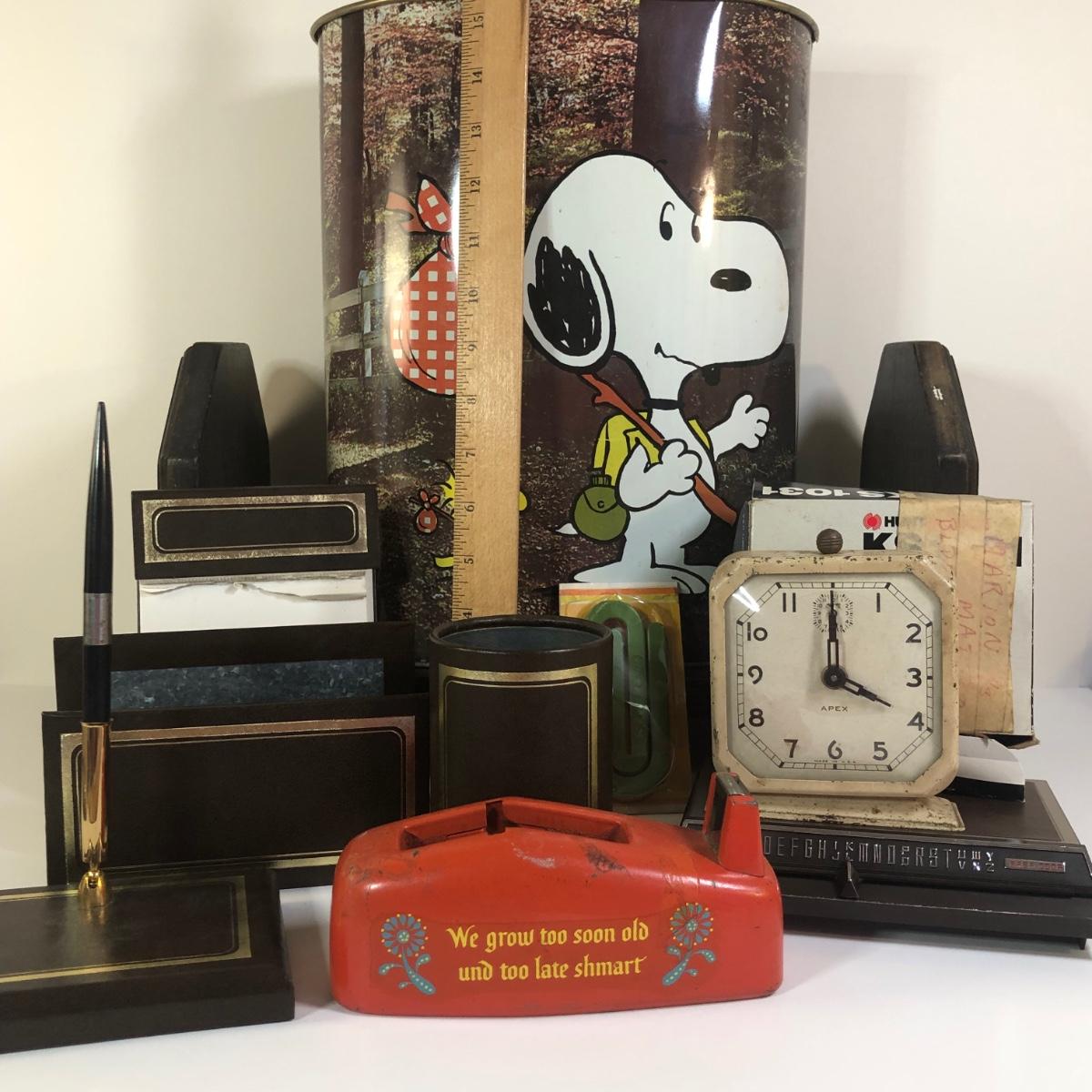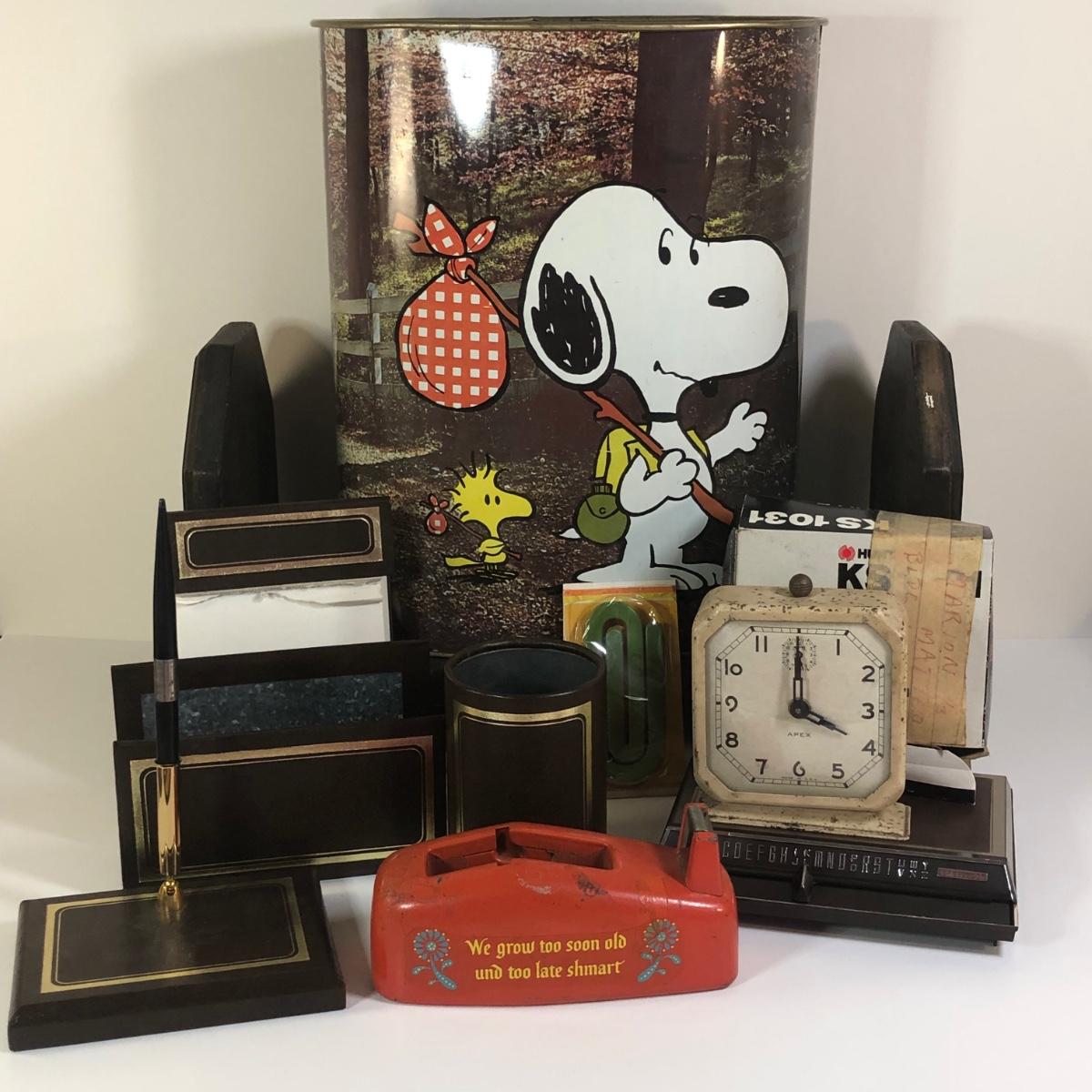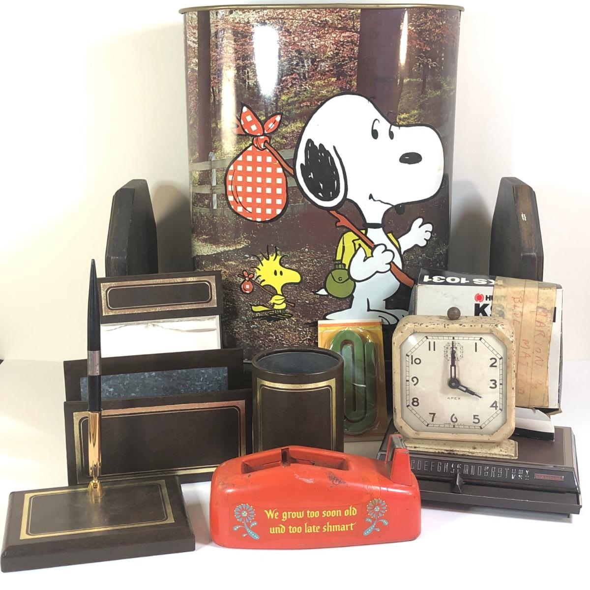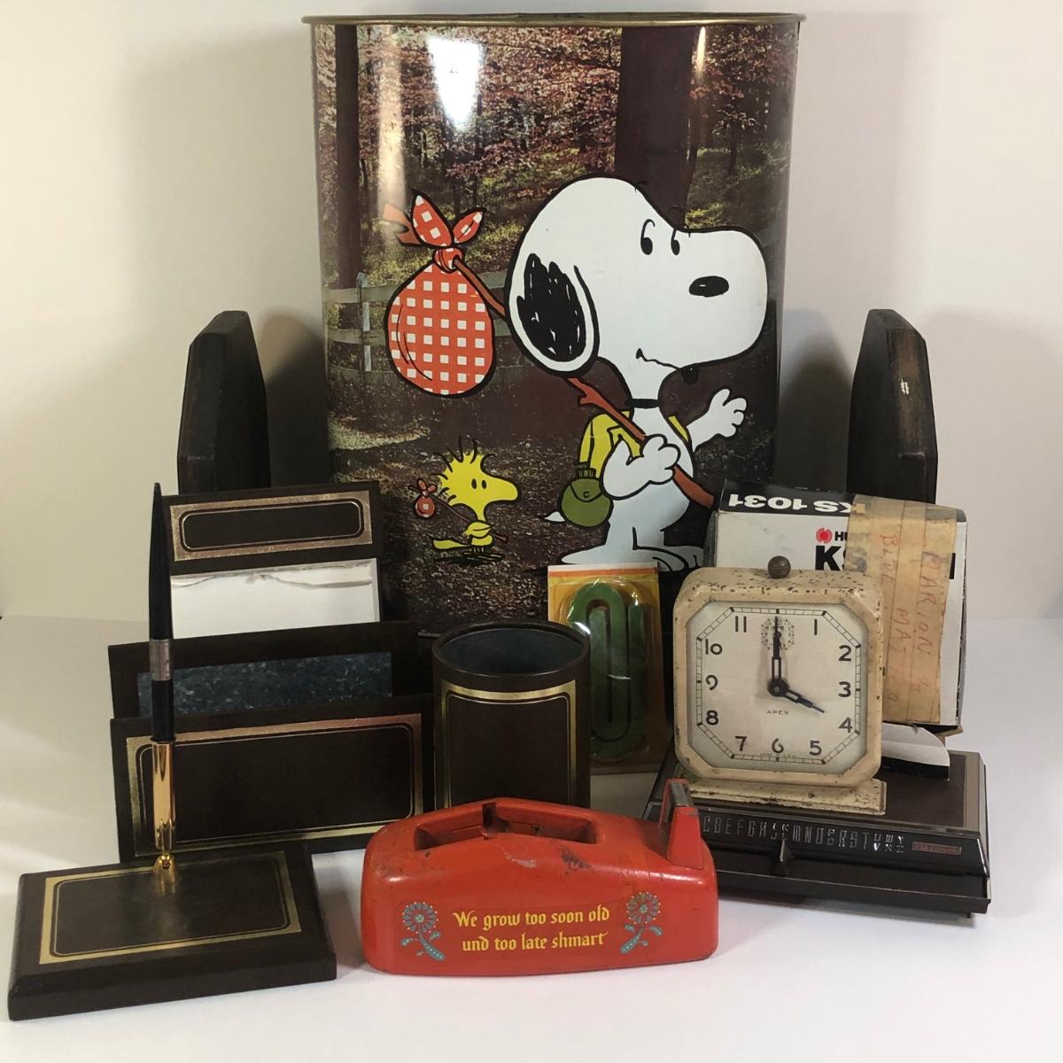 LOT 379M: Vintage Office Collection - Snoopy Waste Bin, Wooden Book Rack, Apex Clock, C.R. Gibson Desk Set, Mounted Pencil Sharpener & More