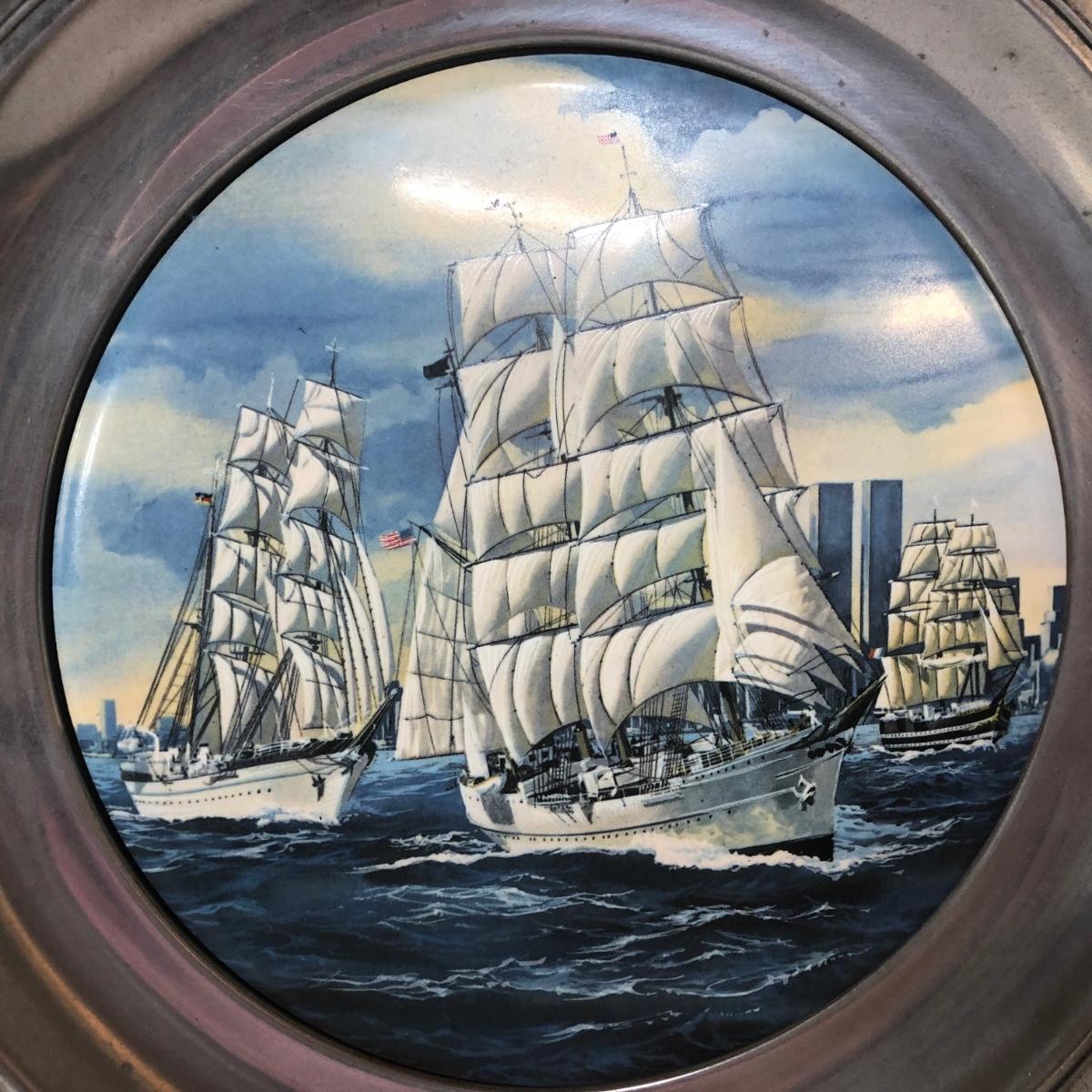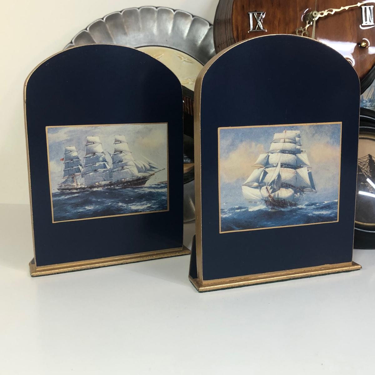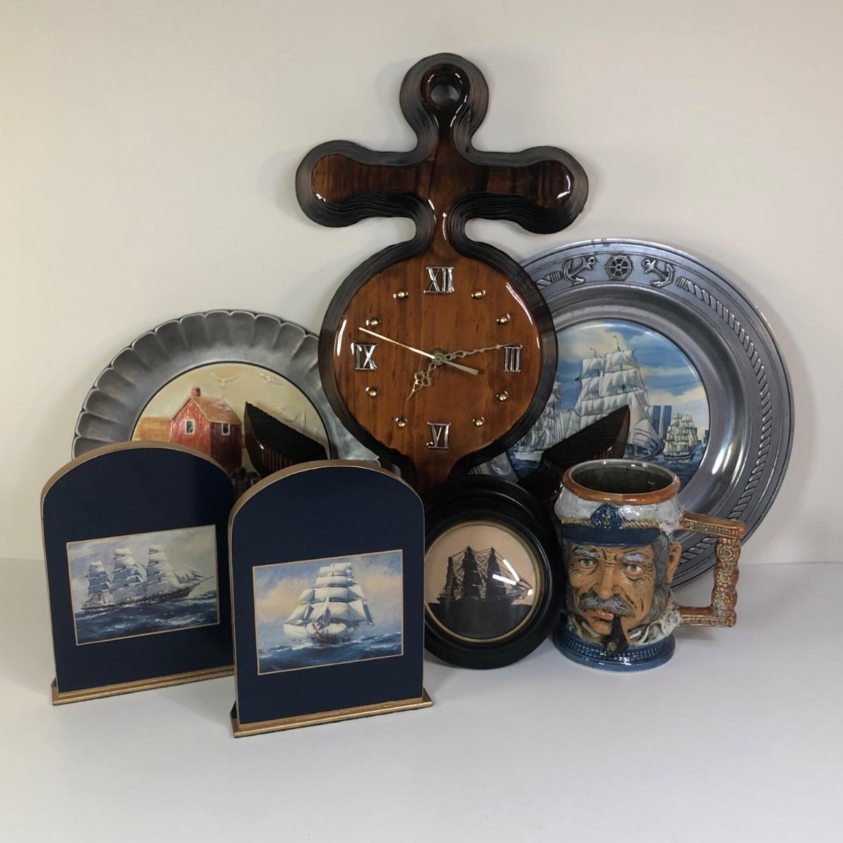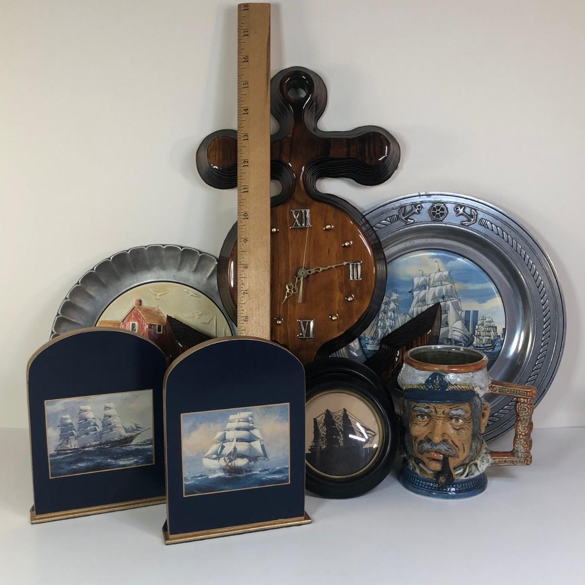 LOT 386M: Nautical Collection - Large Wooden Anchor Clock, 1978 Motif #1 Plate (7522/10000), 1970 Hand Painted Italian Sailor Mug, Lady Clare Bookends & American Racing Clipper Silhouettes