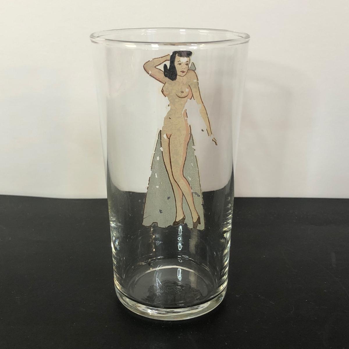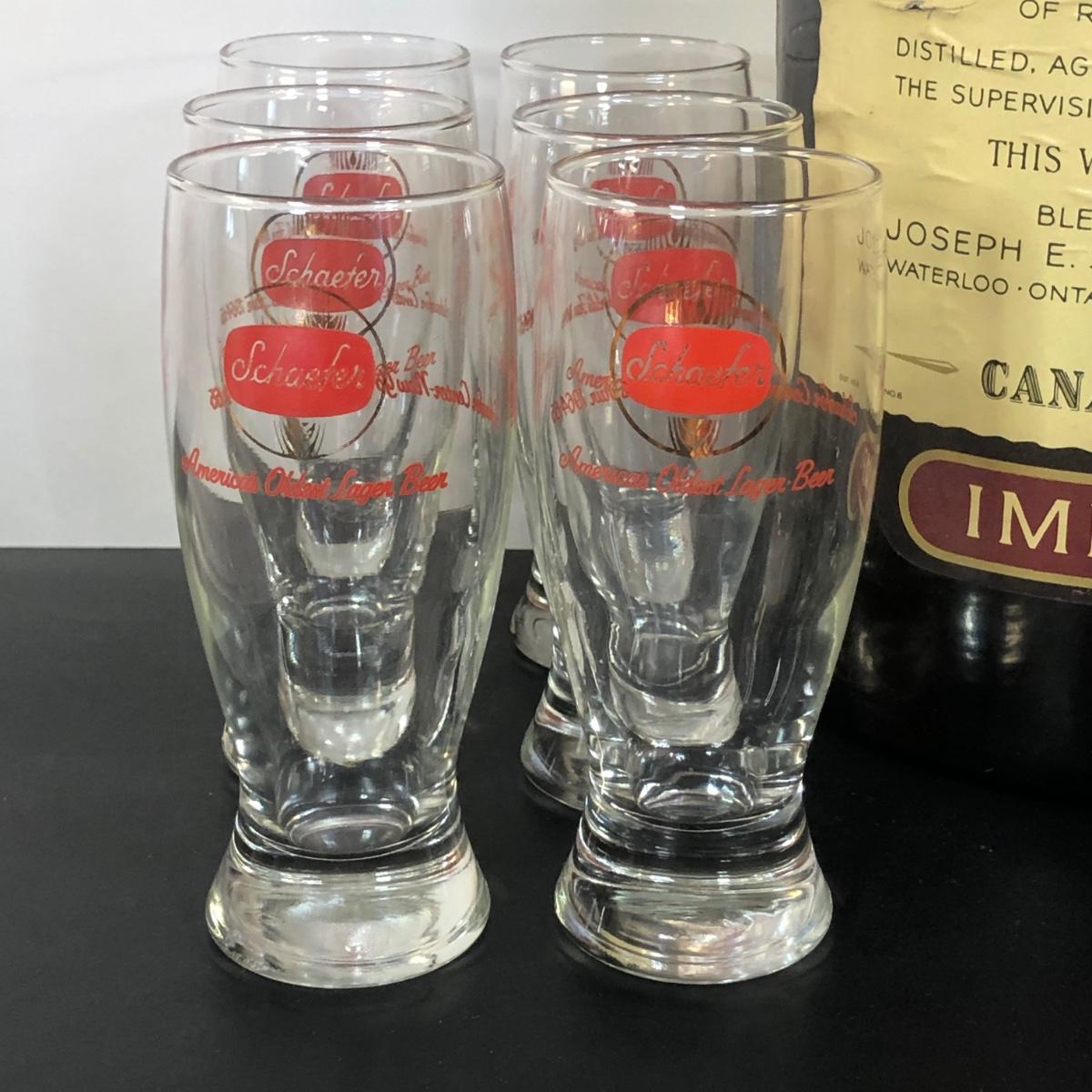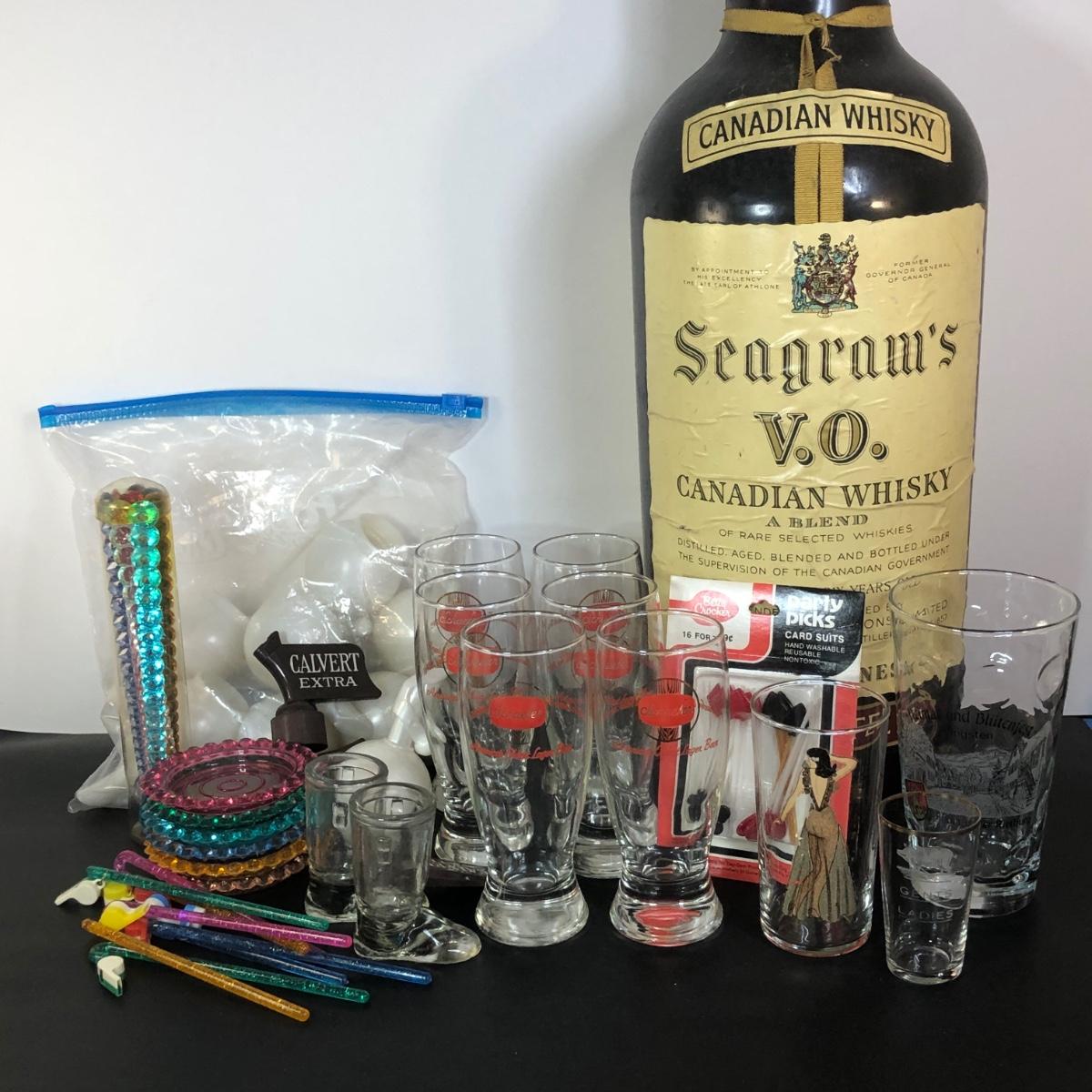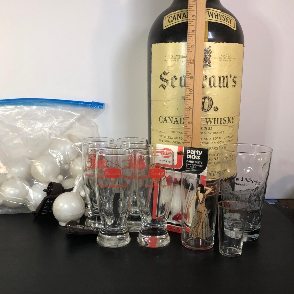 LOT 392M: Vintage Bar - 1964-1965 NY World's Fair Schaefer Beer Glasses (6), Antique Pre-Prohibition Acid Etched Whiskey Shot Glass, Extra Large Plastic Seagrams Bottle, Nude Lady Reveal Glass & More