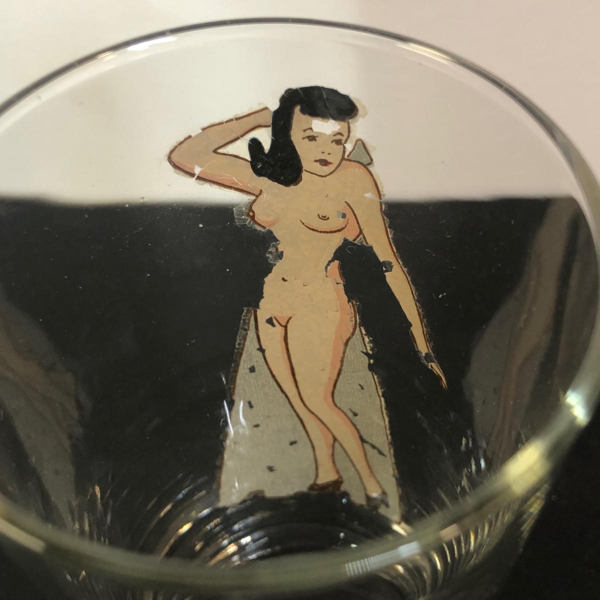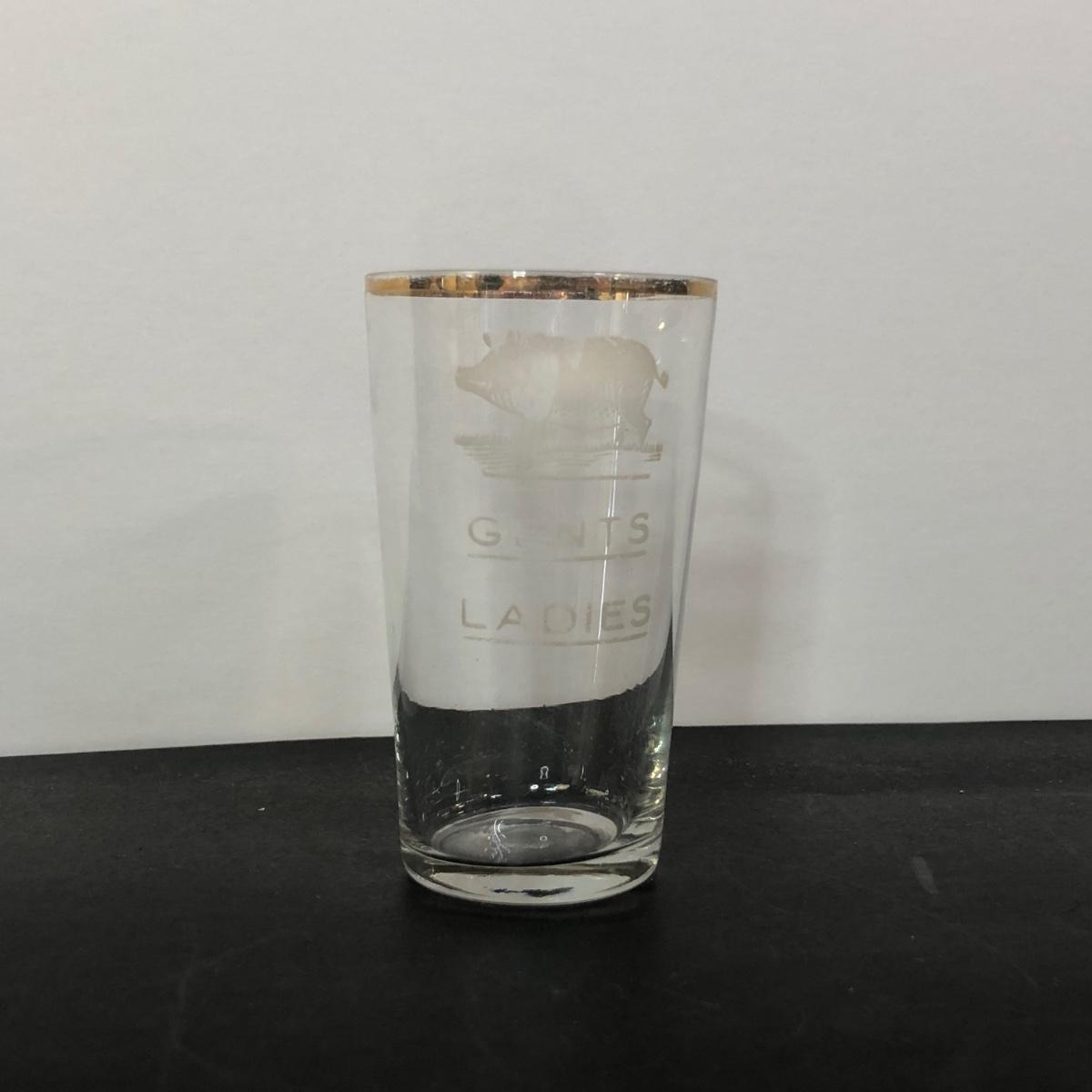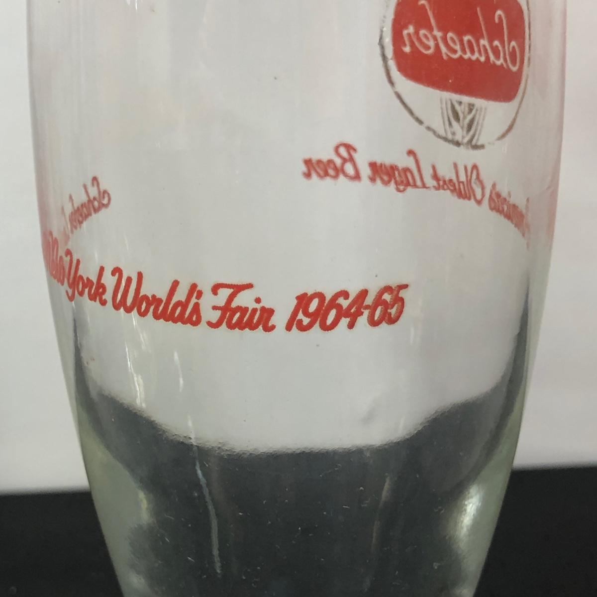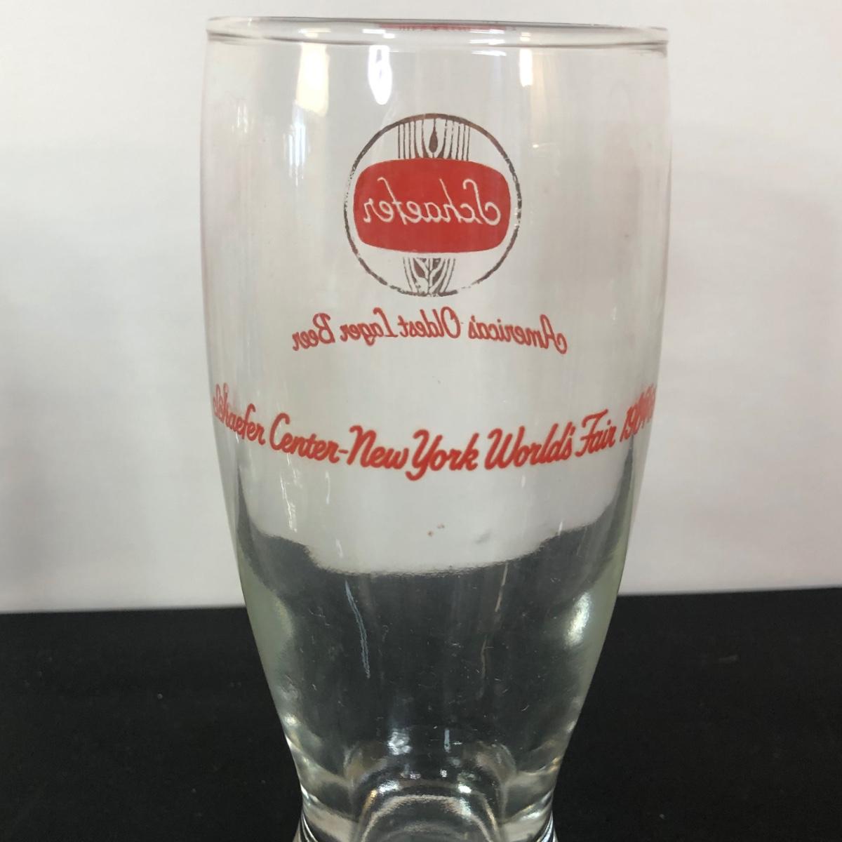 LOT 392M: Vintage Bar - 1964-1965 NY World's Fair Schaefer Beer Glasses (6), Antique Pre-Prohibition Acid Etched Whiskey Shot Glass, Extra Large Plastic Seagrams Bottle, Nude Lady Reveal Glass & More