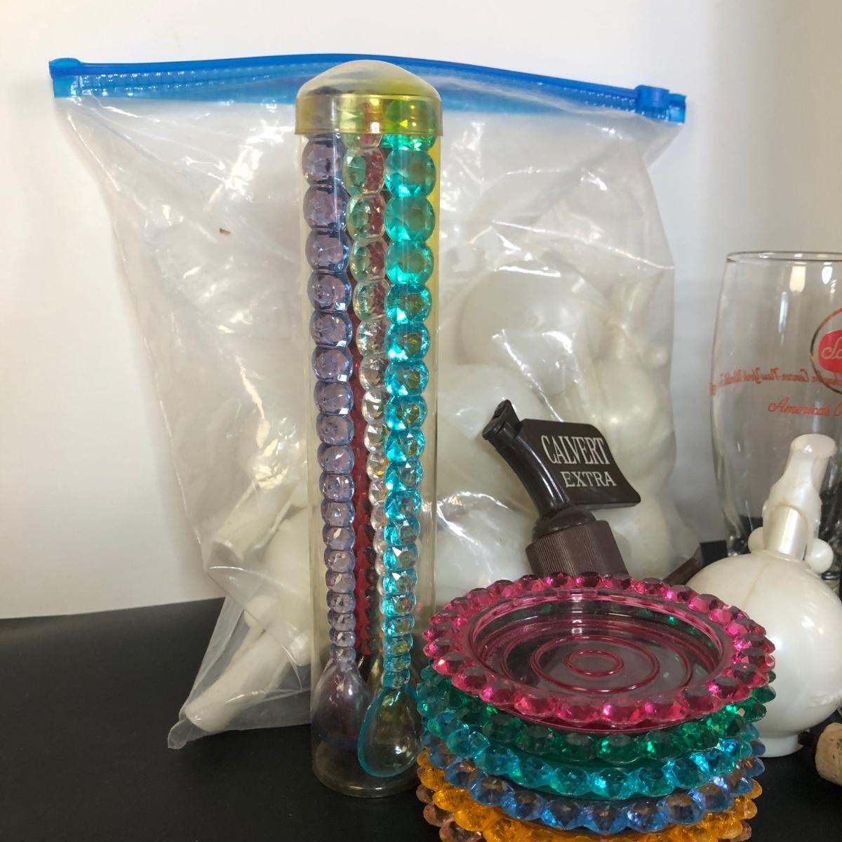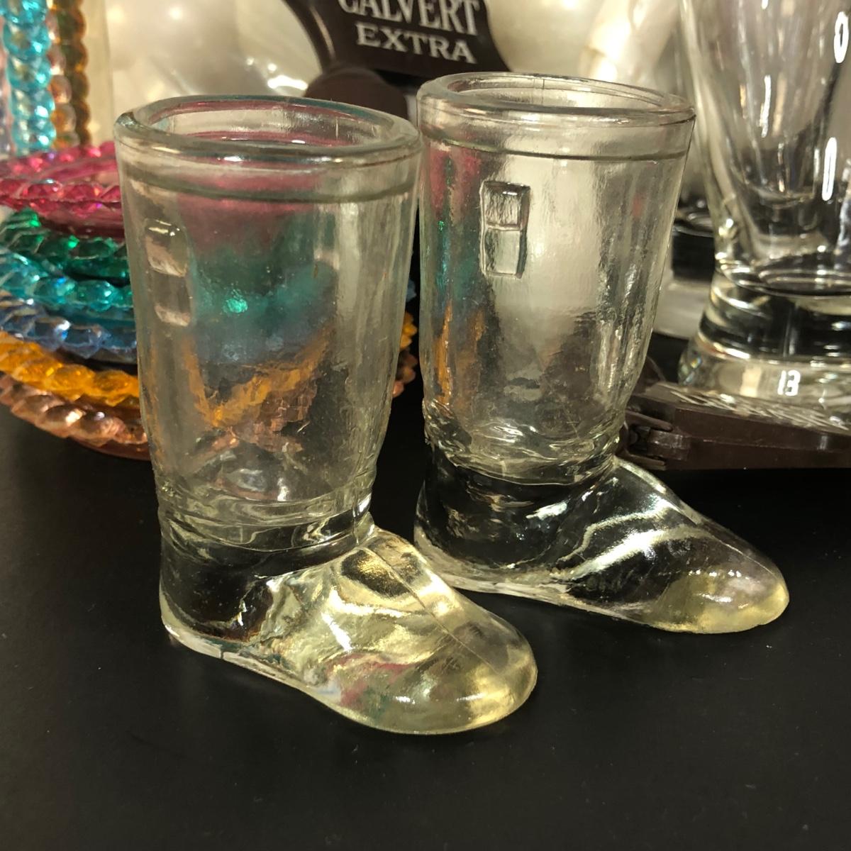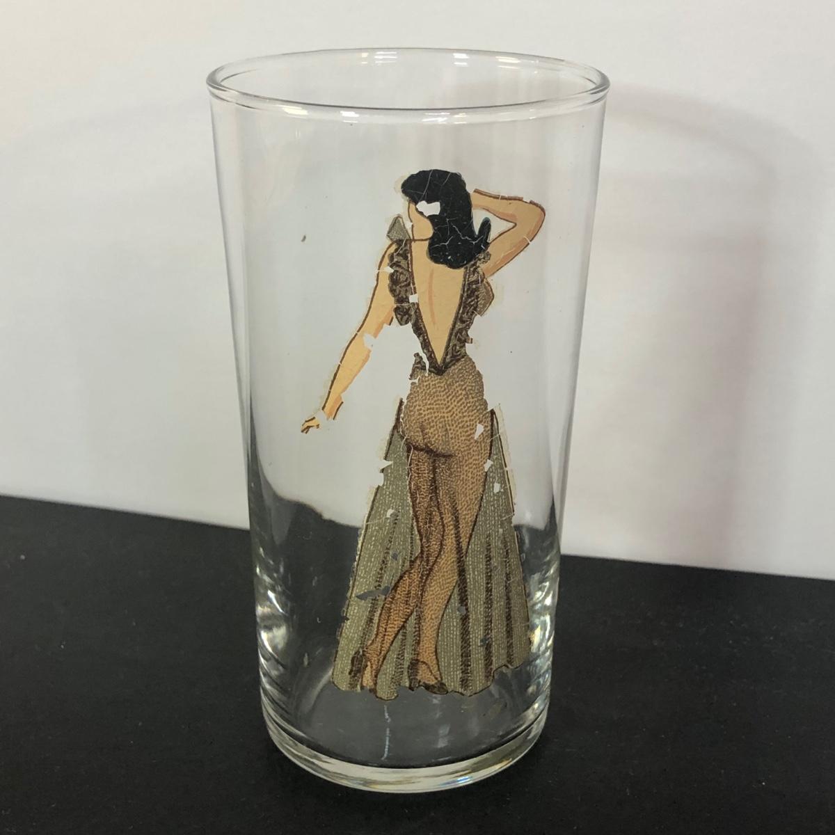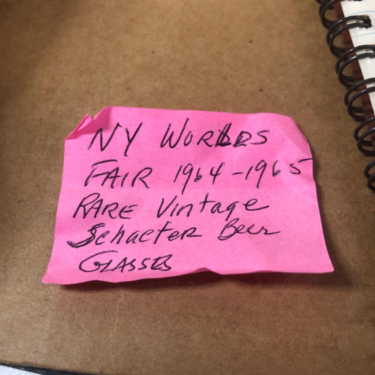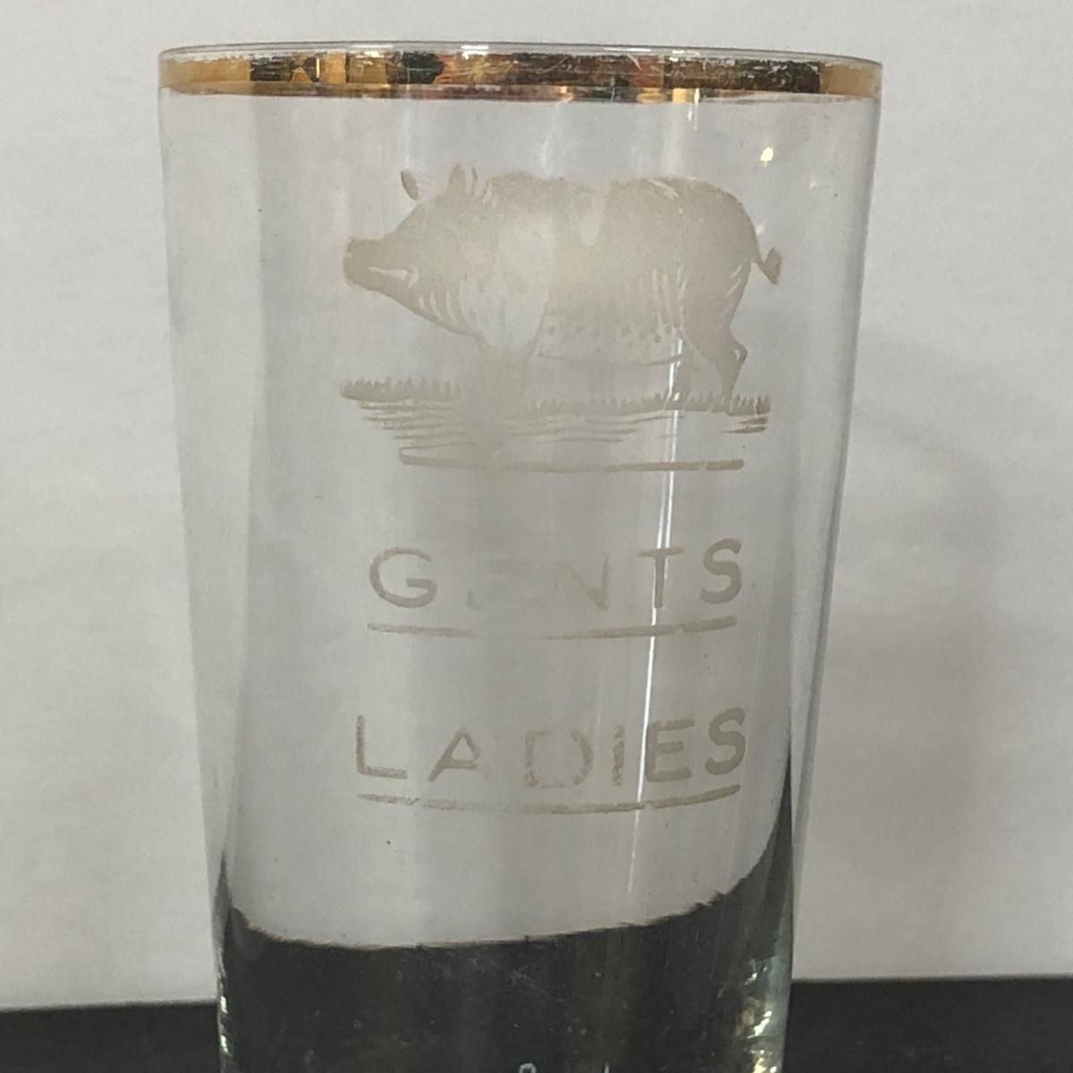 LOT 392M: Vintage Bar - 1964-1965 NY World's Fair Schaefer Beer Glasses (6), Antique Pre-Prohibition Acid Etched Whiskey Shot Glass, Extra Large Plastic Seagrams Bottle, Nude Lady Reveal Glass & More