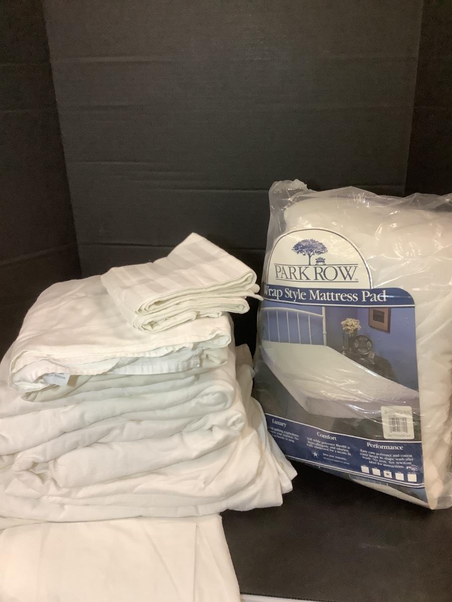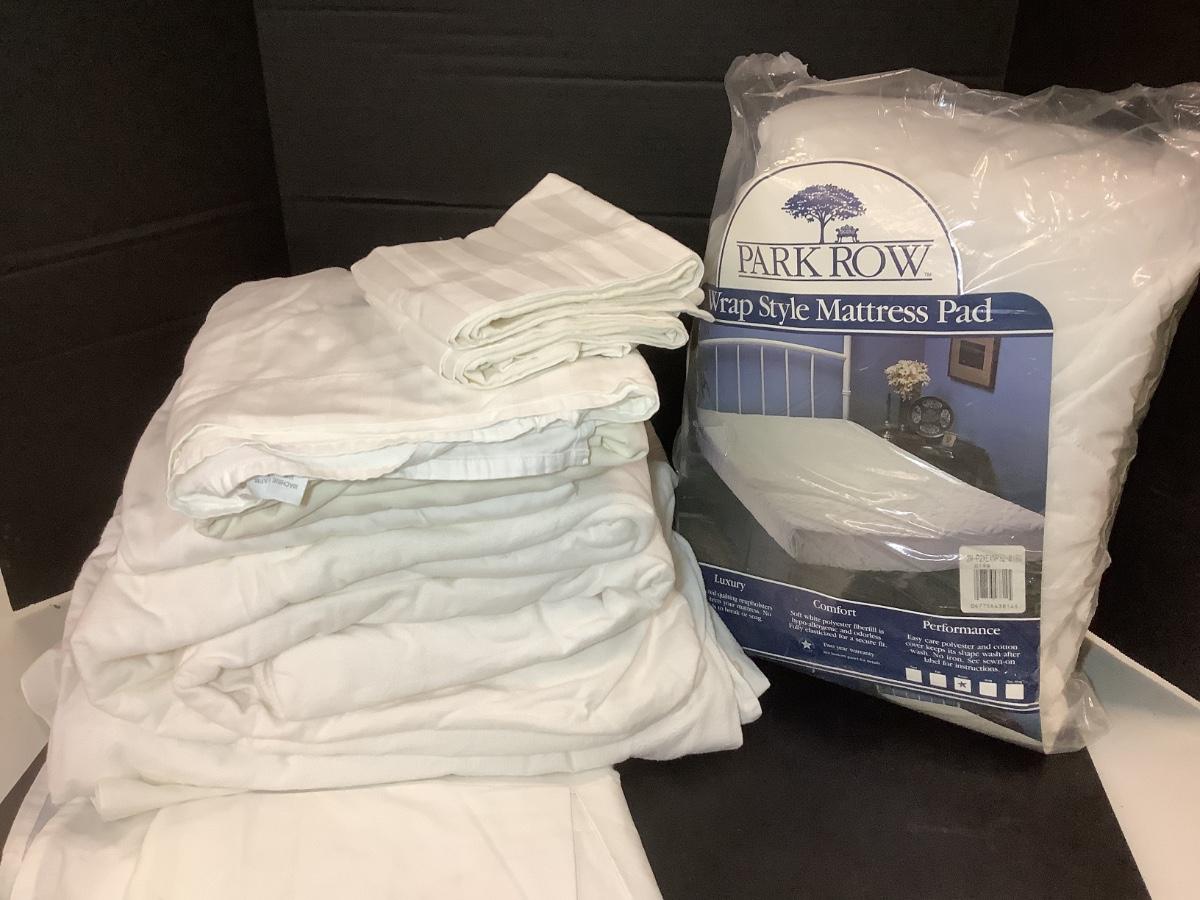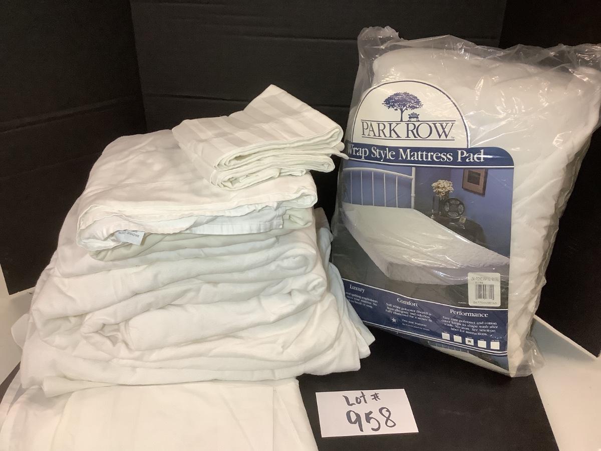 Lot 958. Lot of Queen Size Duvet Cover, Bedskirt, Flannel Sheet Set, Cotton Sheet Set, & NEW IN PKG Mattress Pad