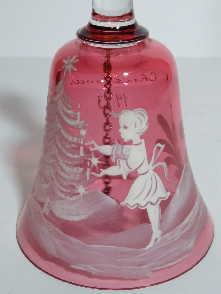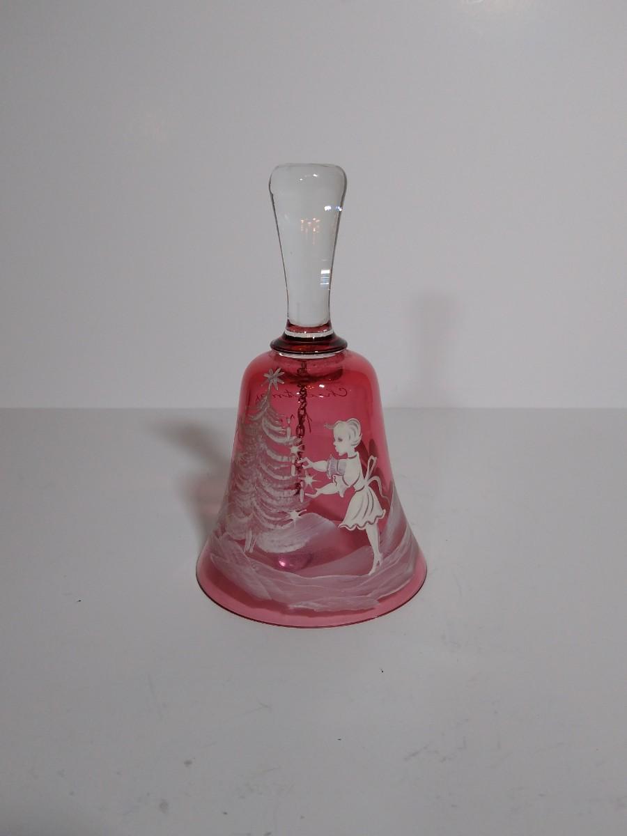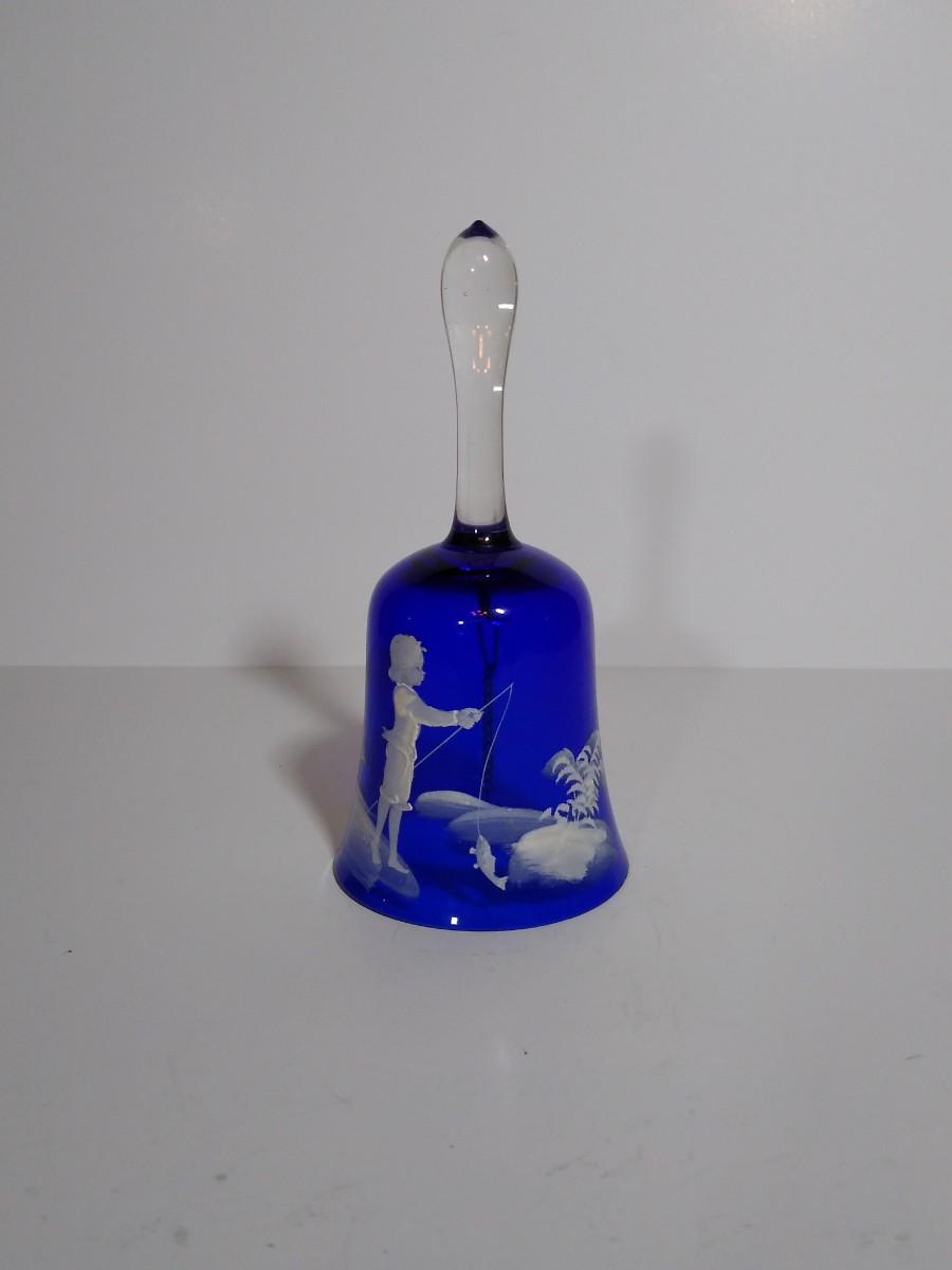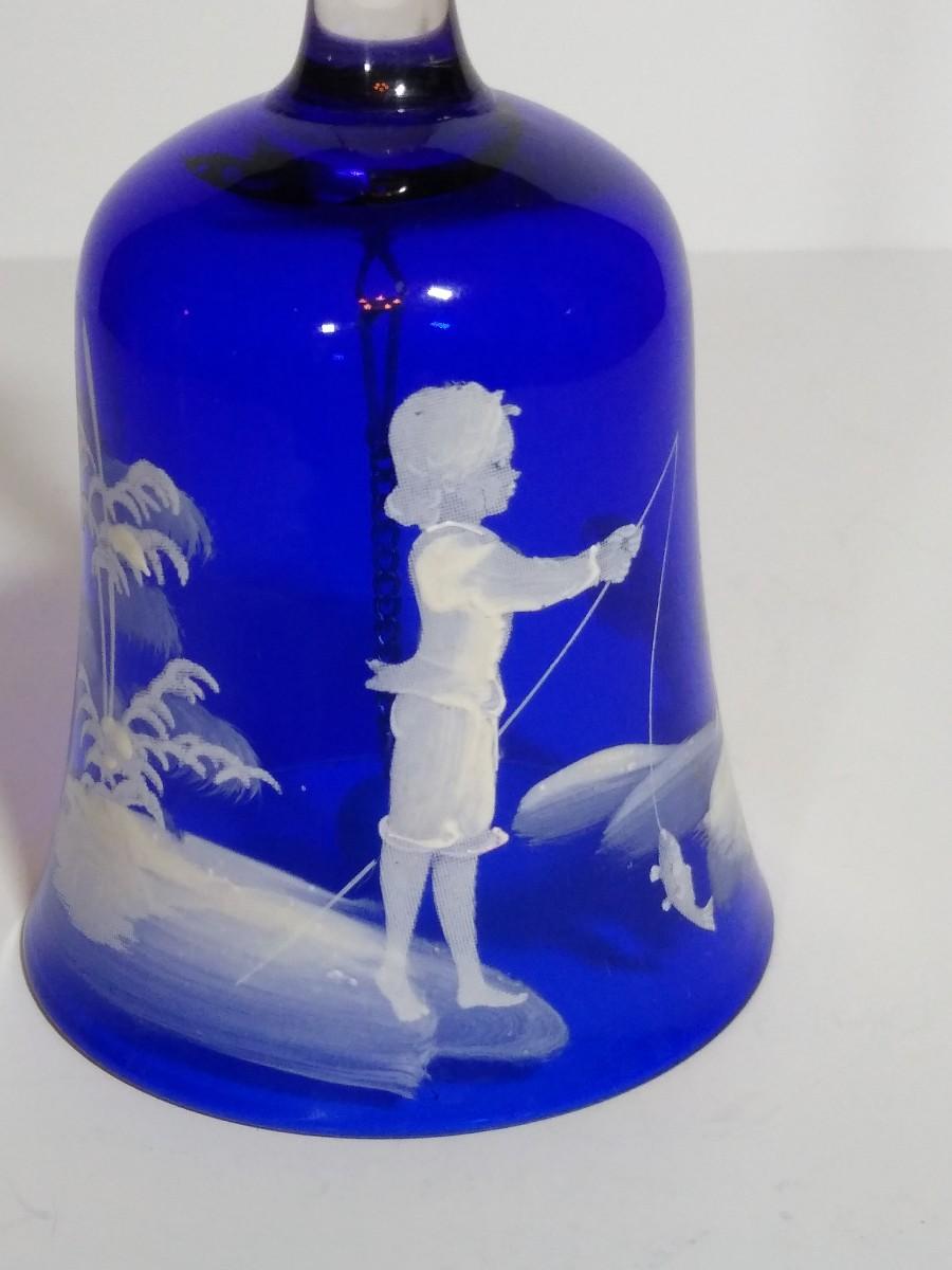 LOT 12S: Fenton Mary Gregory Cobalt Blue Boy Fishing Decorative Bell and Cranberry Glass Mary Gregory style Christmas Bell