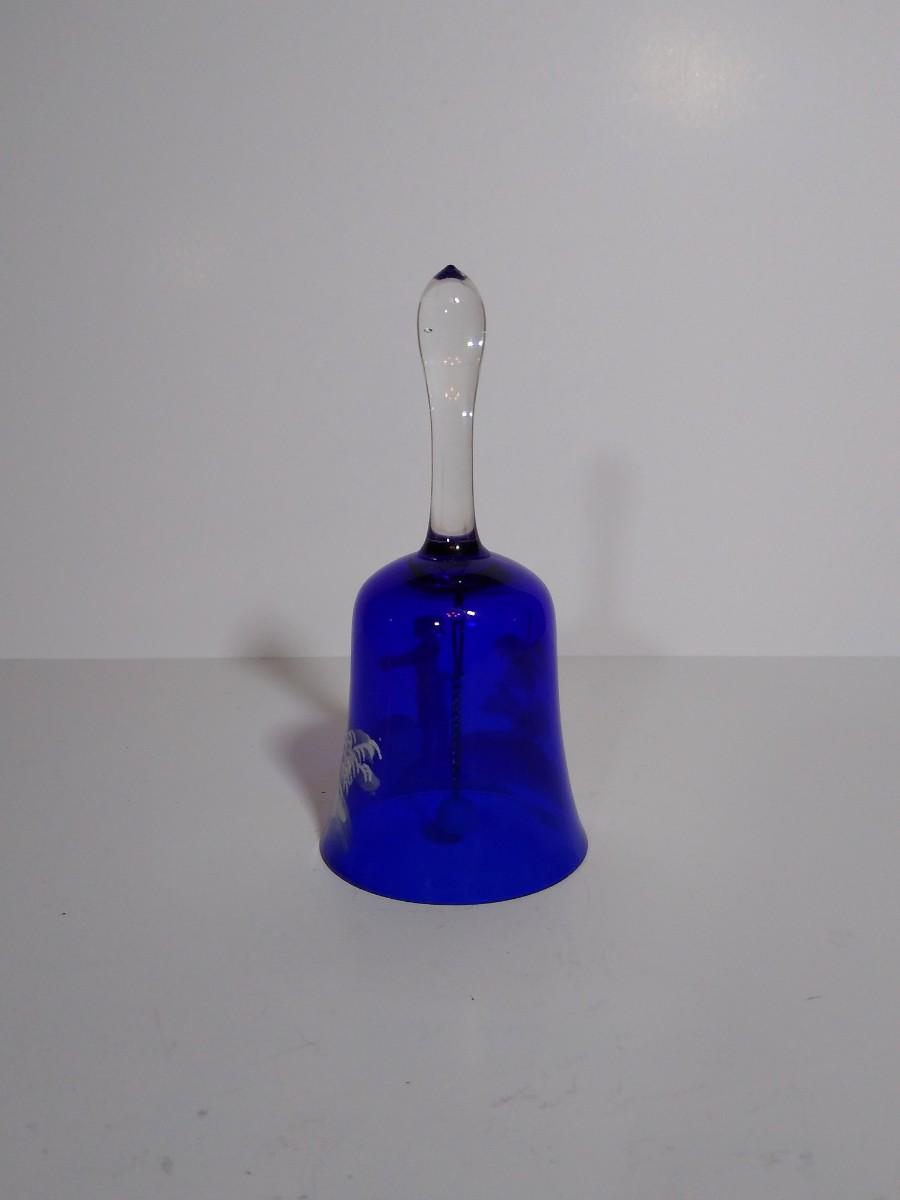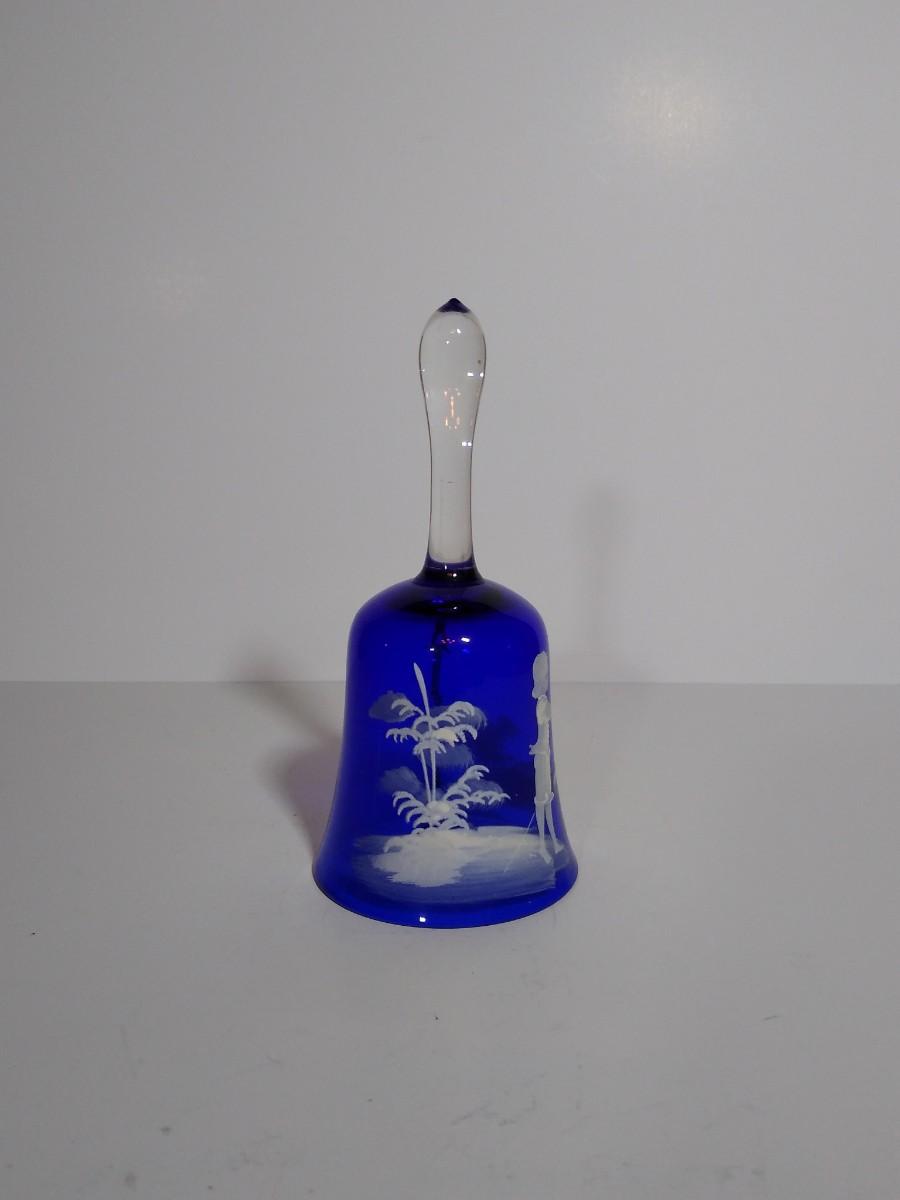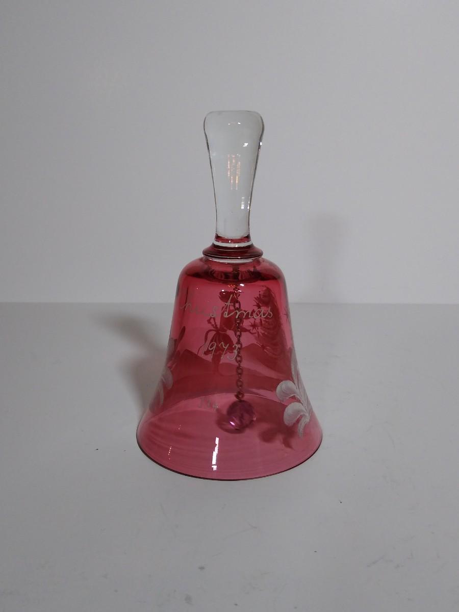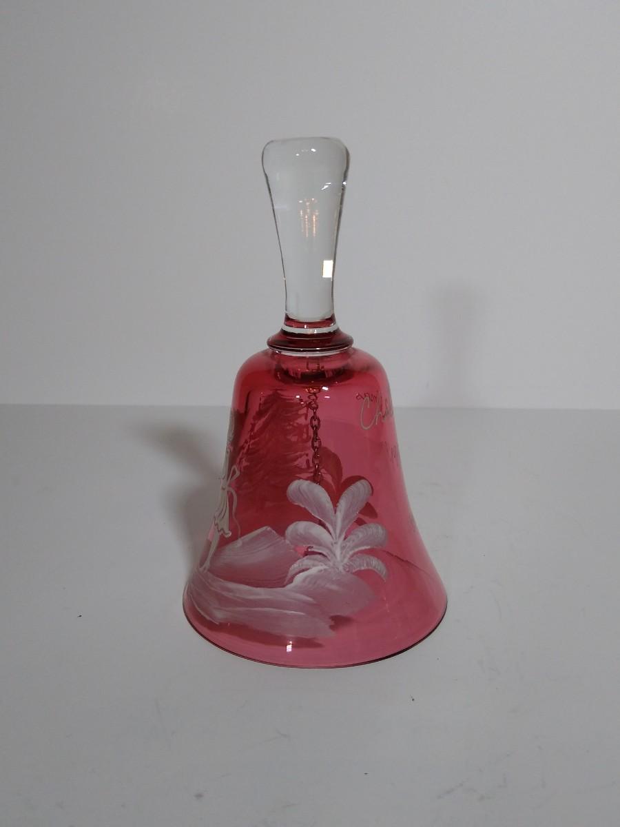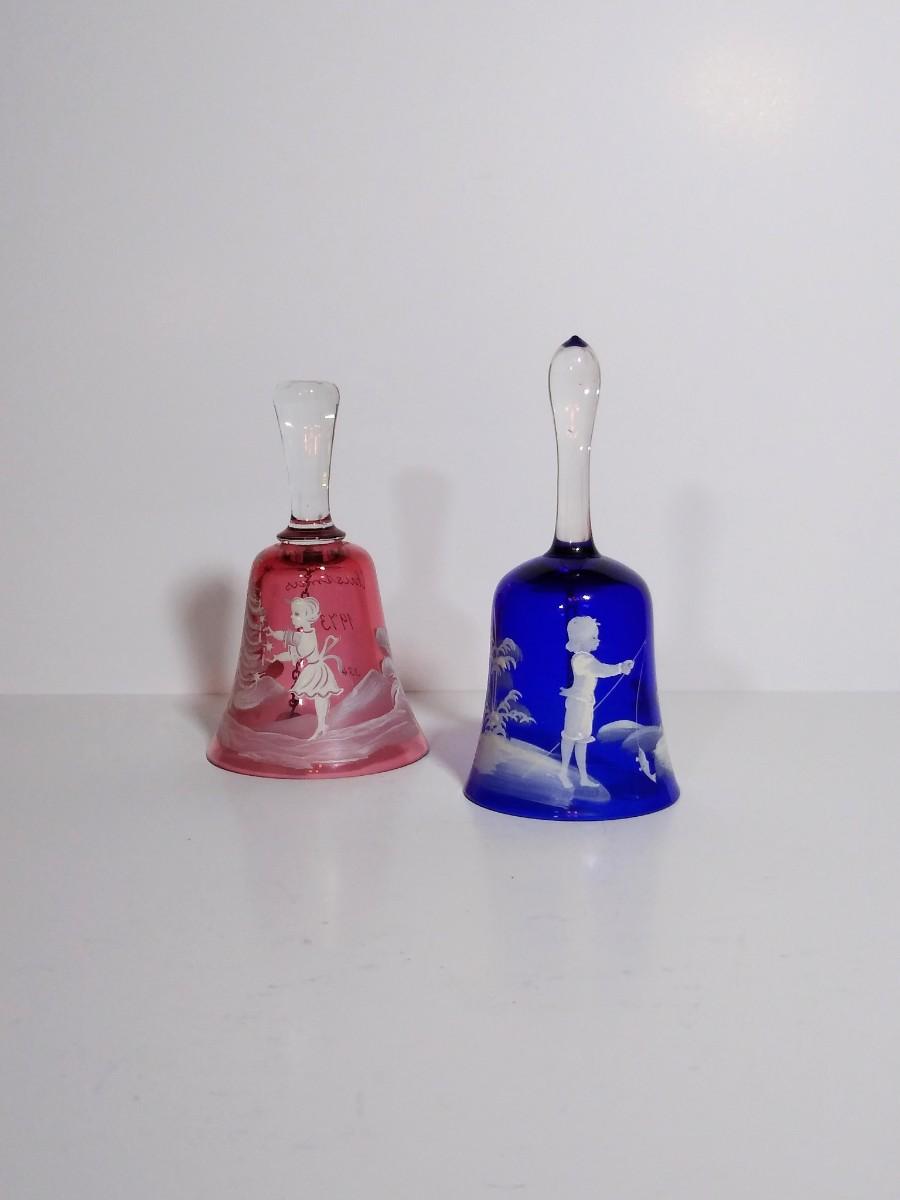 LOT 12S: Fenton Mary Gregory Cobalt Blue Boy Fishing Decorative Bell and Cranberry Glass Mary Gregory style Christmas Bell