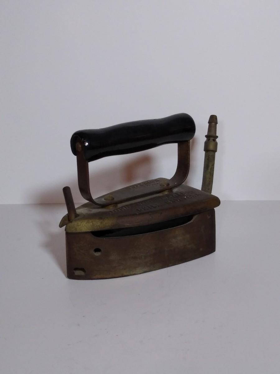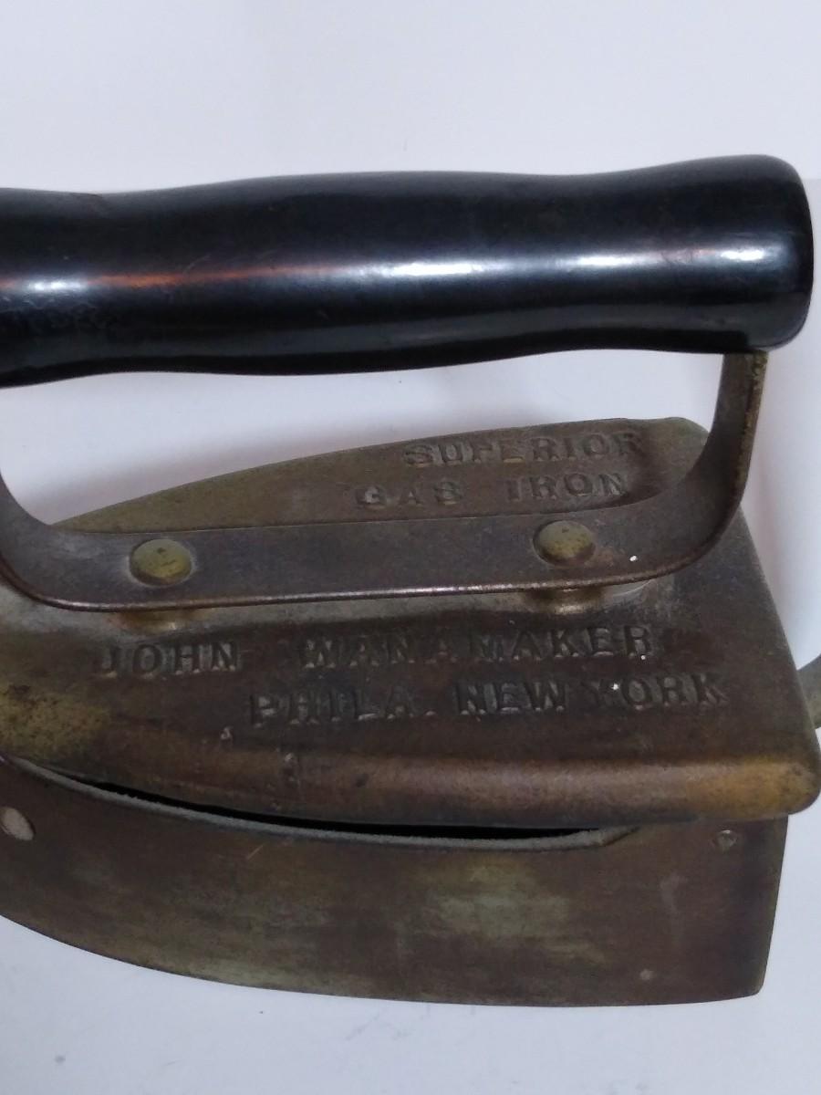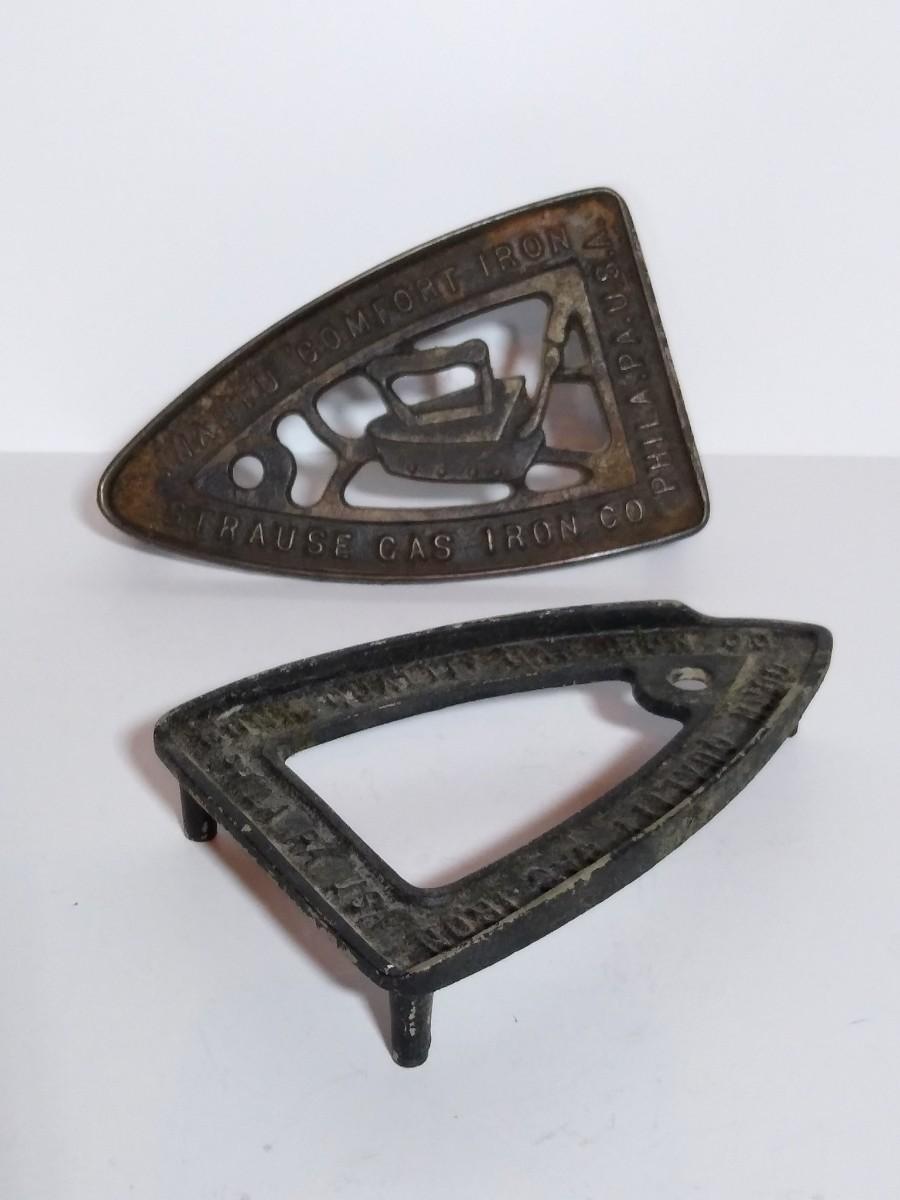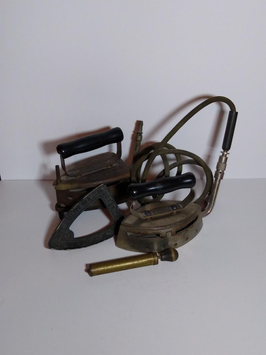 LOT 18S: Wanamaker Superior Gas Iron, Double Point Iwantu Comfort Iron, Coleman Brass Air Pump & Trivets