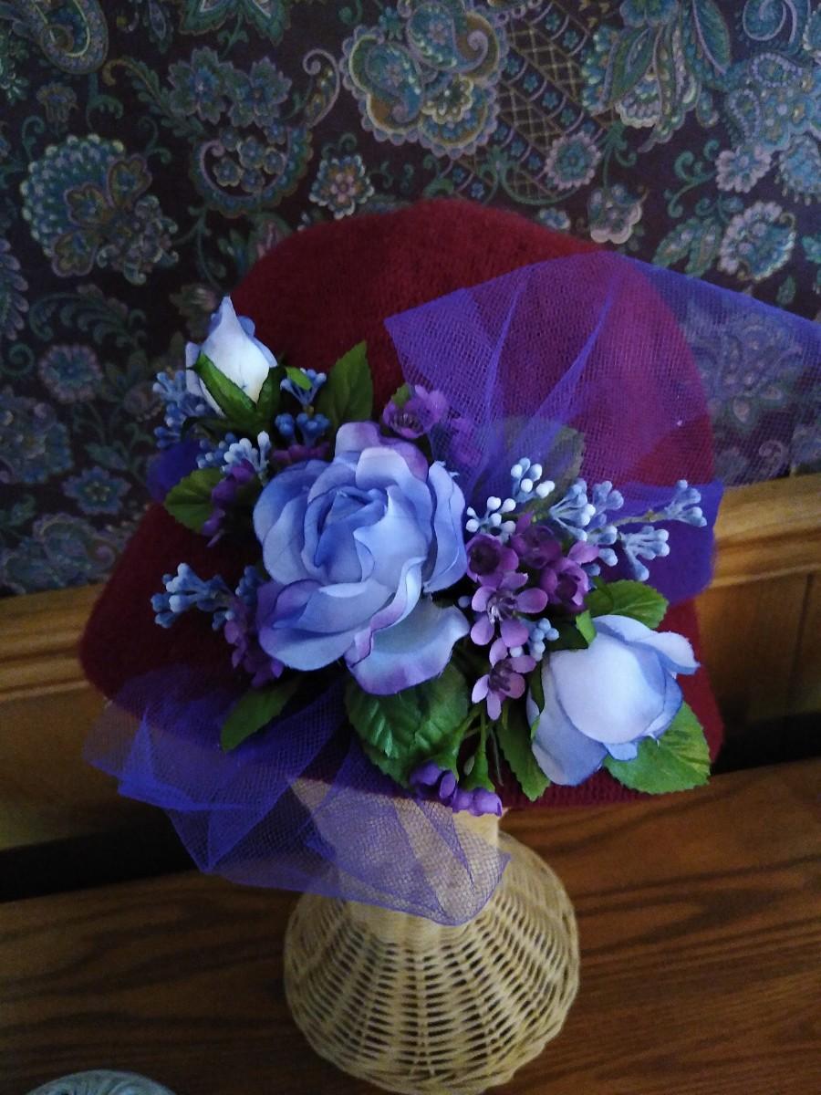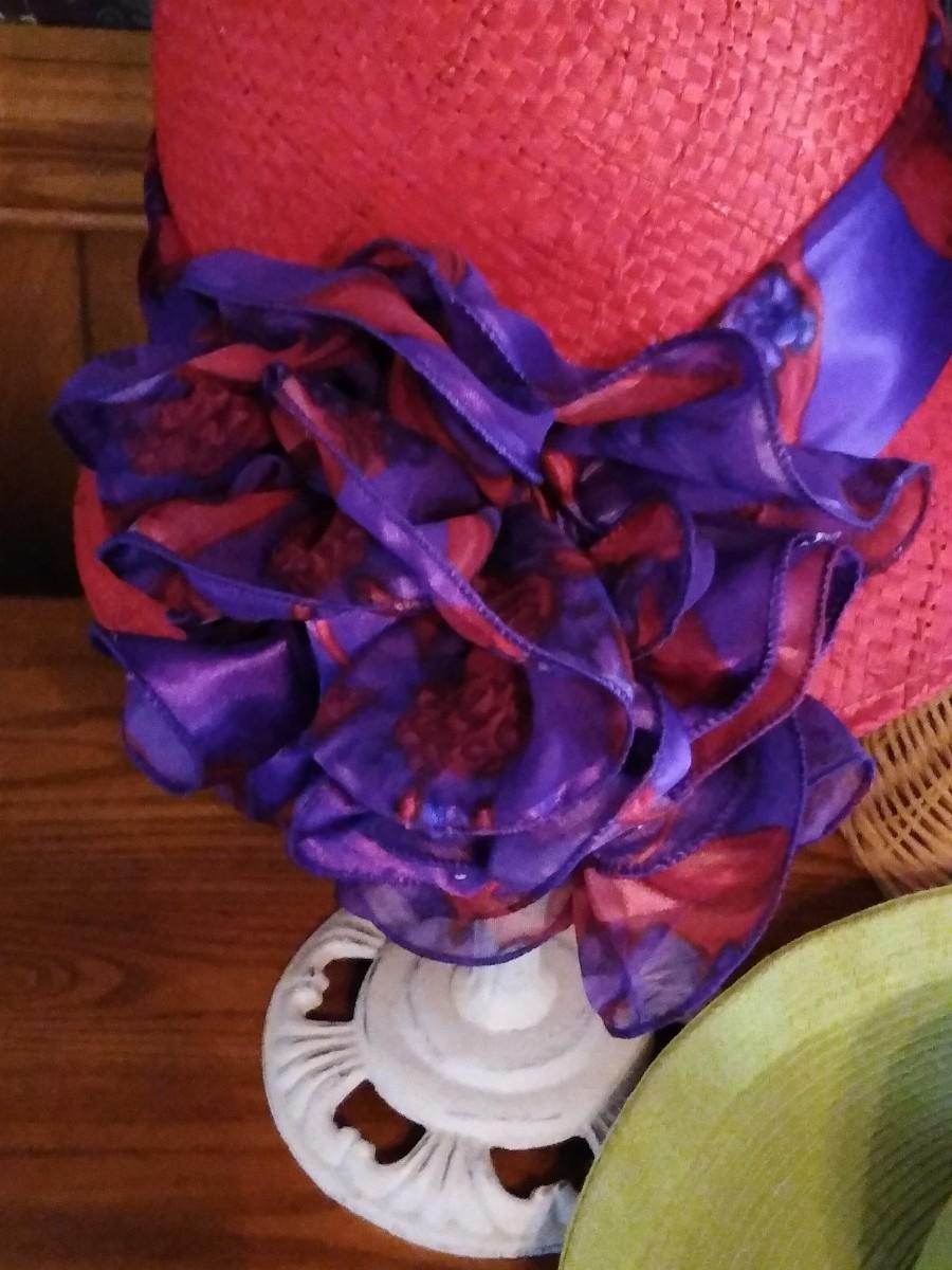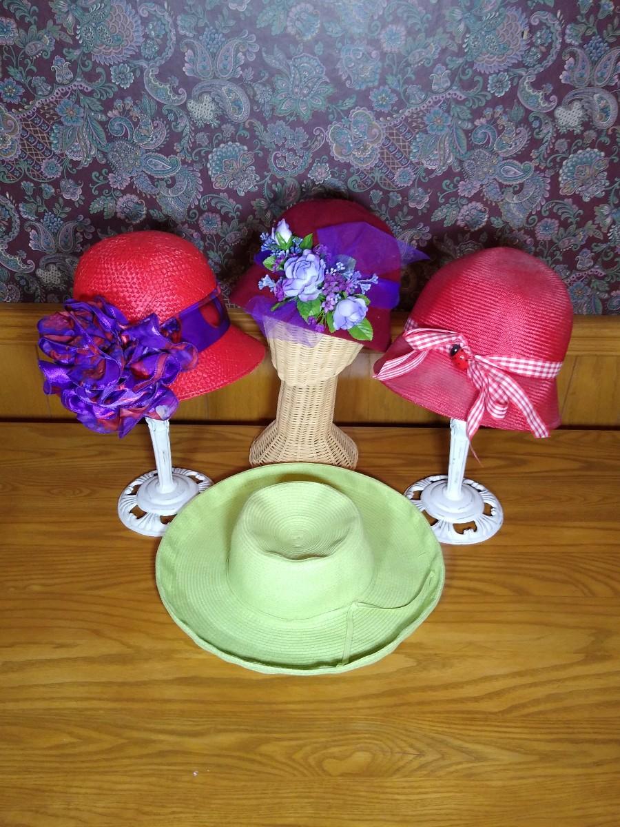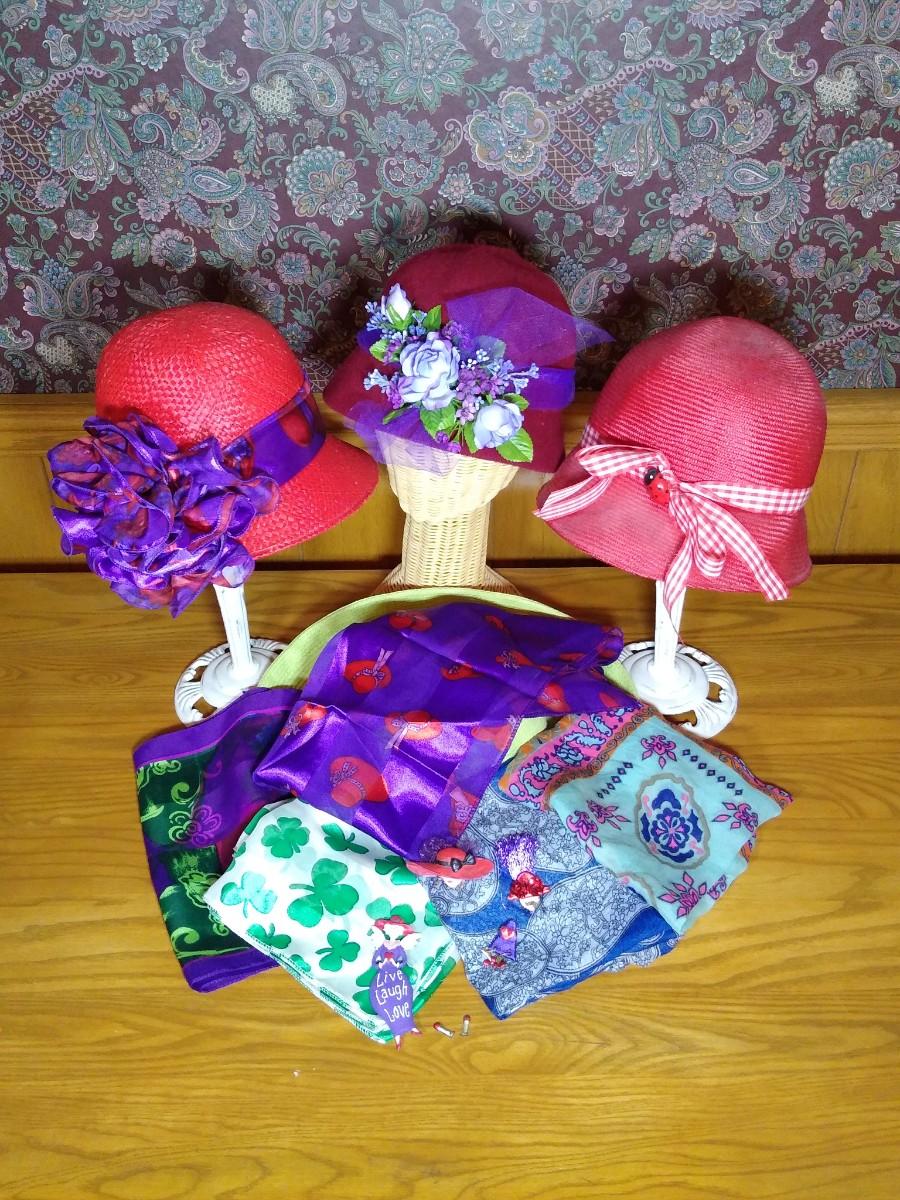 LOT 28S: Red Hat Society Collection- Vintage Hats, Hat Stands, Scarves & Pins