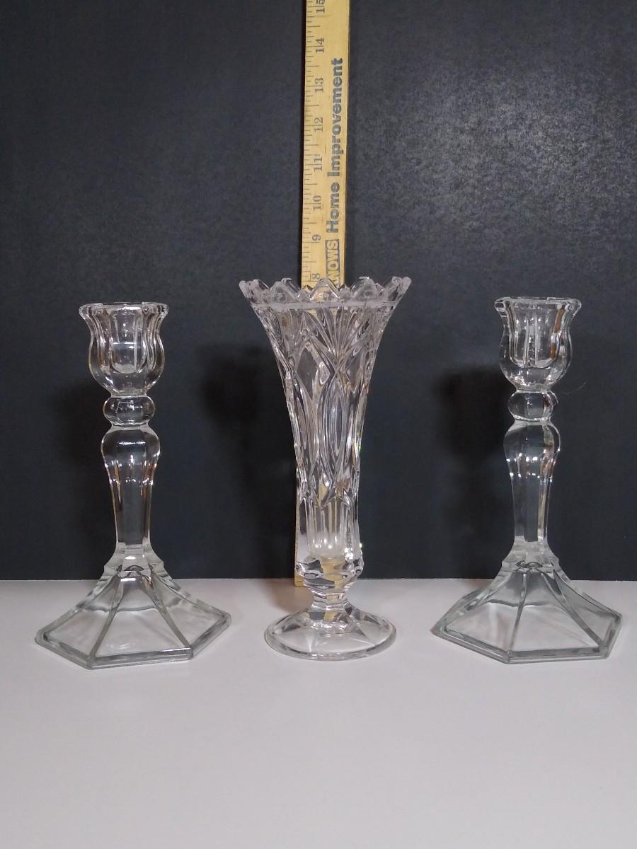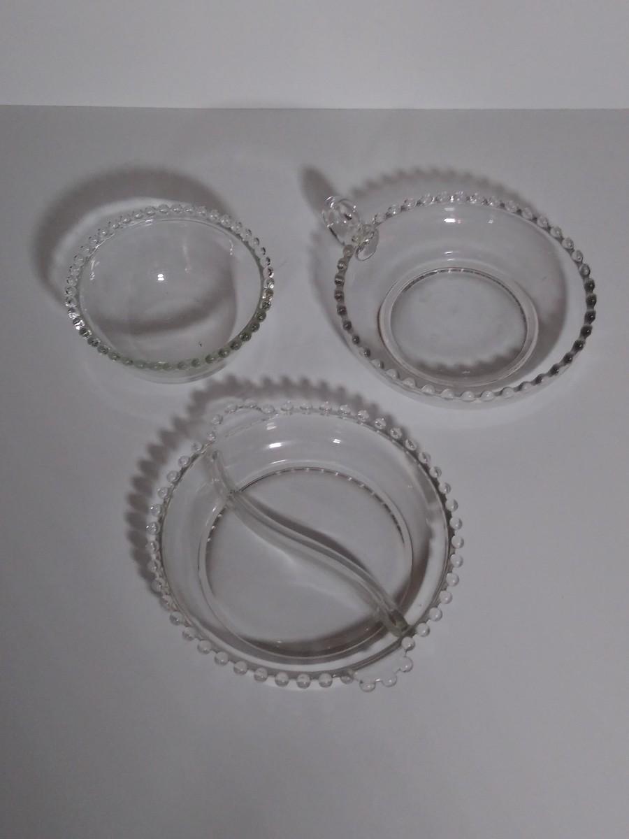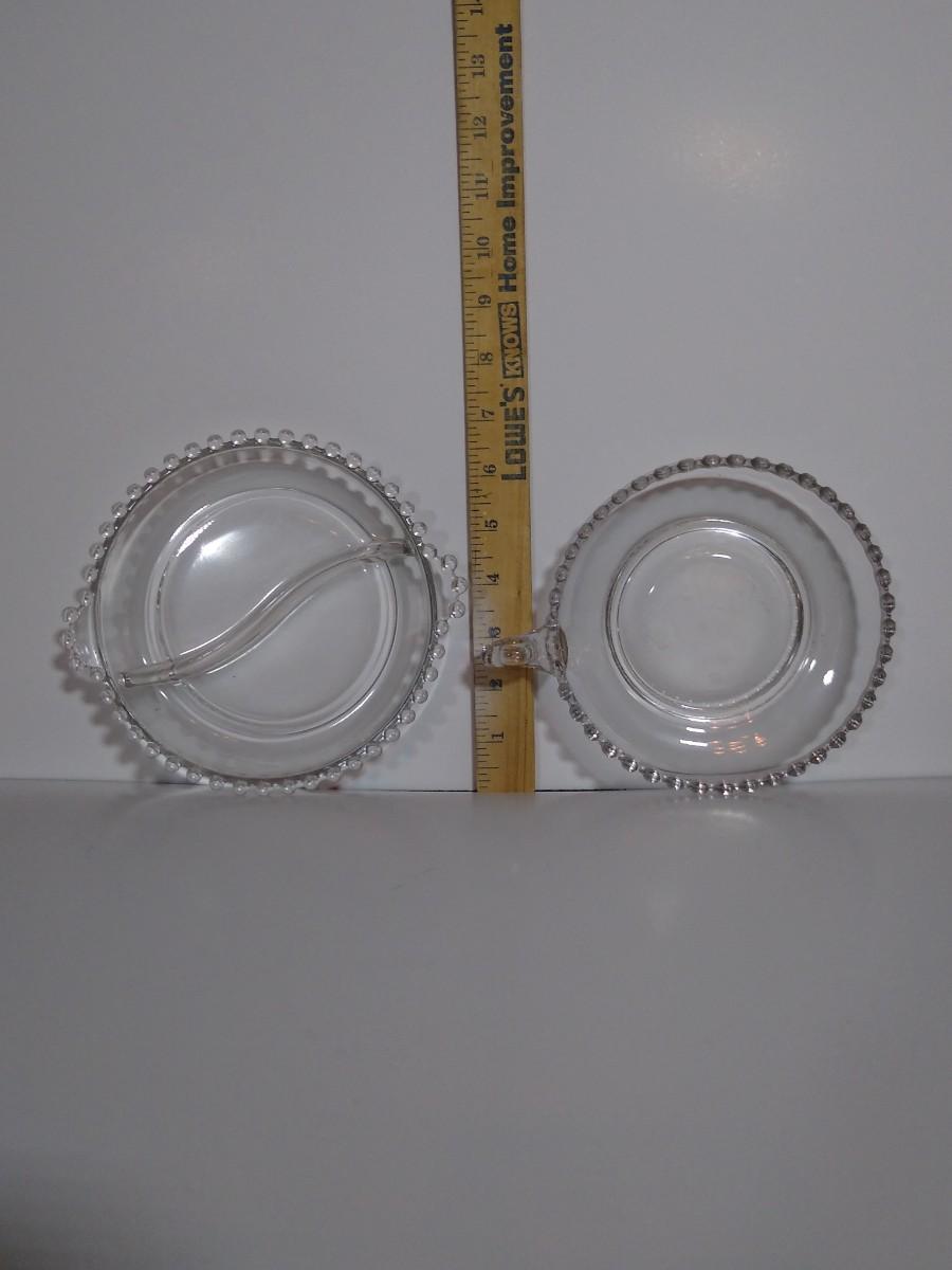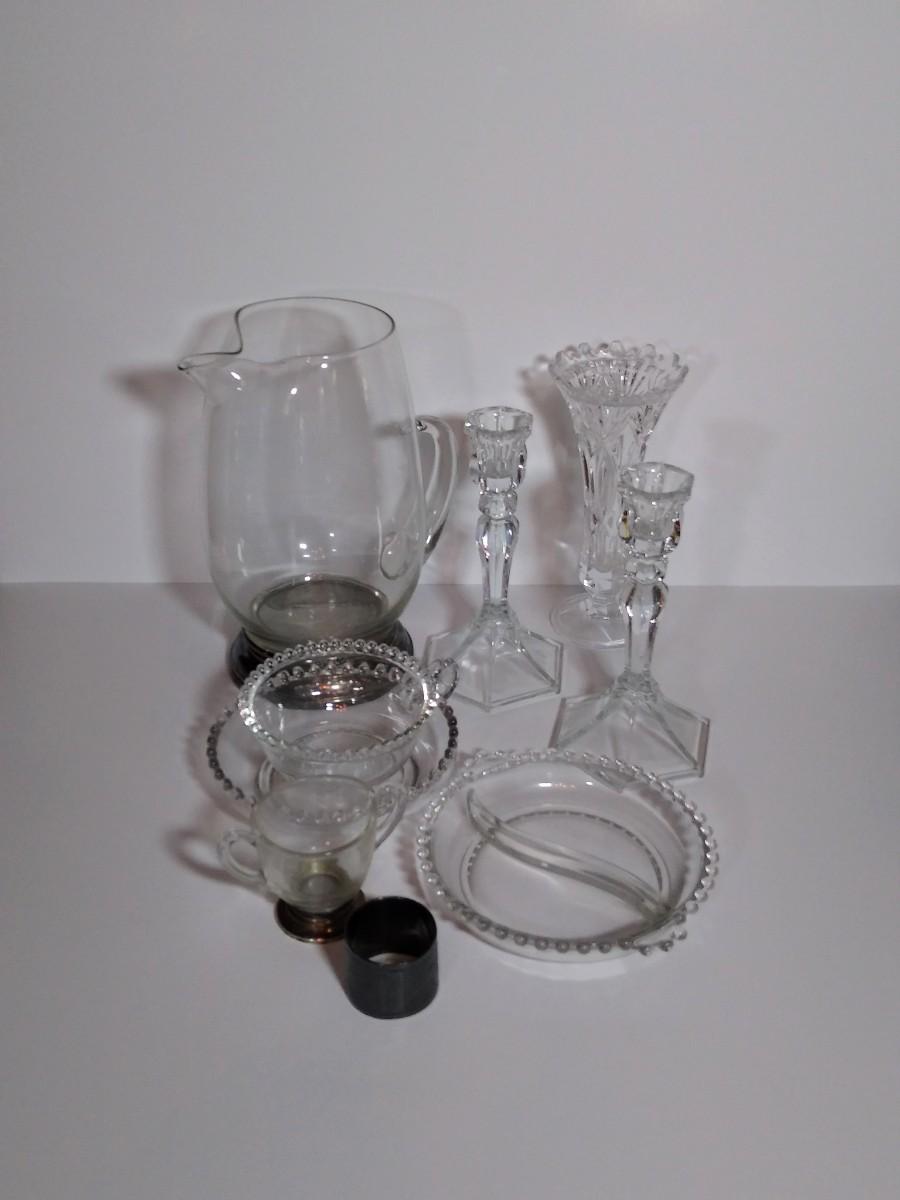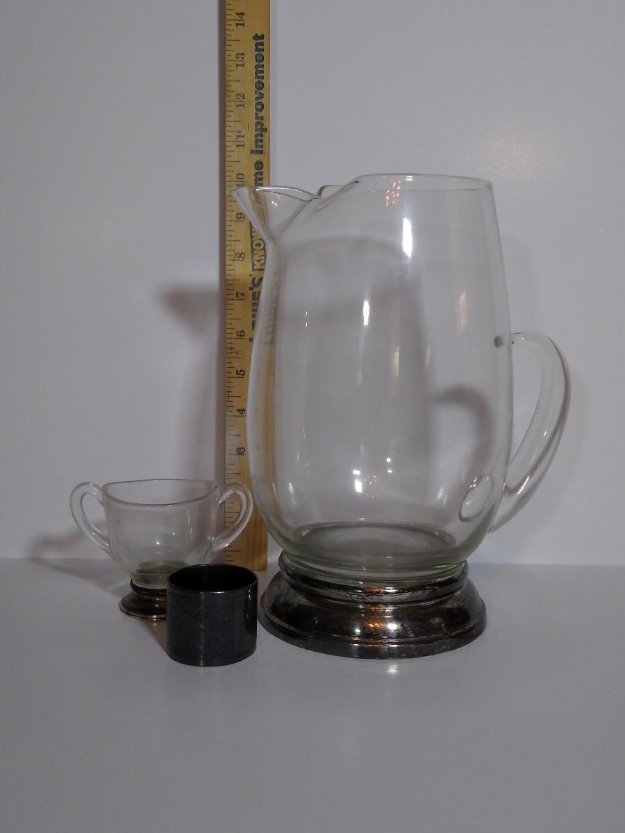 LOT 37O: Glass Pitcher and Sugar Bowl w/ Plated Base, Imperial Glass Beaded Edge Dishes & More