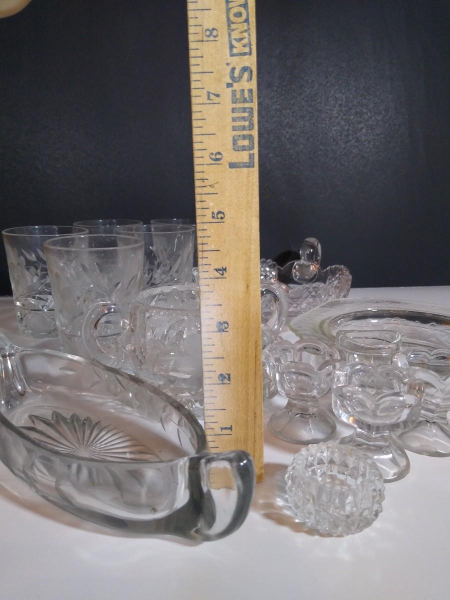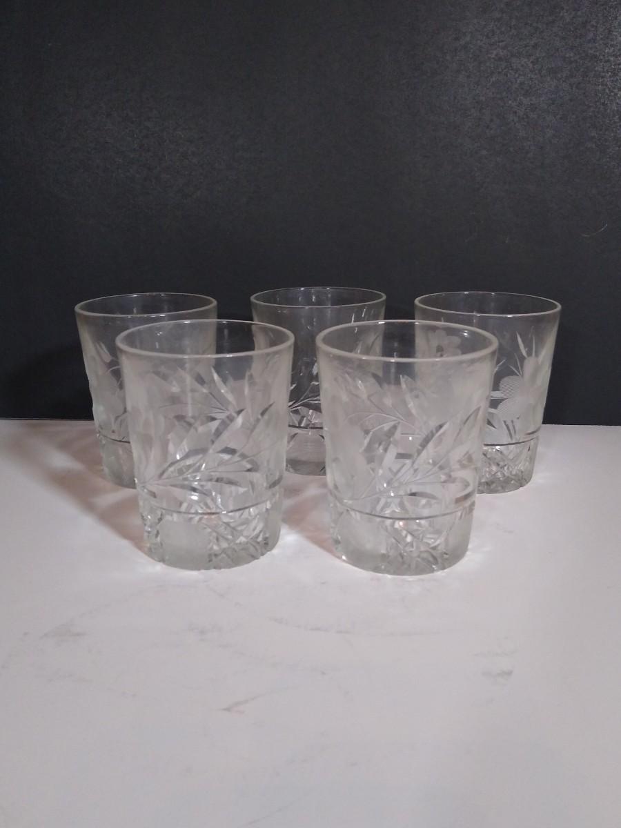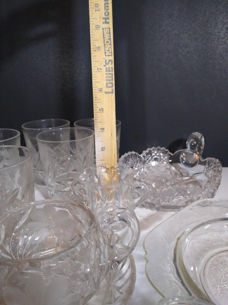 LOT 38O: Glassware and Crystal- Etched Floral Tumblers, Madrid Pattern Dish, Salt Cellars & More