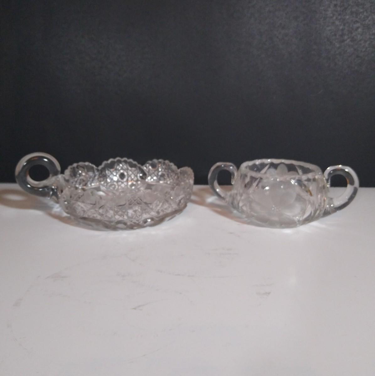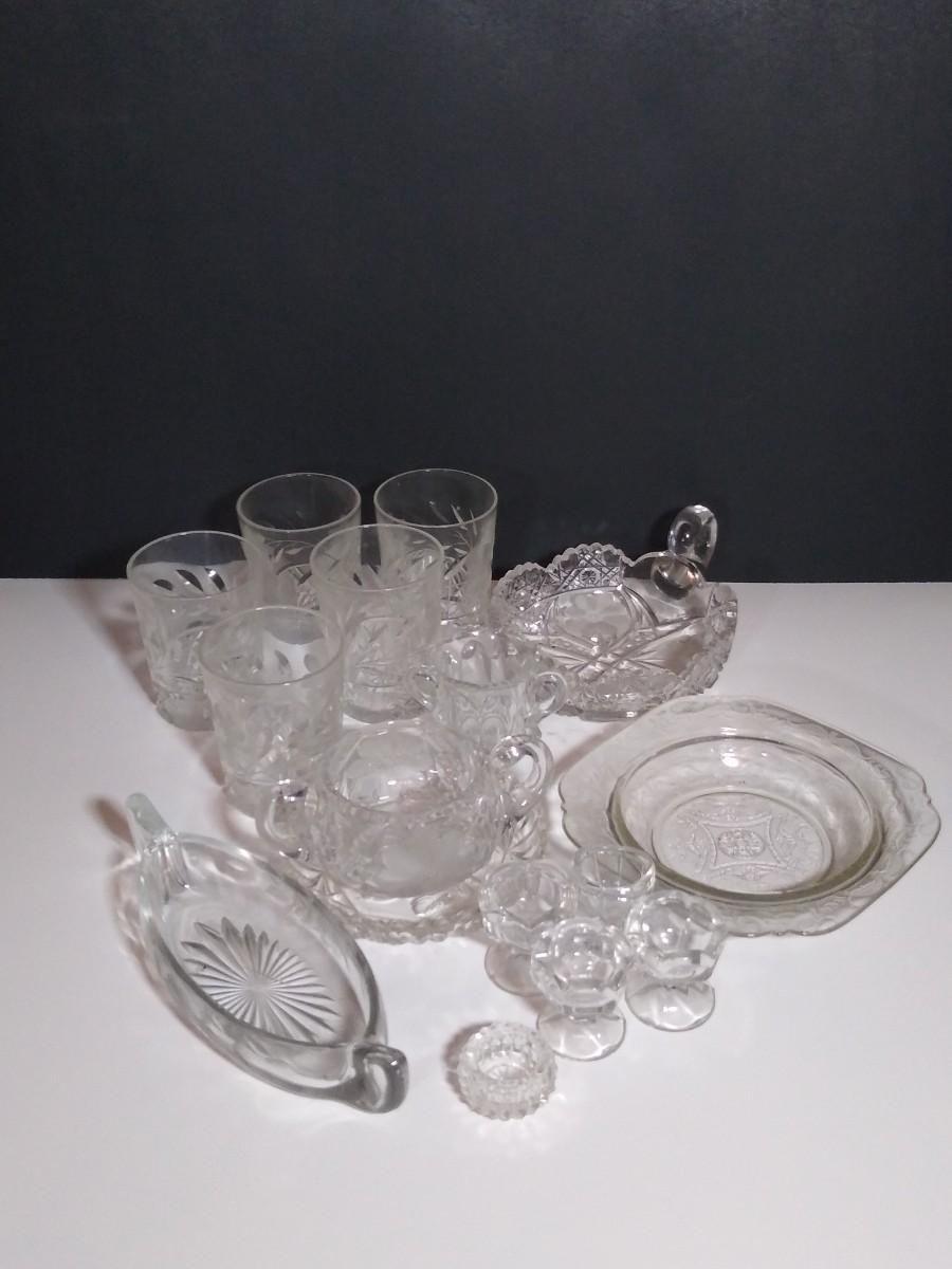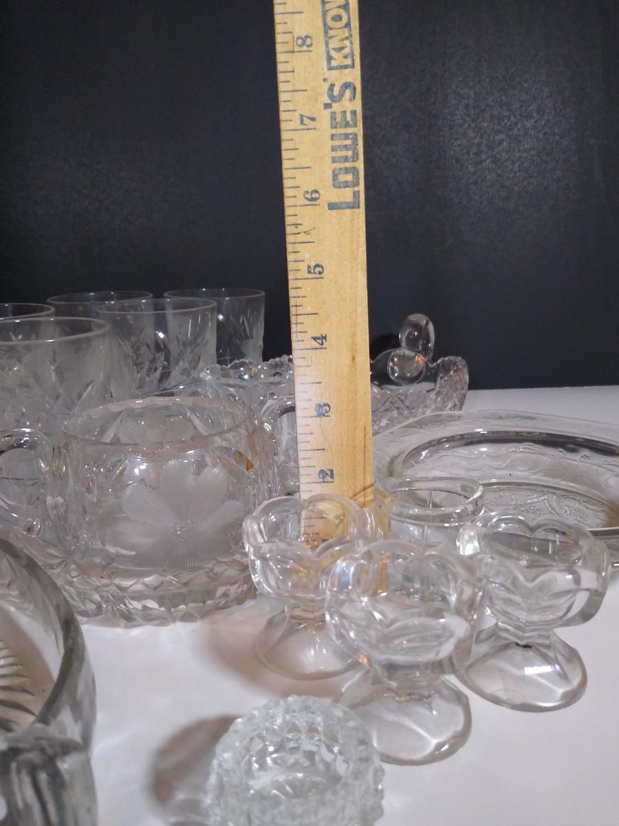 LOT 38O: Glassware and Crystal- Etched Floral Tumblers, Madrid Pattern Dish, Salt Cellars & More