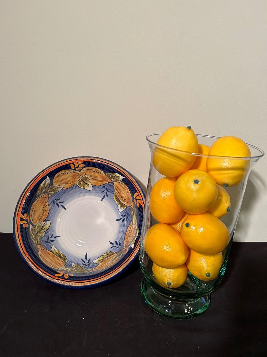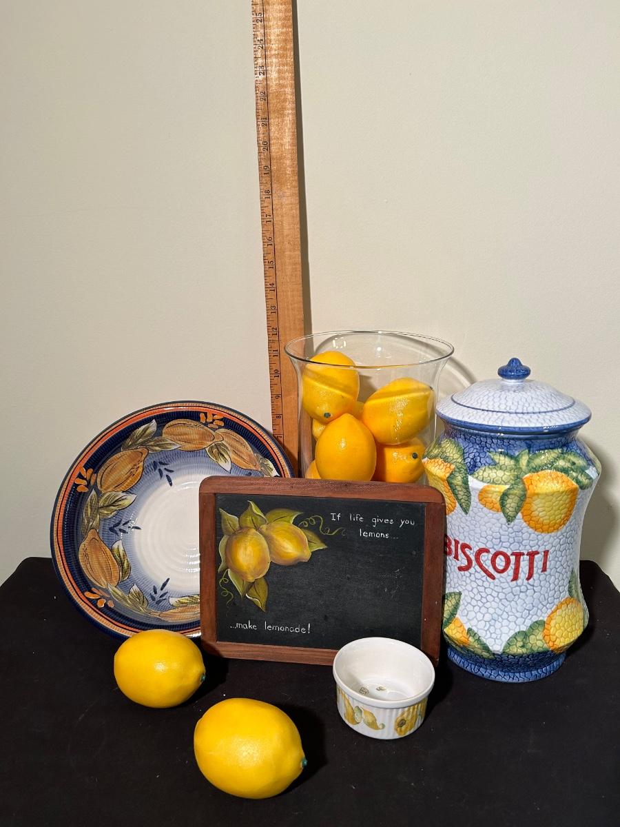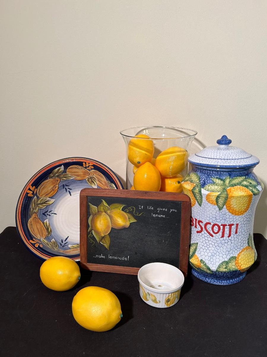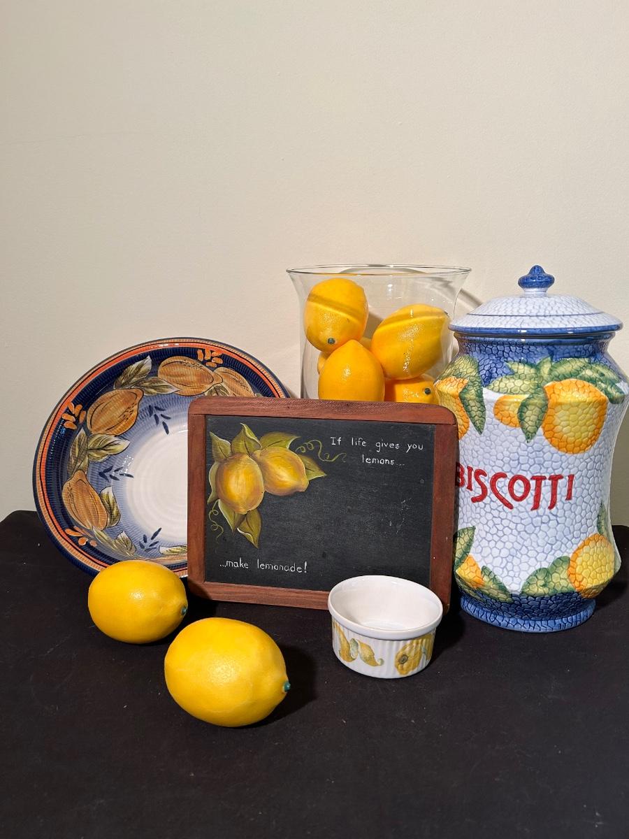 Lemon themed home goods including biscotti jar, artificial lemons, large bowl chalk board and more.