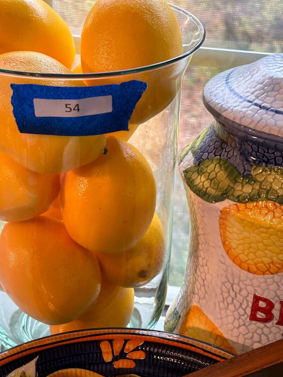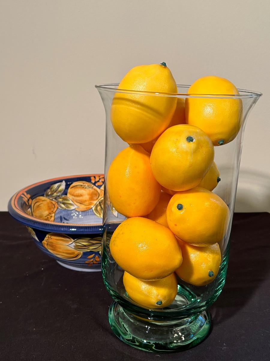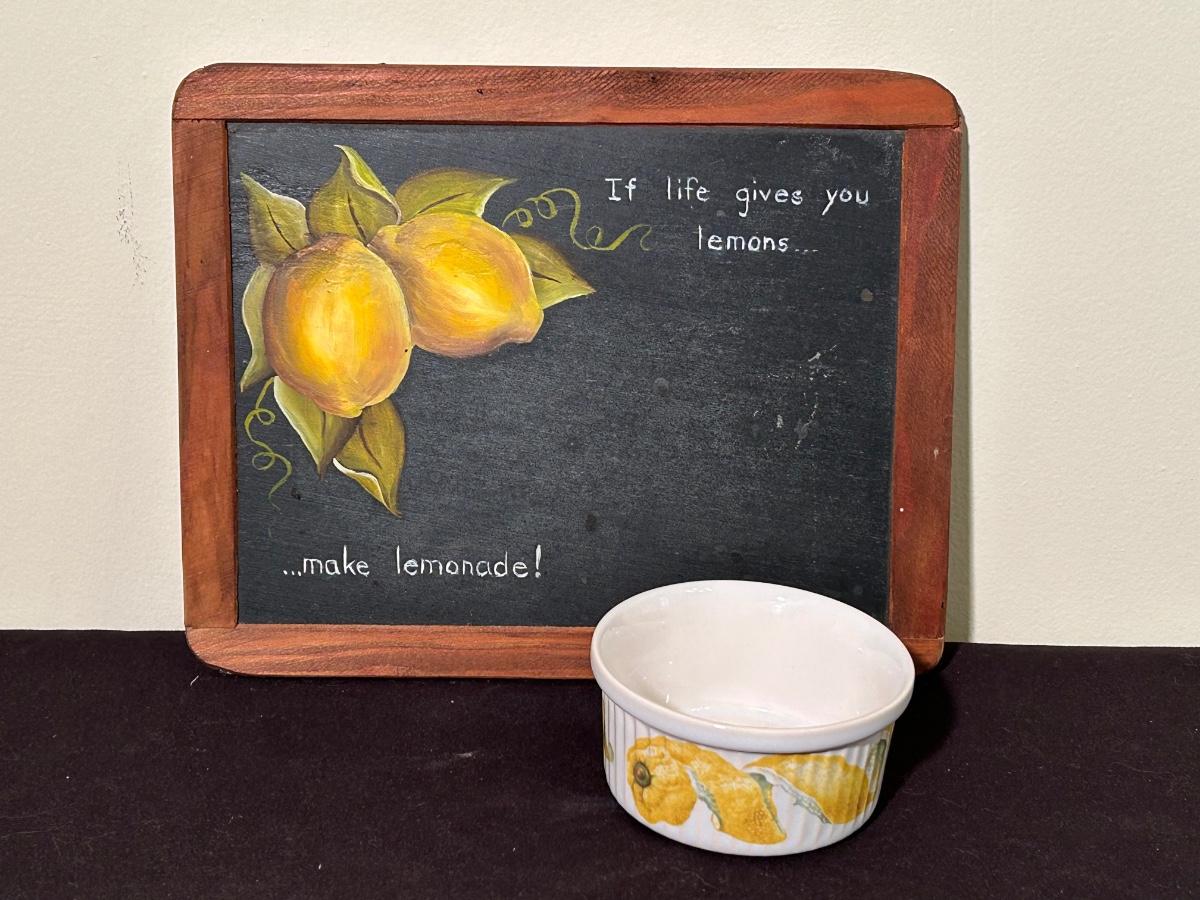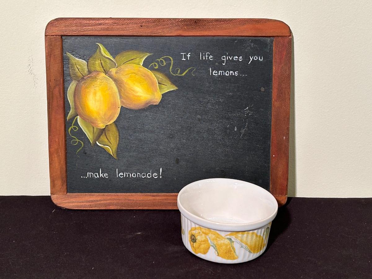 Lemon themed home goods including biscotti jar, artificial lemons, large bowl chalk board and more.