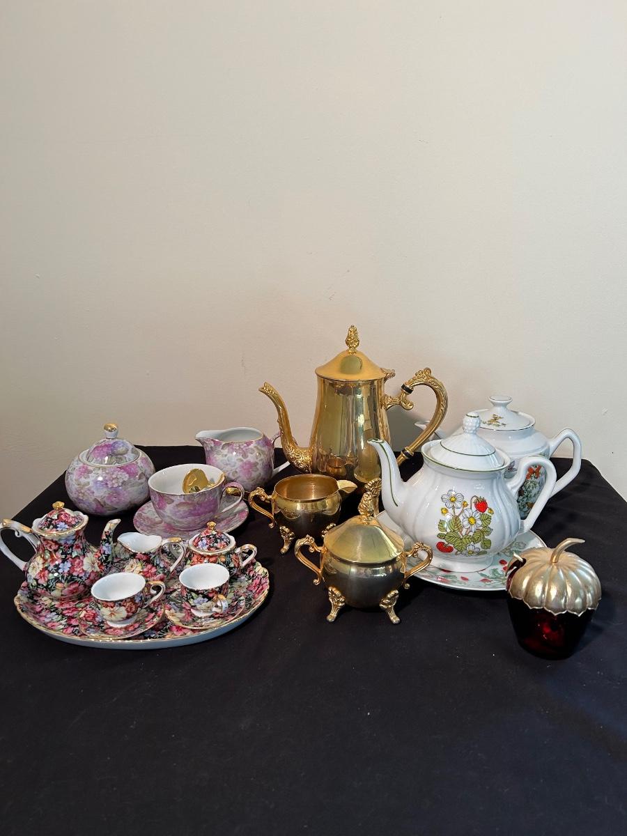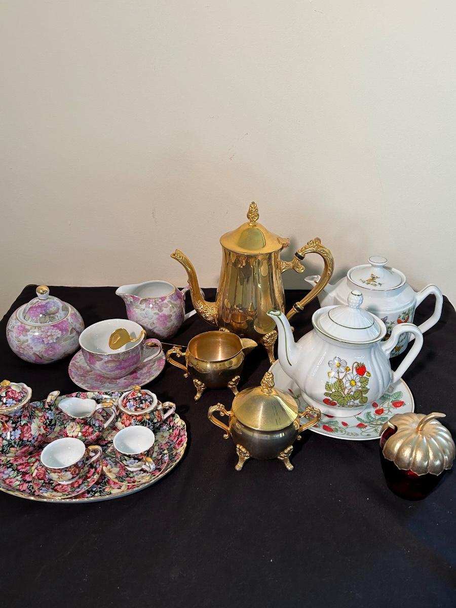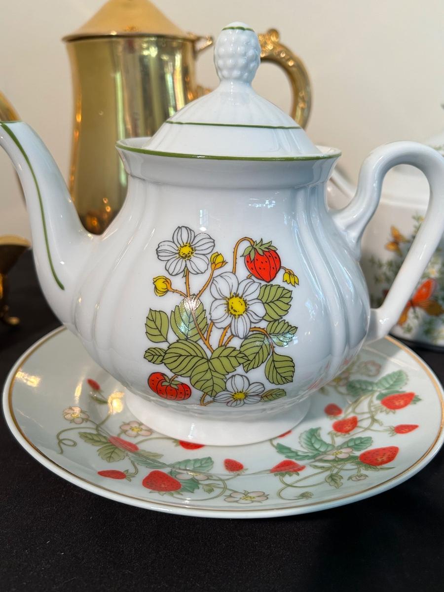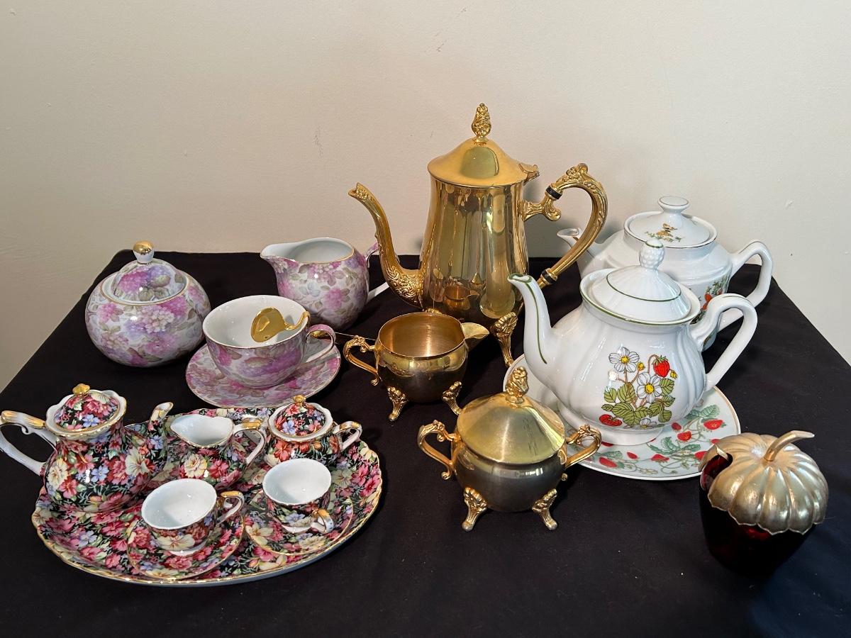Floral tea sets, gold tone tea set, strawberry tea set and more.