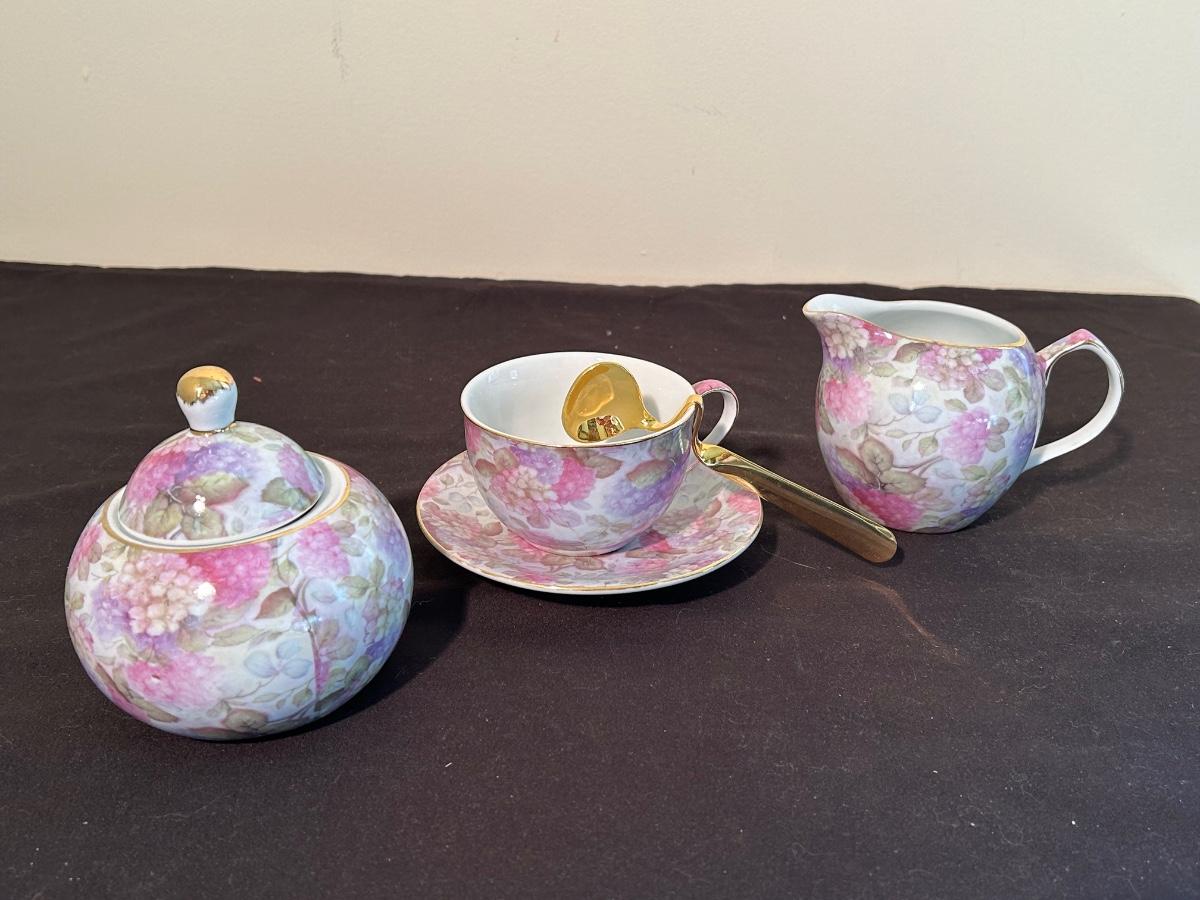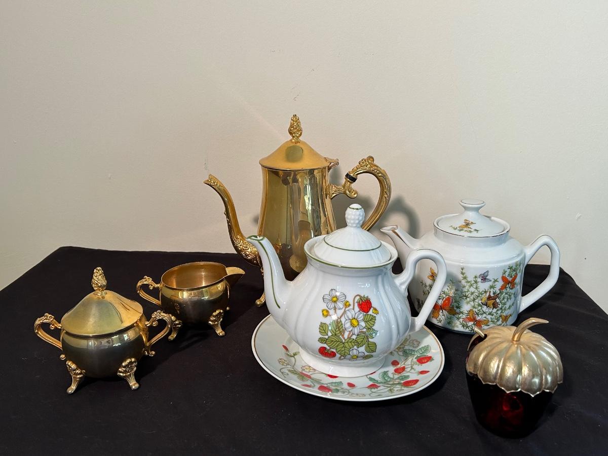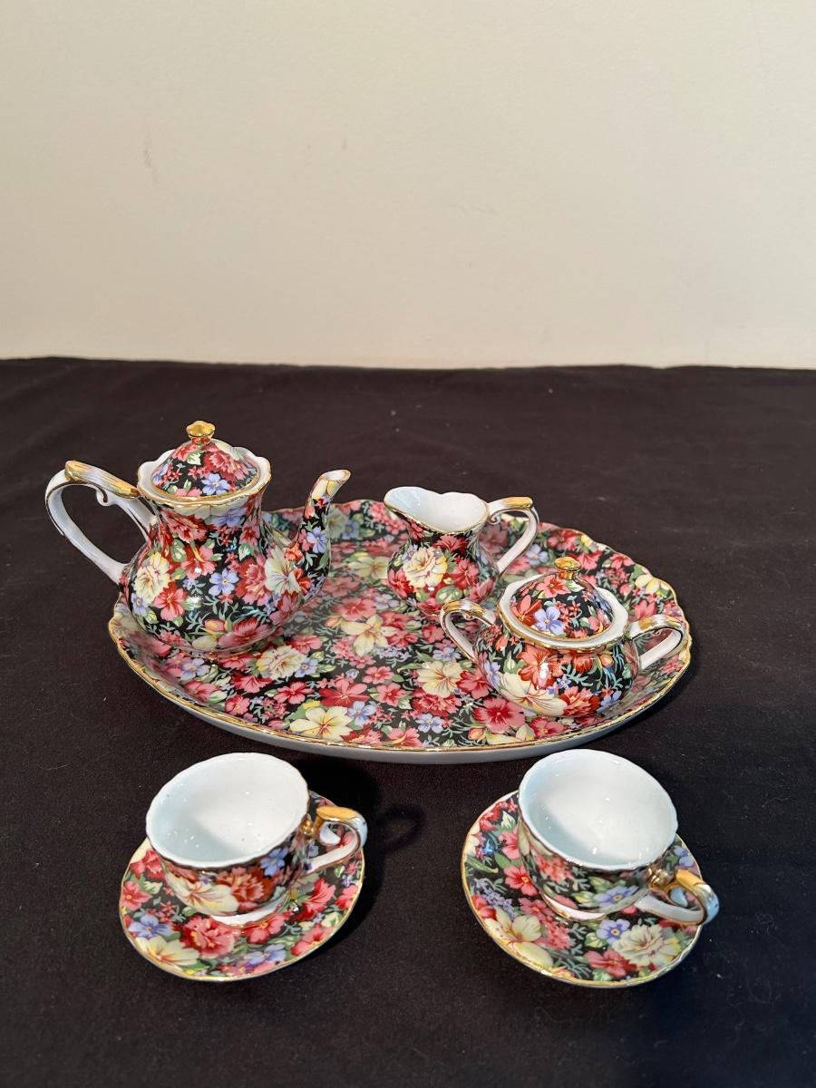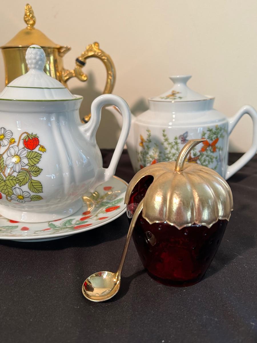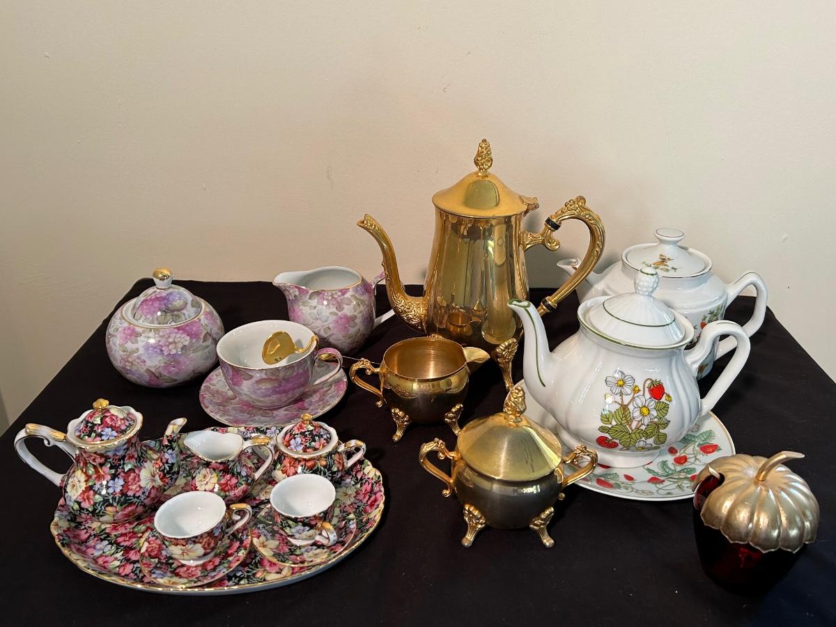 Floral tea sets, gold tone tea set, strawberry tea set and more.