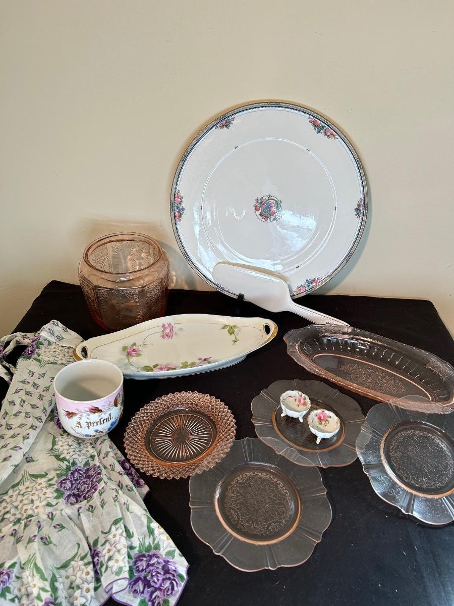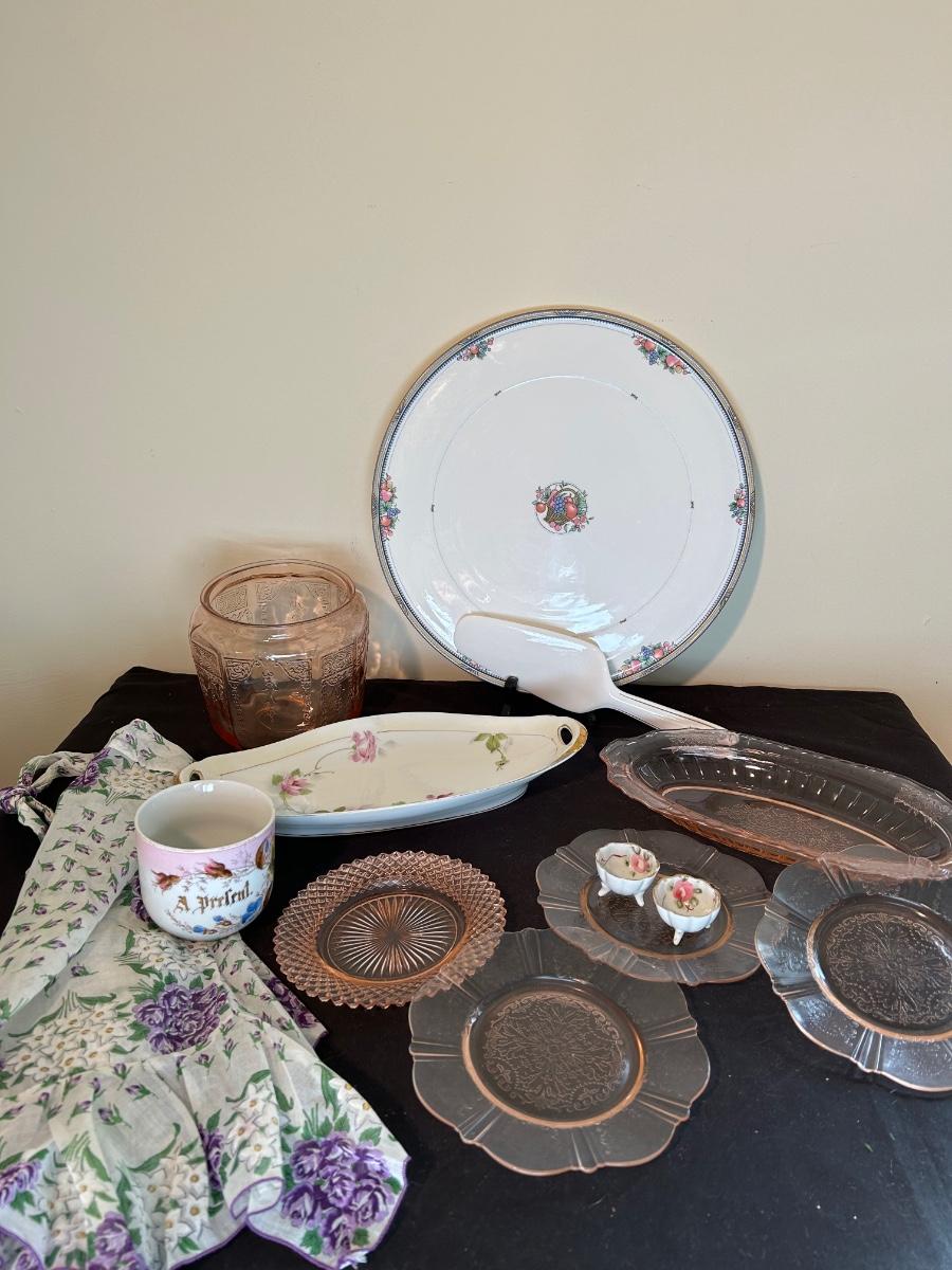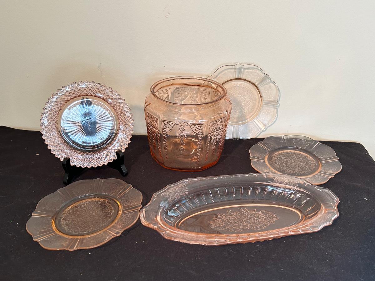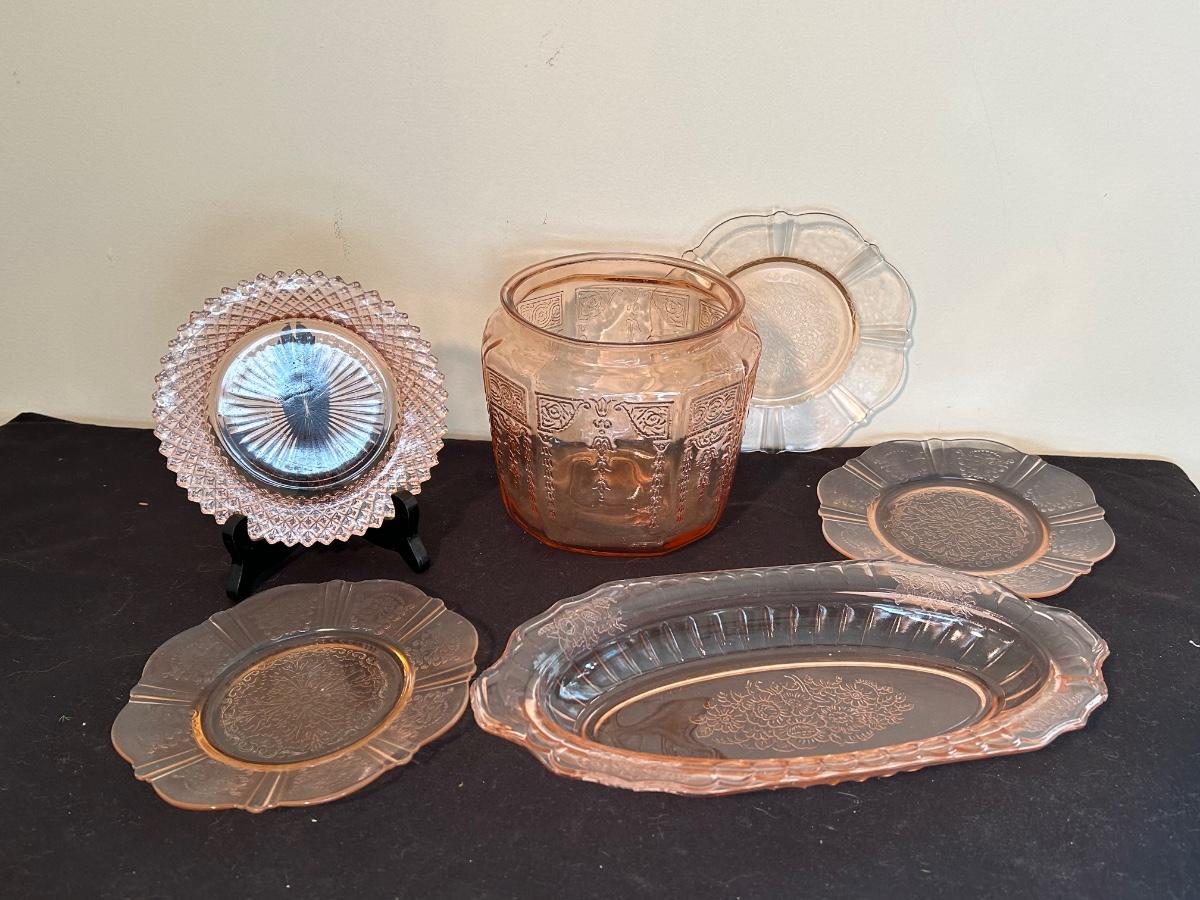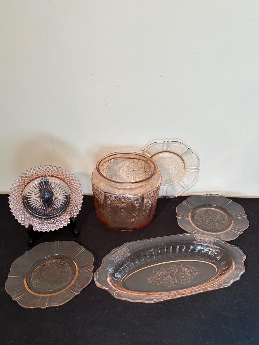 LOT 67K: Pink Depression Glass, Salt Dish, Serving Plates And More