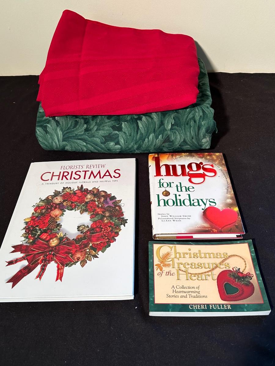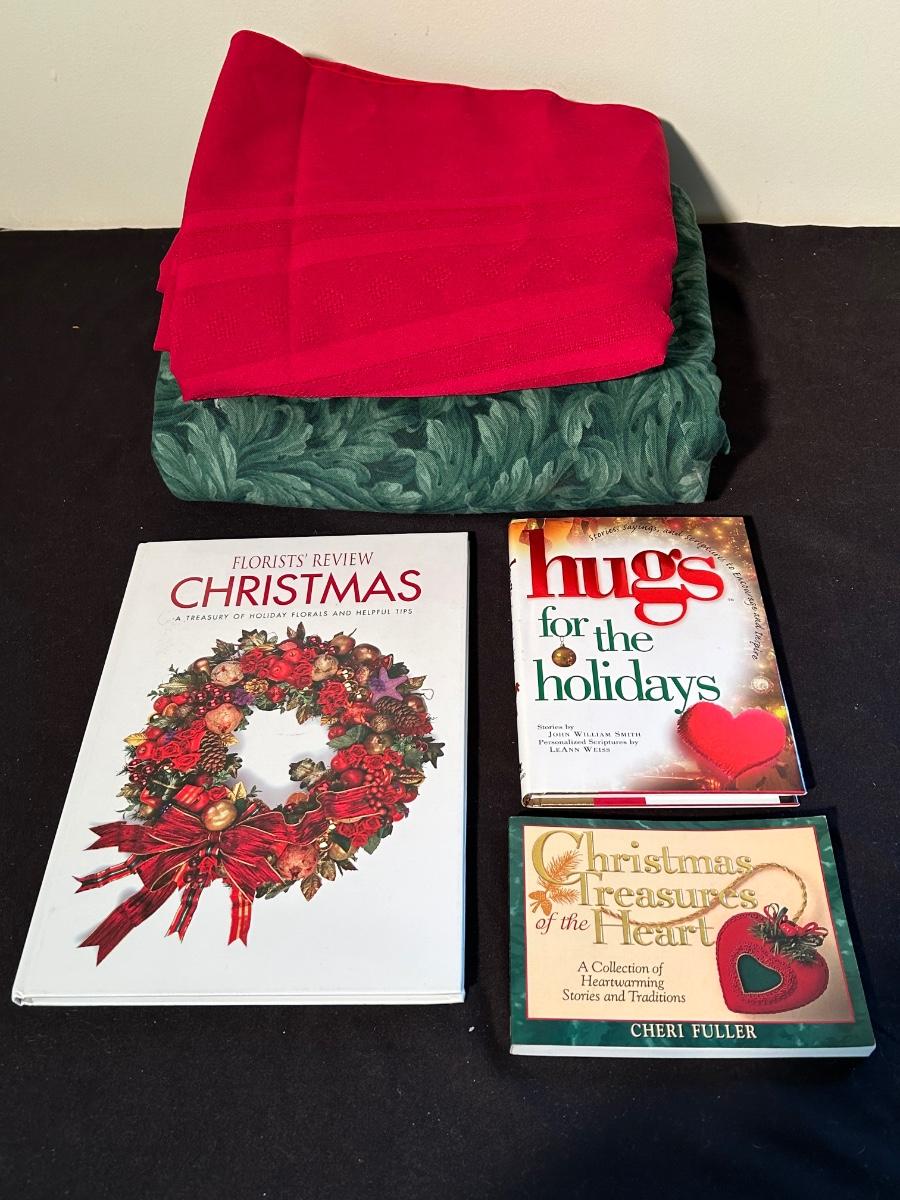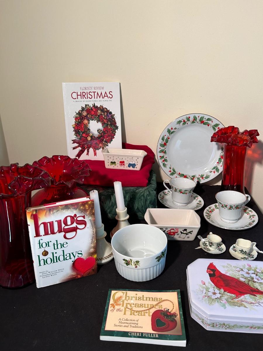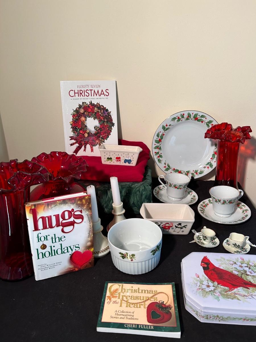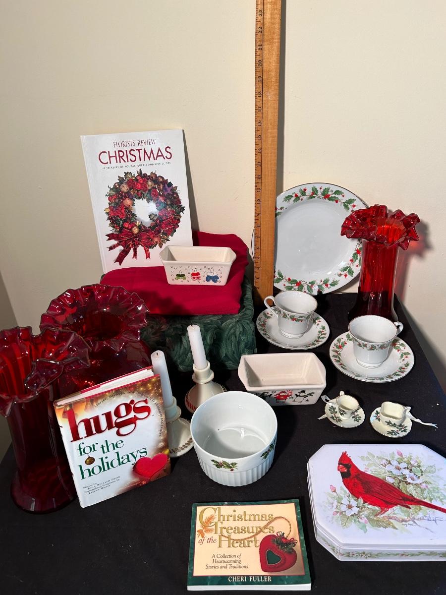 Christmas books, dishes, ornaments, red glass vases and more.