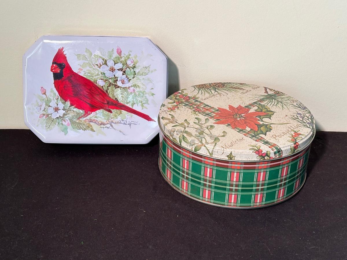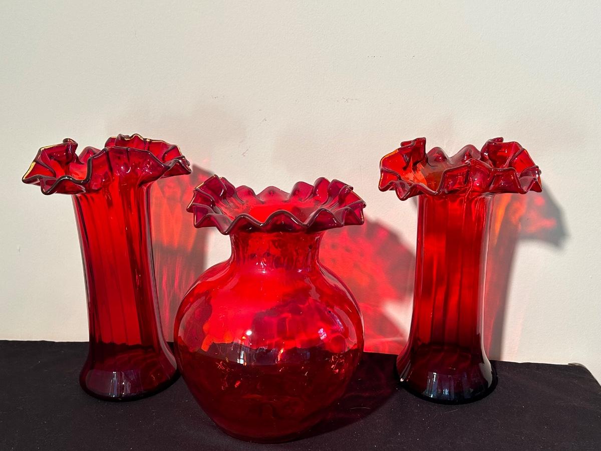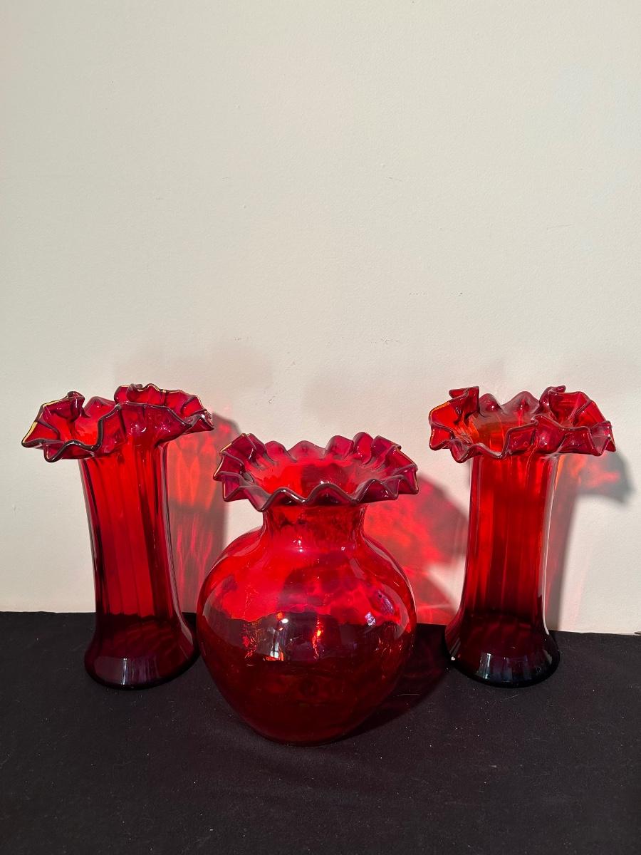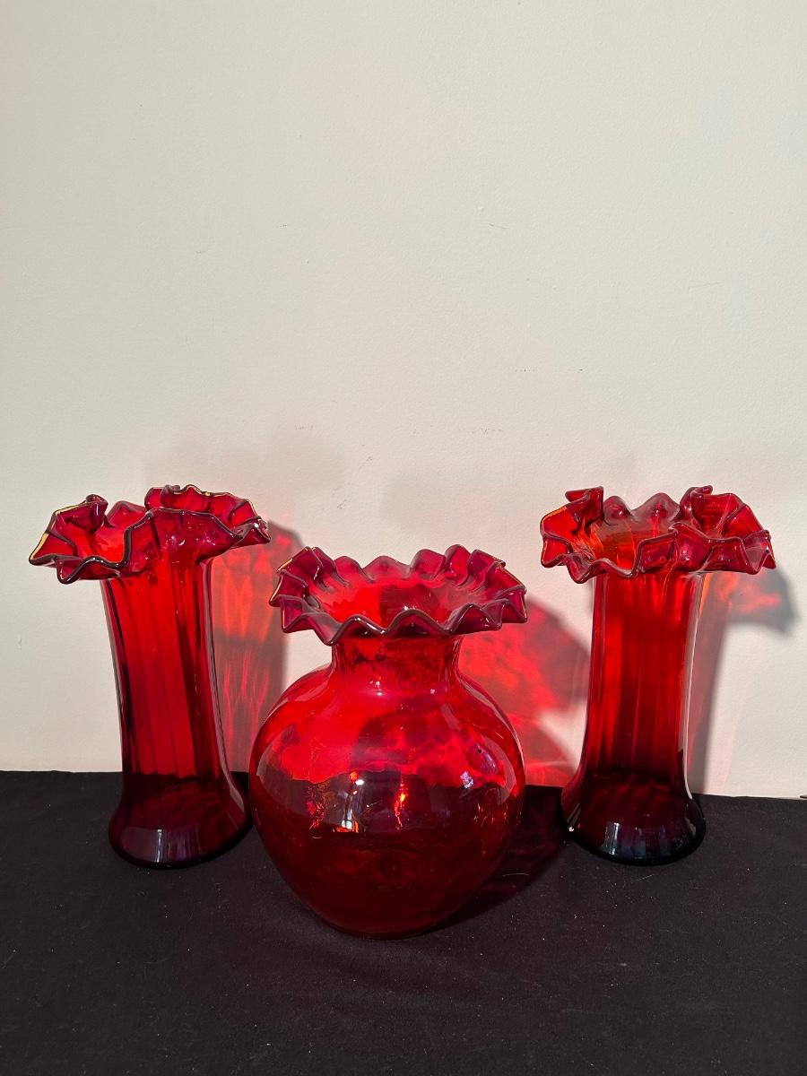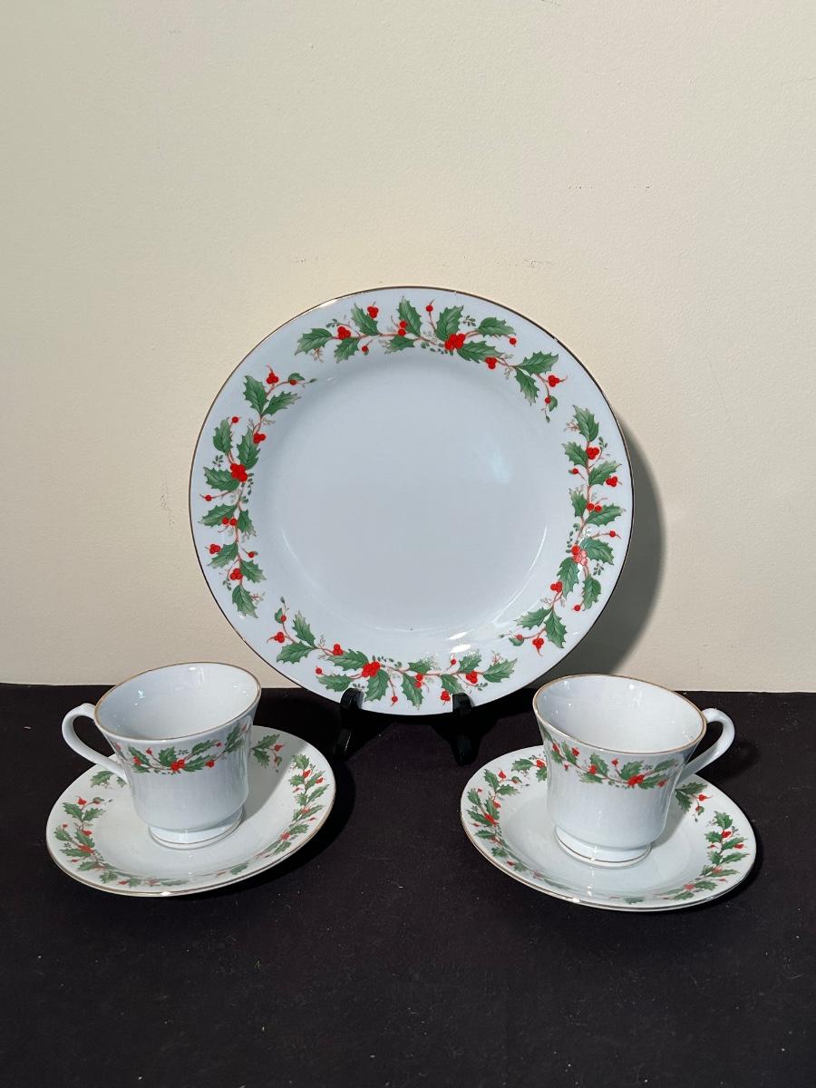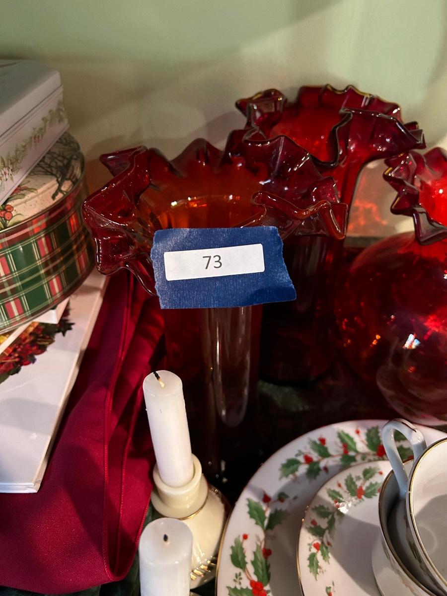 Christmas books, dishes, ornaments, red glass vases and more.