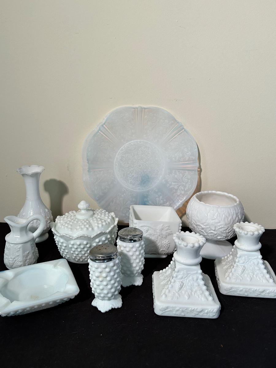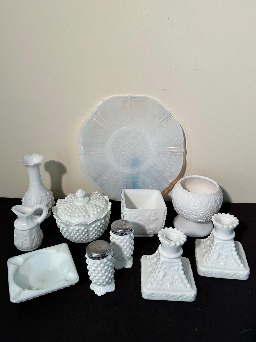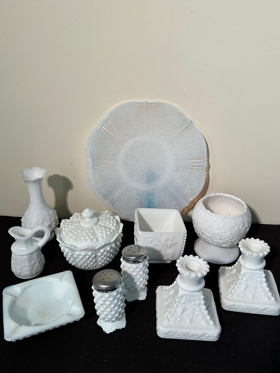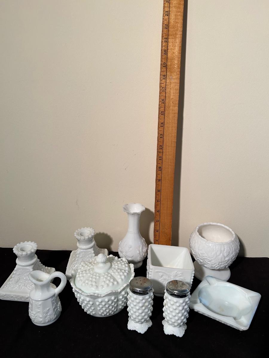 Milk Glass salt & pepper shakers, candlesticks, ashtray, candy dish with lid and more.