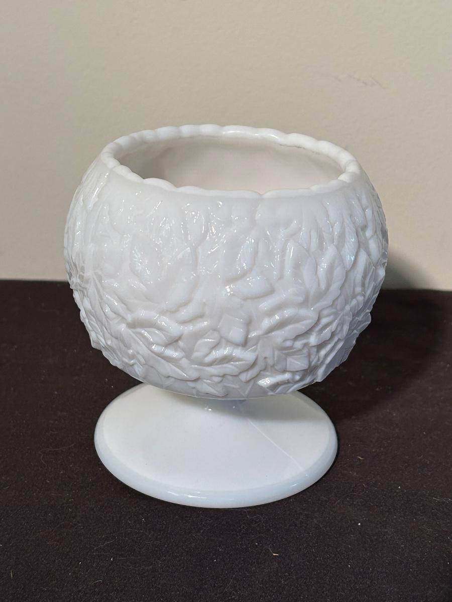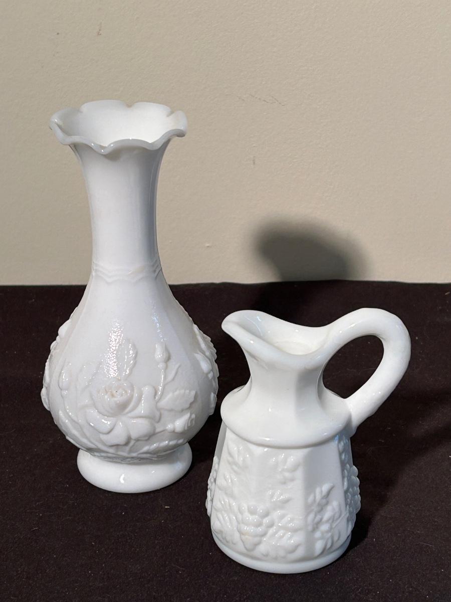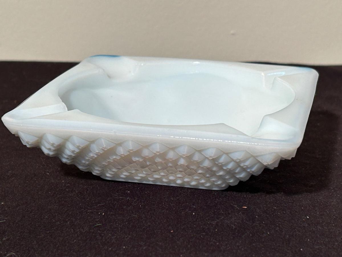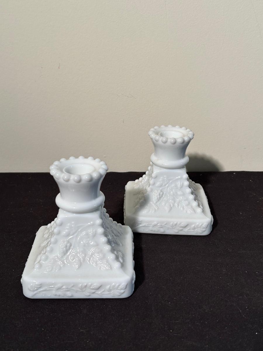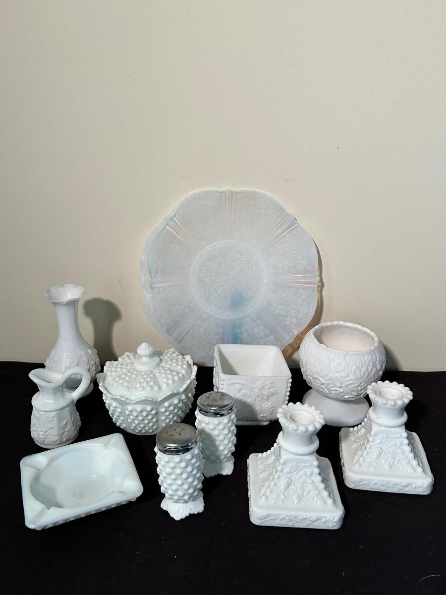 Milk Glass salt & pepper shakers, candlesticks, ashtray, candy dish with lid and more.