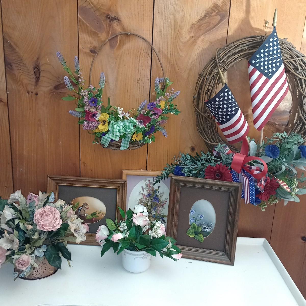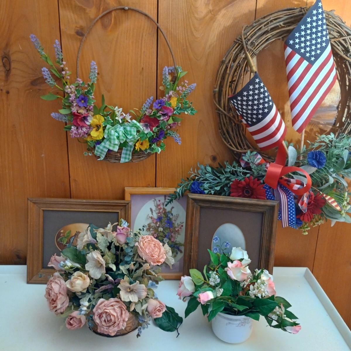 LOT 81M: Patriotic Wreath, Flower Arrangements and Three Pictures