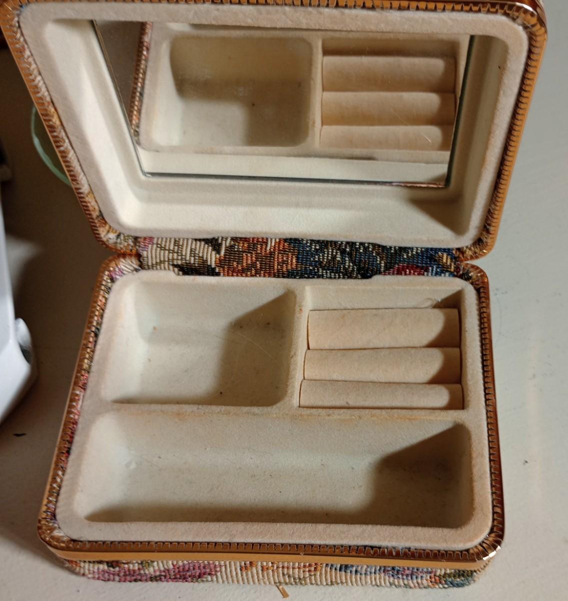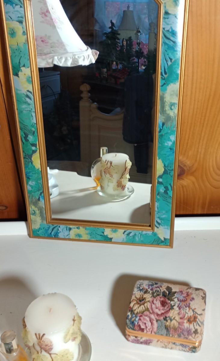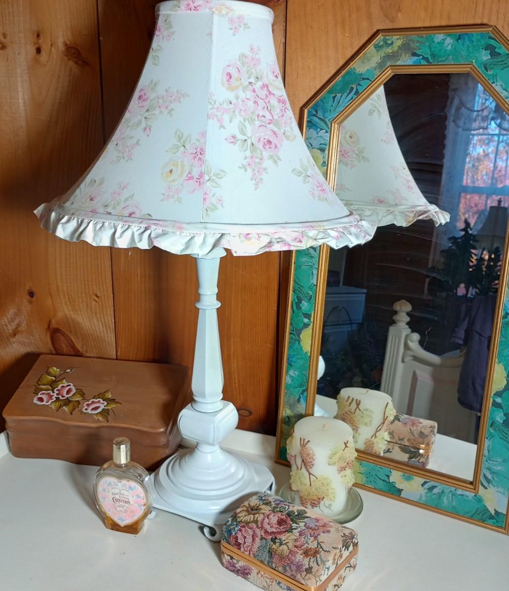 LOT 100M: Flowered Boudoir Lamp, Mirror, tapestry and handpainted Jewelry Boxes and More