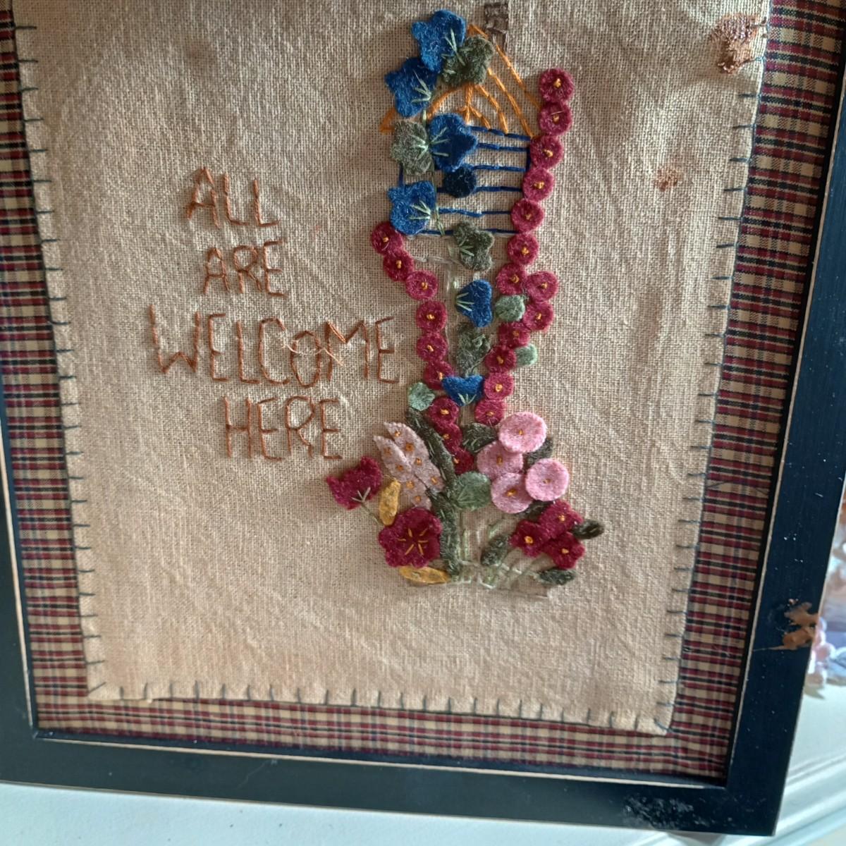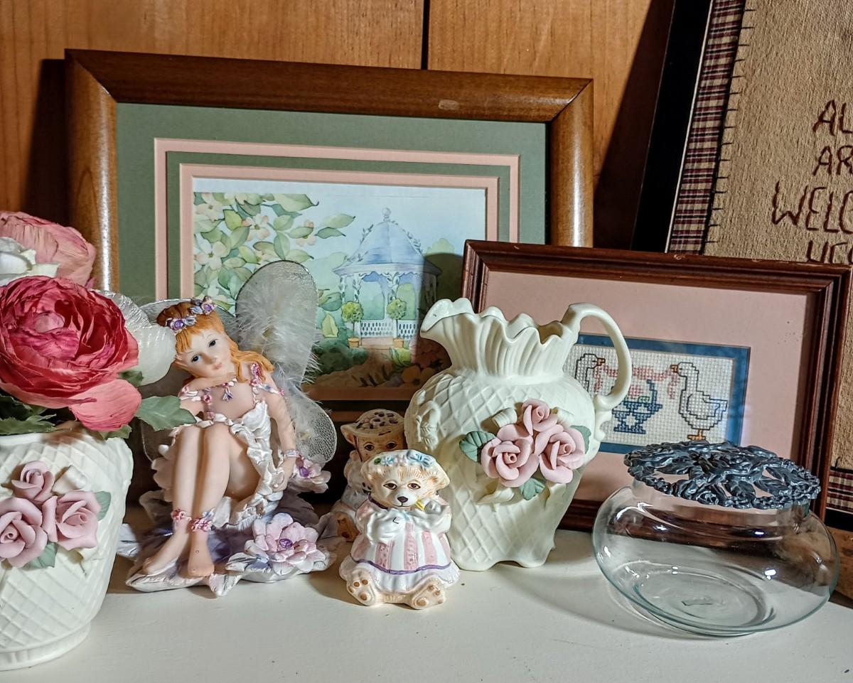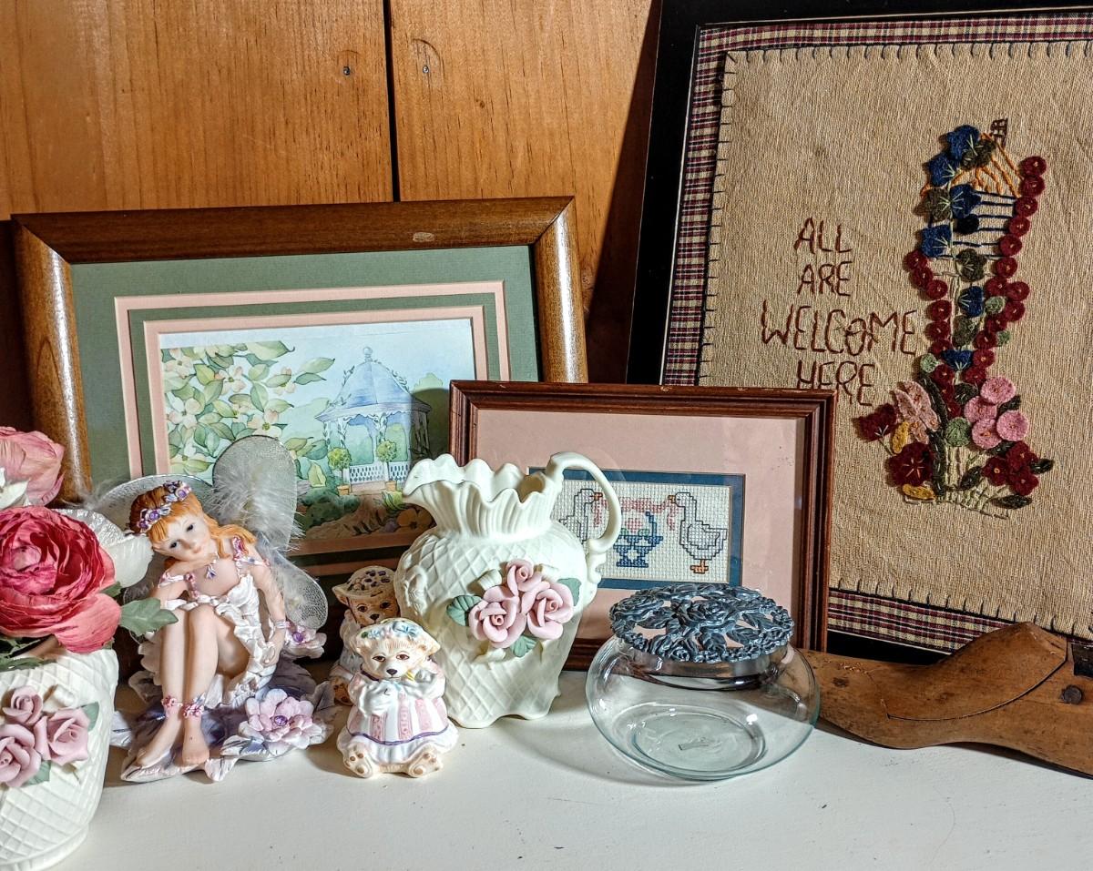 LOT 101M: Two Needlepoint Pictures, Salt and Pepper Shakers, Rose Pitcher and Vase w/Flowers and More Home Decor