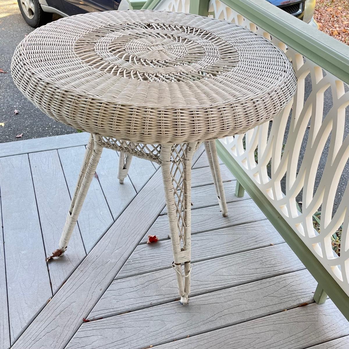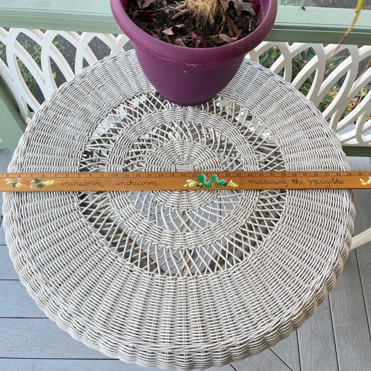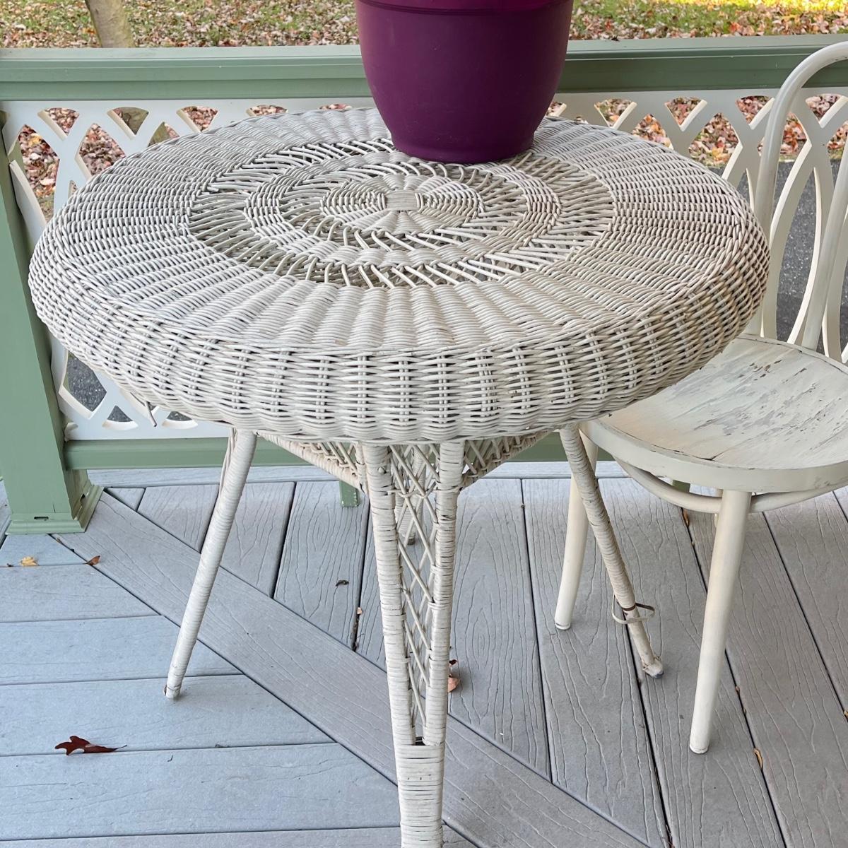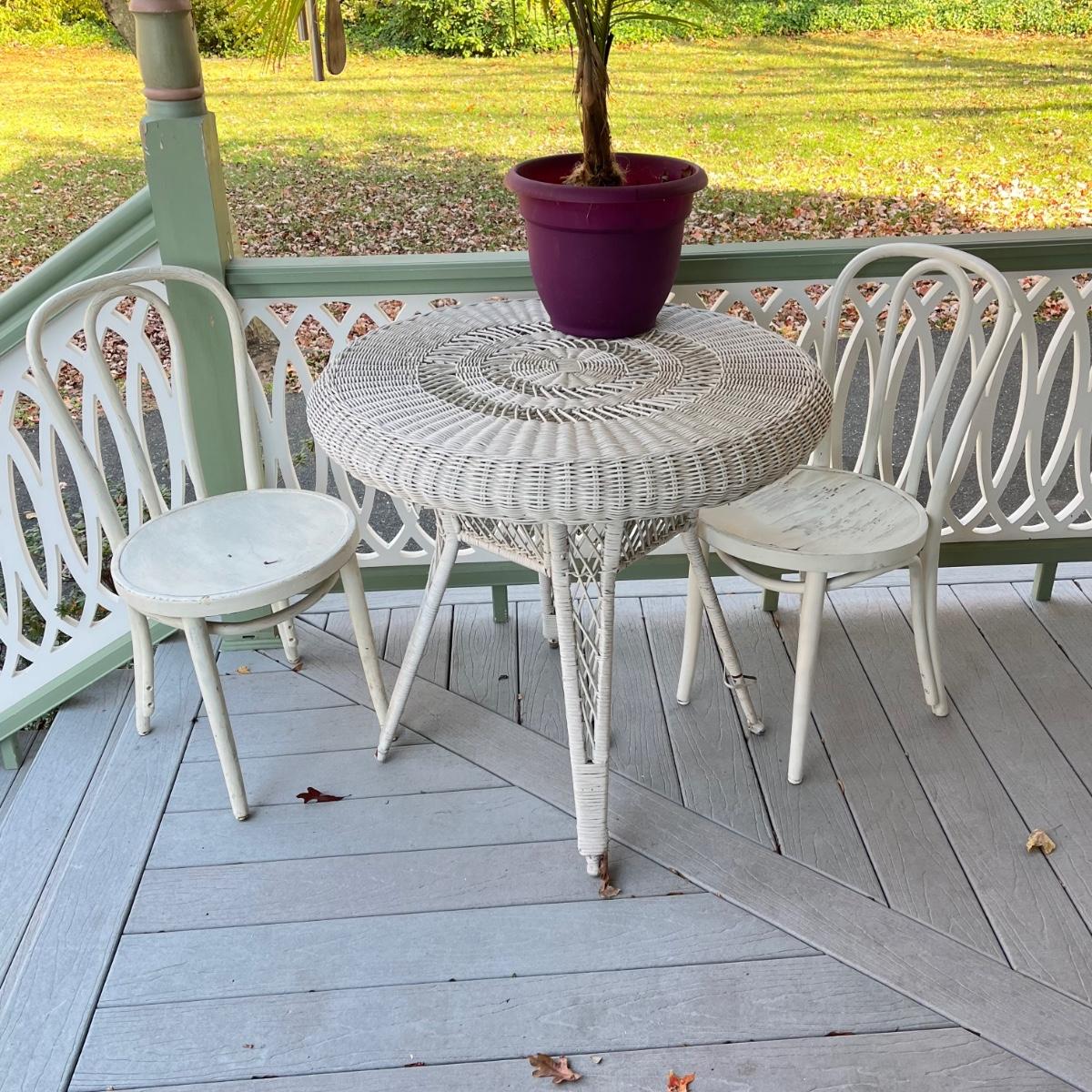 LOT 136Y: Wicker Table w/ Wooden Chairs, Live Plant, and Long Wind Chimes