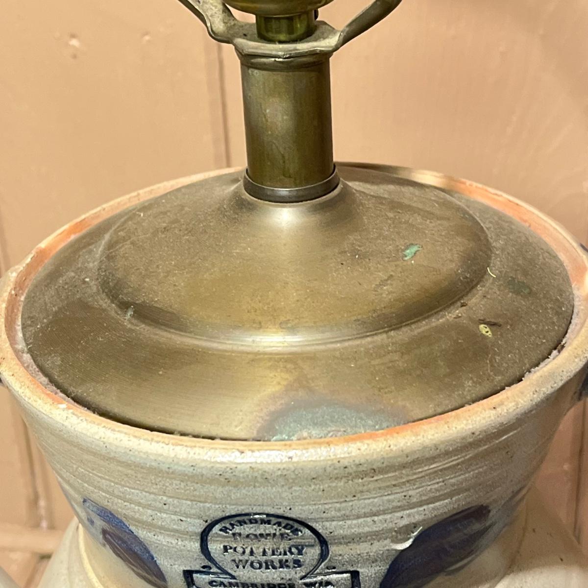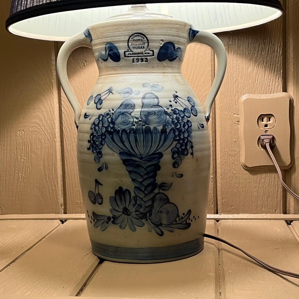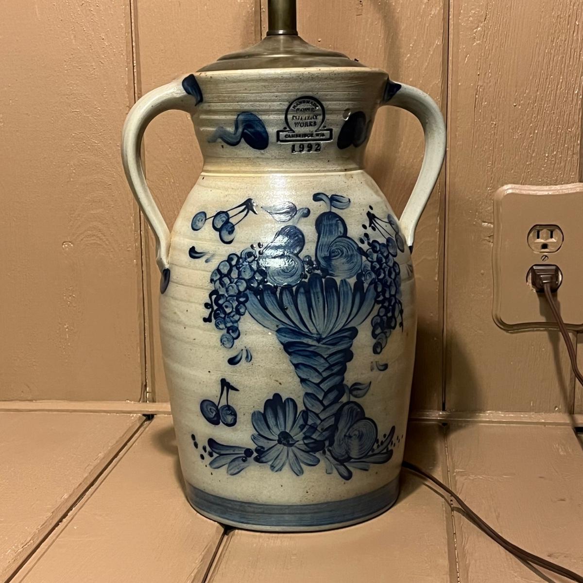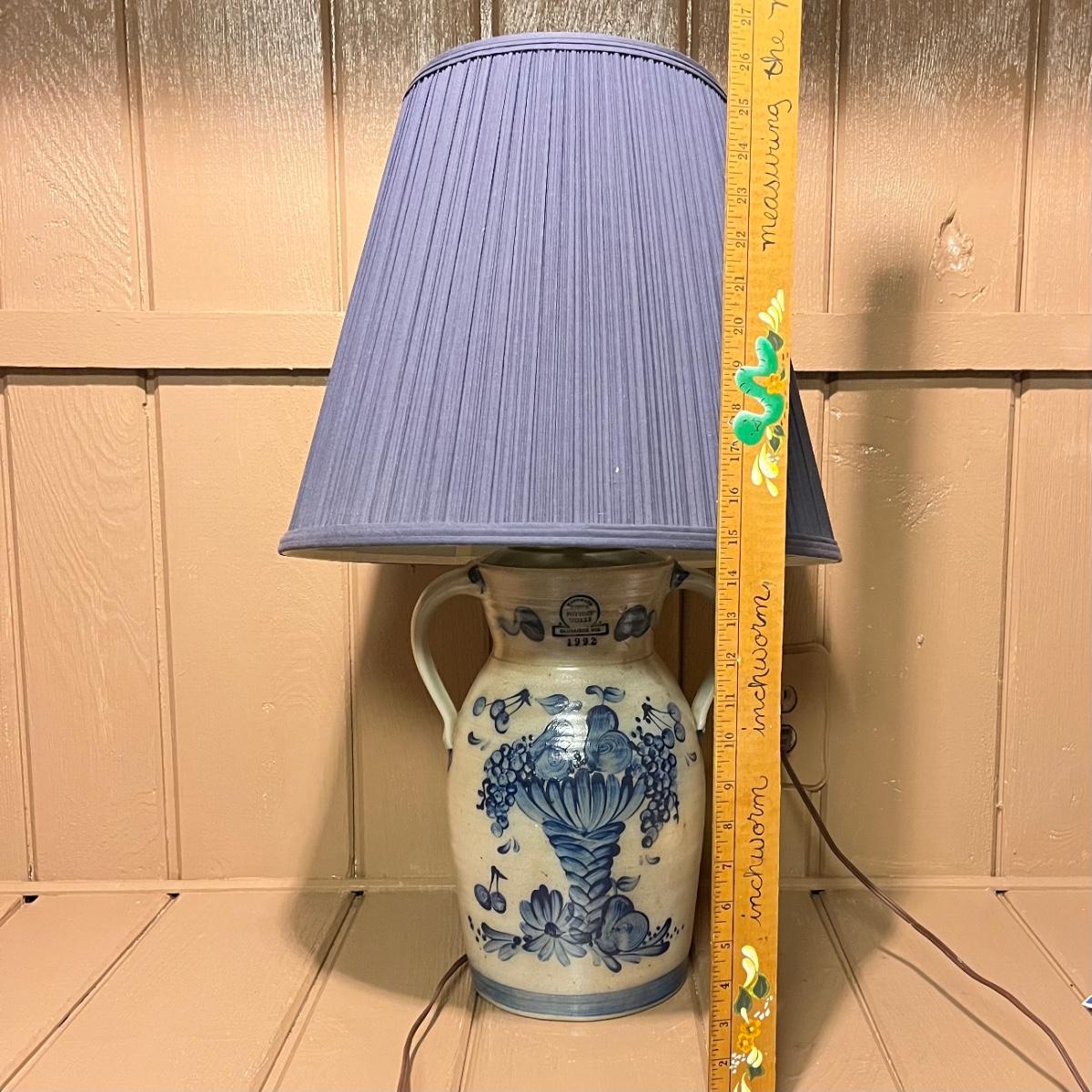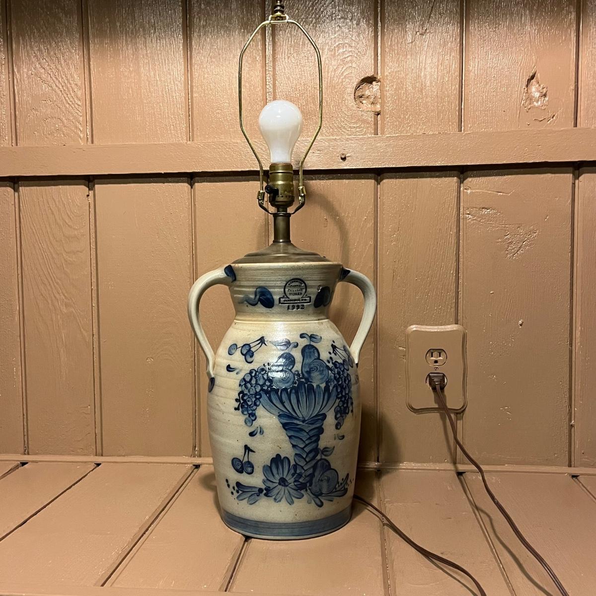 LOT 141B: Rowe Pottery Works 1992 Salt Glaze Blue Fruit and Flower Design Table Lamp