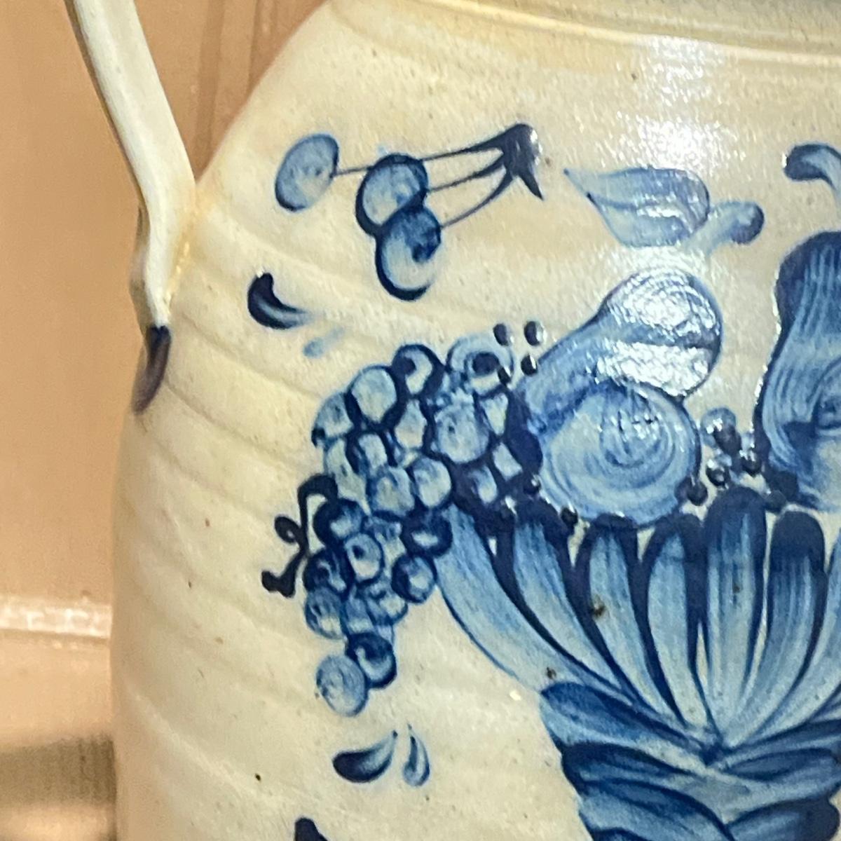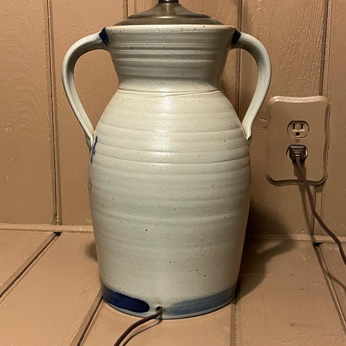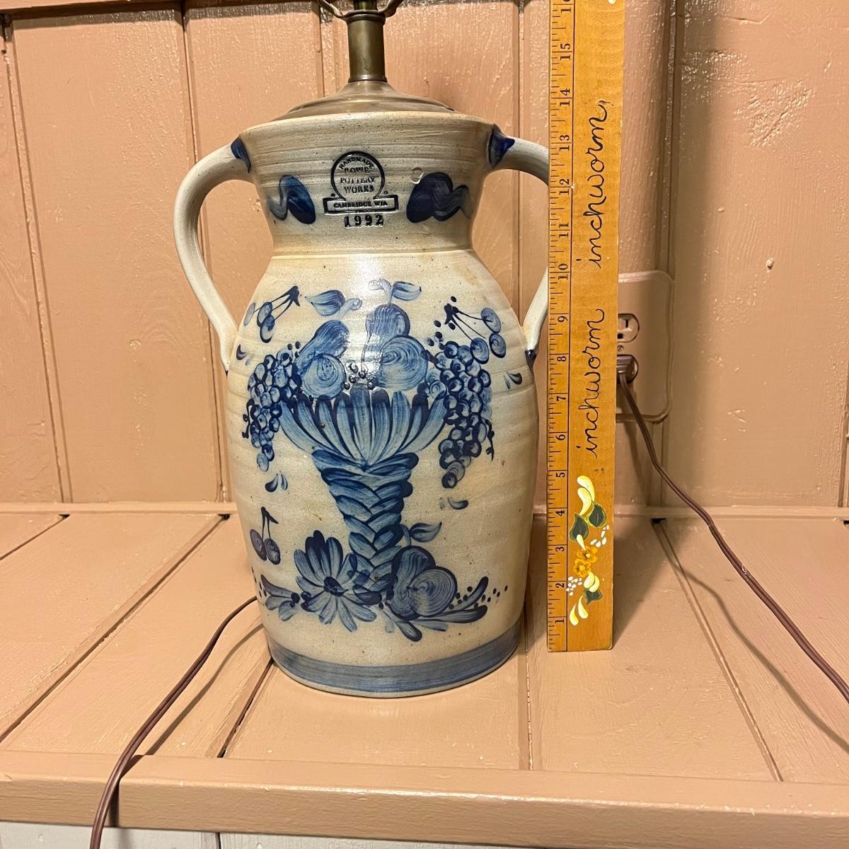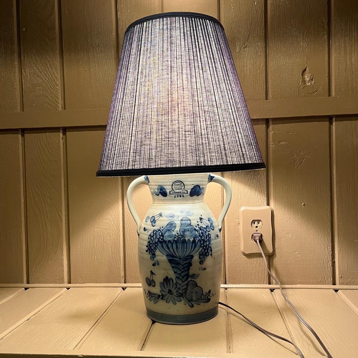 LOT 141B: Rowe Pottery Works 1992 Salt Glaze Blue Fruit and Flower Design Table Lamp
