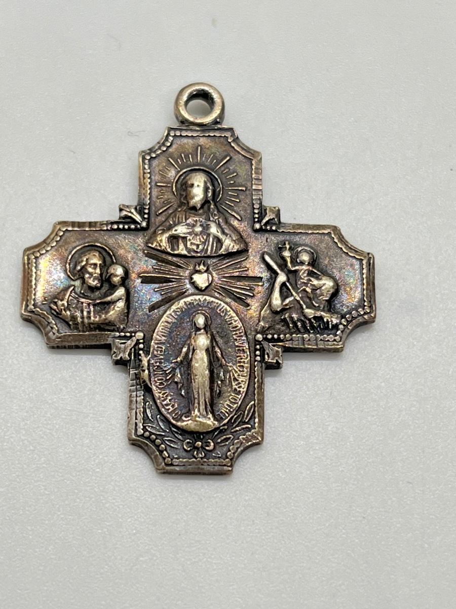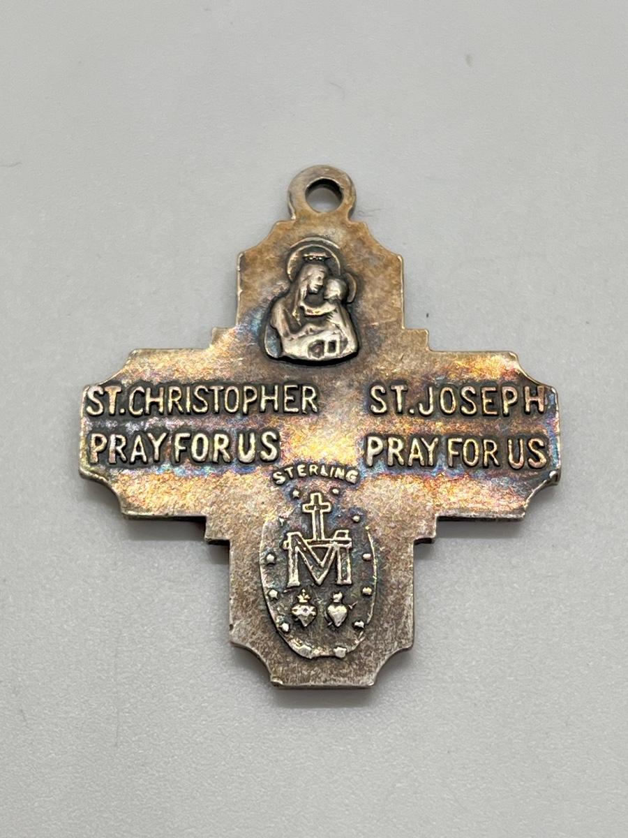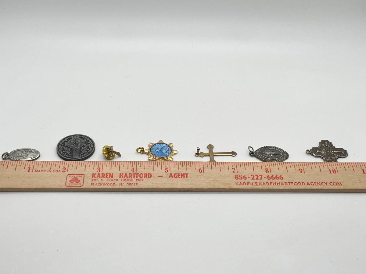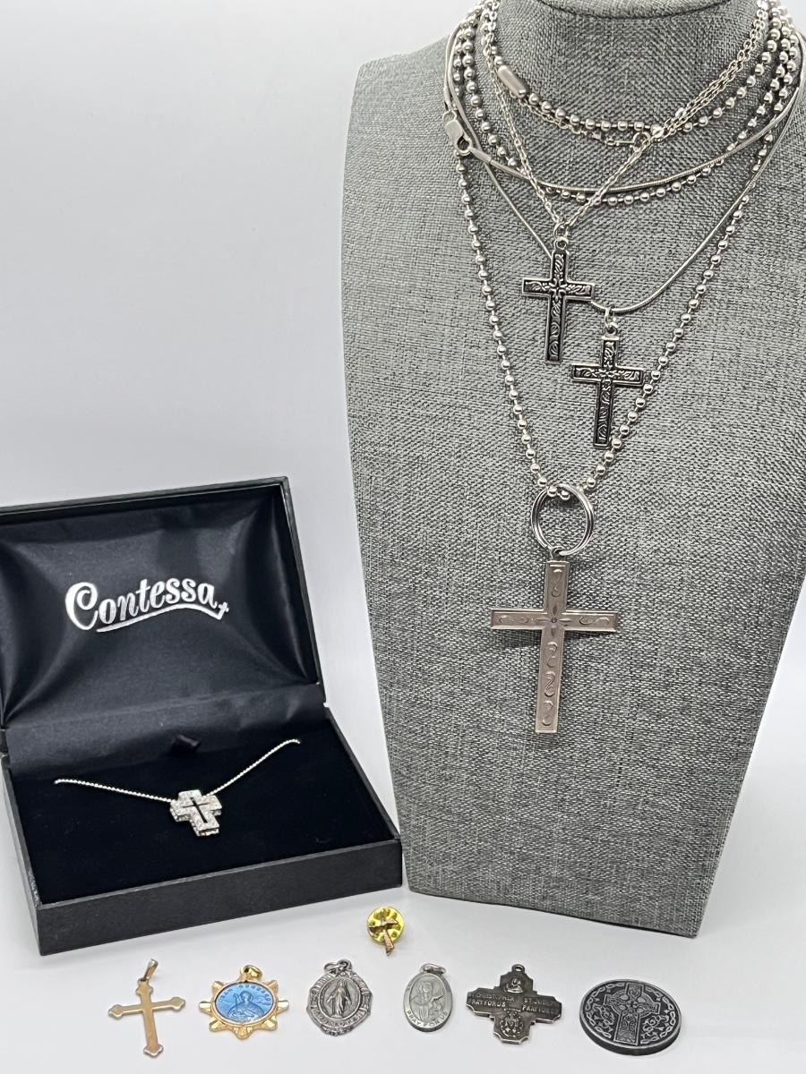 LOT 202: Cross Pendant Necklaces, Religious Medals, Pin- Sterling, pewter and more