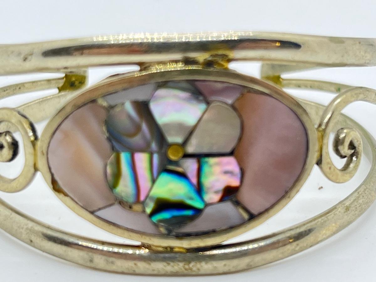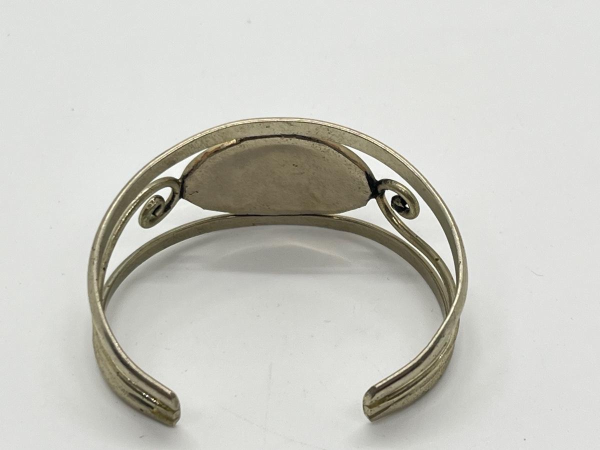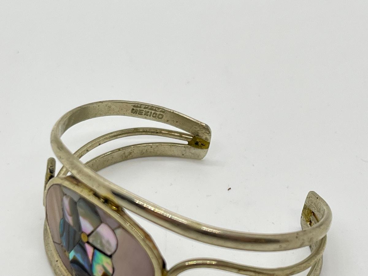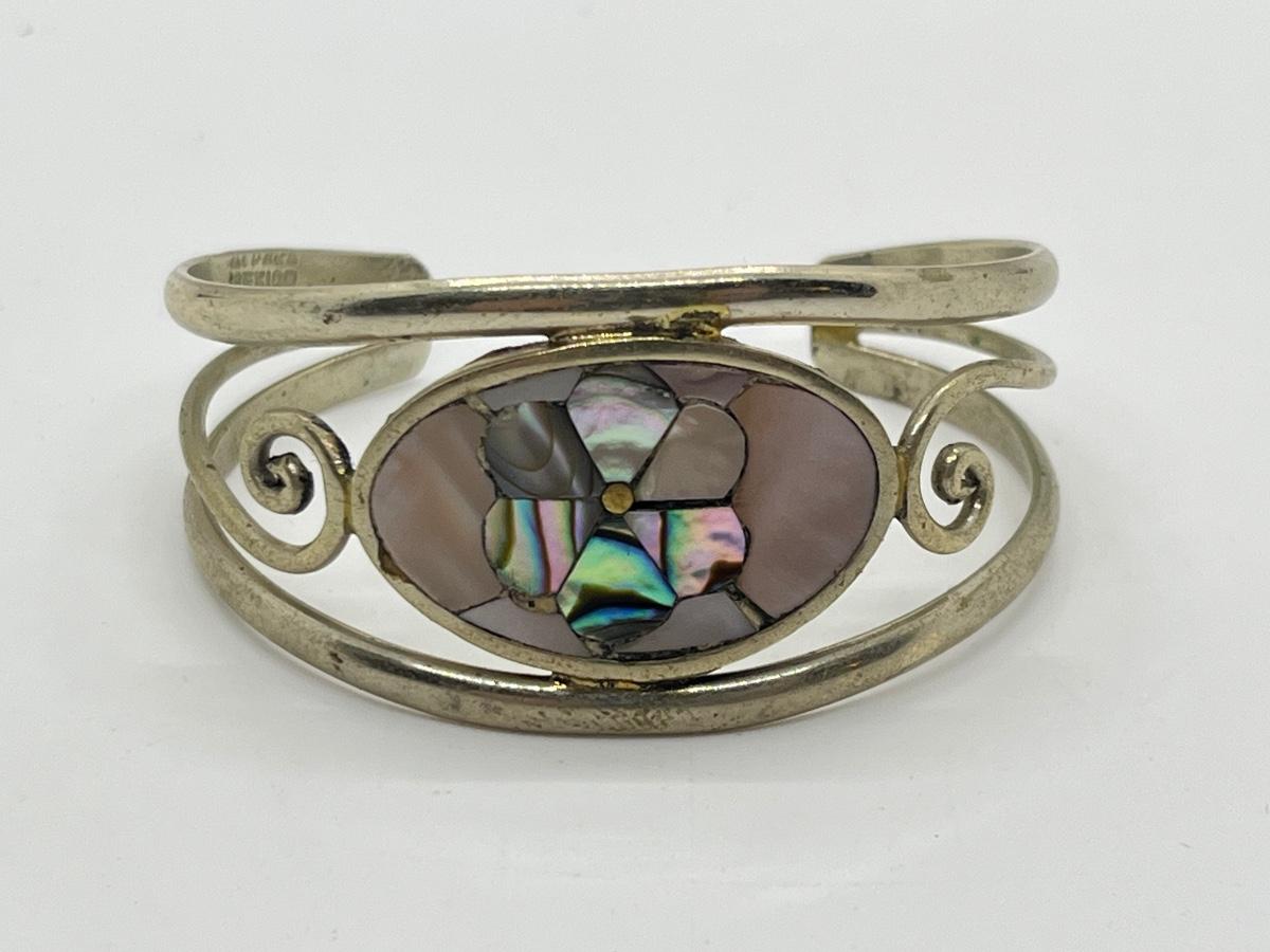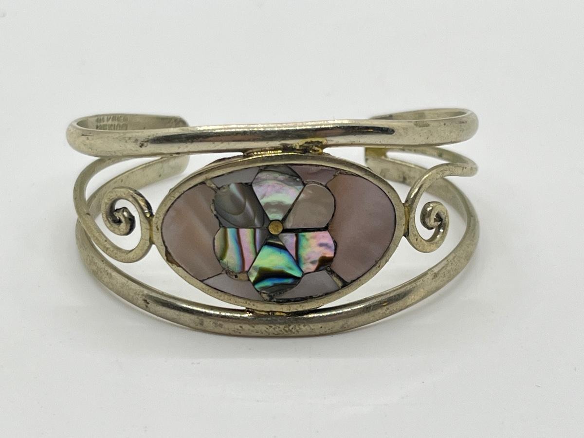 LOT 205: Vintage Alpaca Mexico Silver Open Cuff Bracelet with Floral Inlay