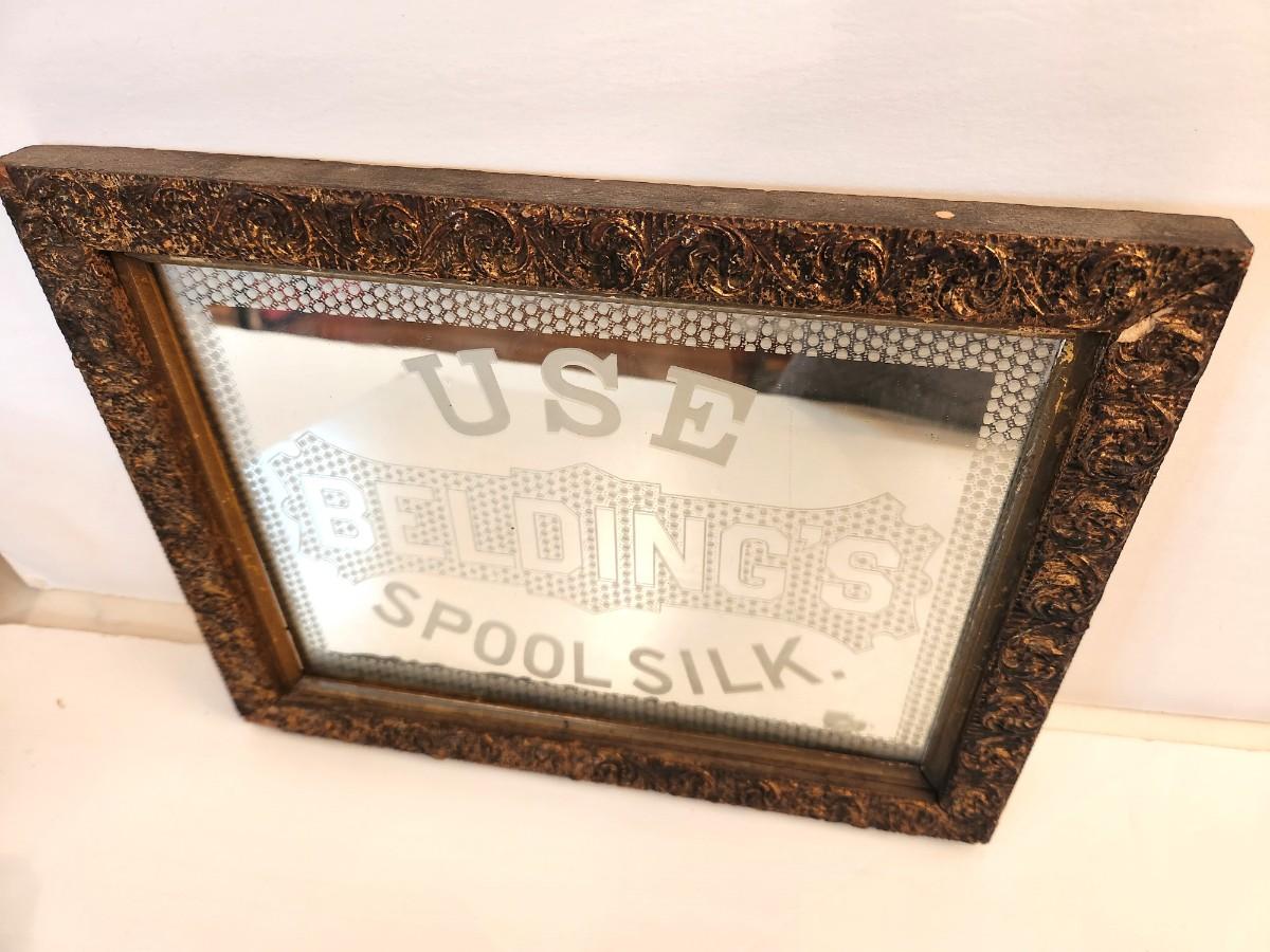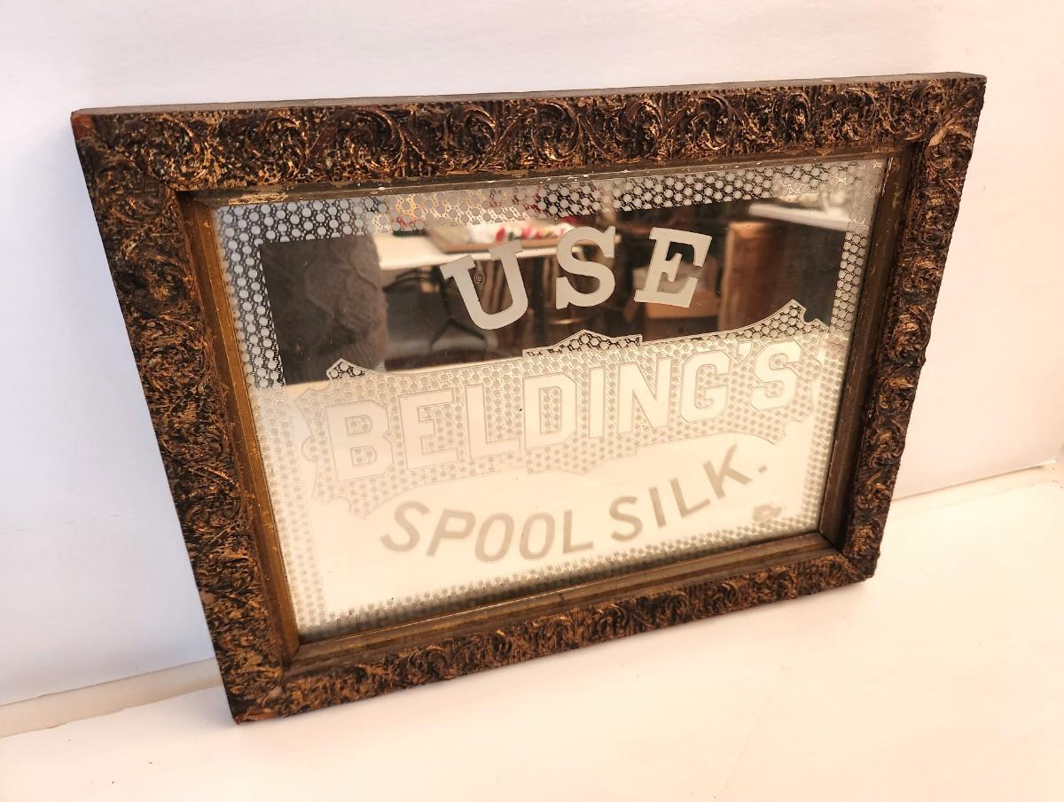 Wonderful antique mirrored store display - 19th century- "Use Belding's Spool Silk". I have not been able to locate another one like it. Great antique condition - the perfect gift for anyone who loves to sew - 14" x 11". Ornate wooden frame.