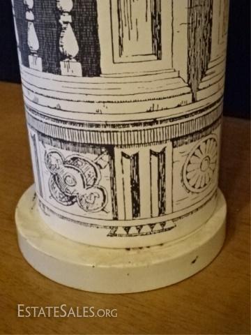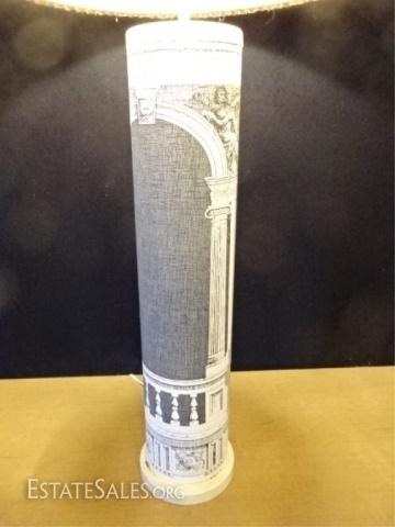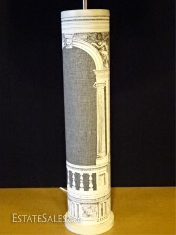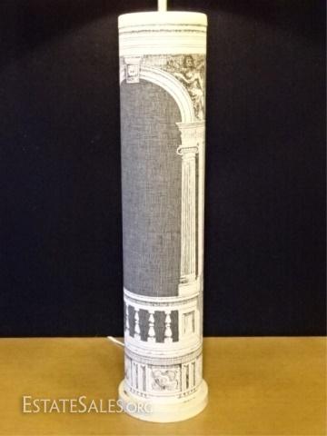 LOT 95D: TALL MID CENTURY TABLE LAMP WITH FORNASETTI WALLPAPERED COLUMN BASE