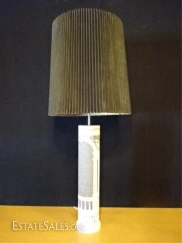 LOT 95D: TALL MID CENTURY TABLE LAMP WITH FORNASETTI WALLPAPERED COLUMN BASE, VERY GOOD CONDITION WITH MINOR WEAR, BLACK PLEATED SHADE, 46"H, SKU355.74