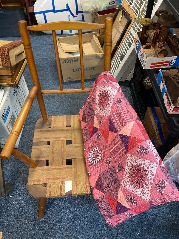 Chair from Hurley’s Store in Camden N.j. and quilt throw. Please see all pictures for condition of the items listed and what is included in the lot. Pictures will also show any measurements if taken and is the best representation of the items. Thank you for looking and have fun bidding! We appreciate Treasure Hunters!
