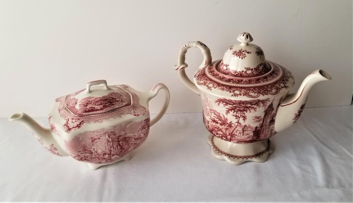 Lot #96  2 Red/Mulberry Transfer Ware Teapots