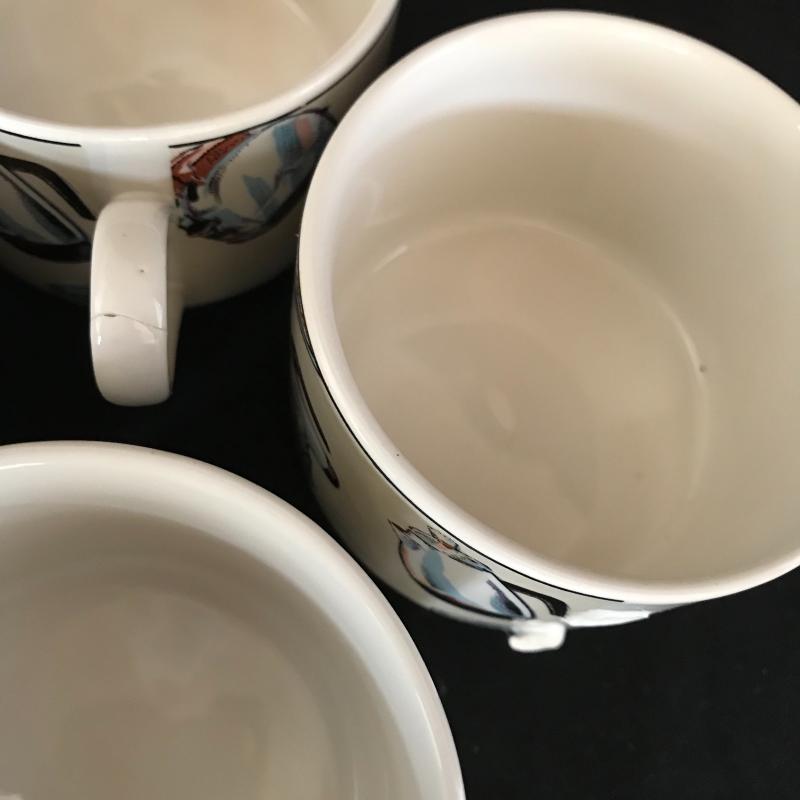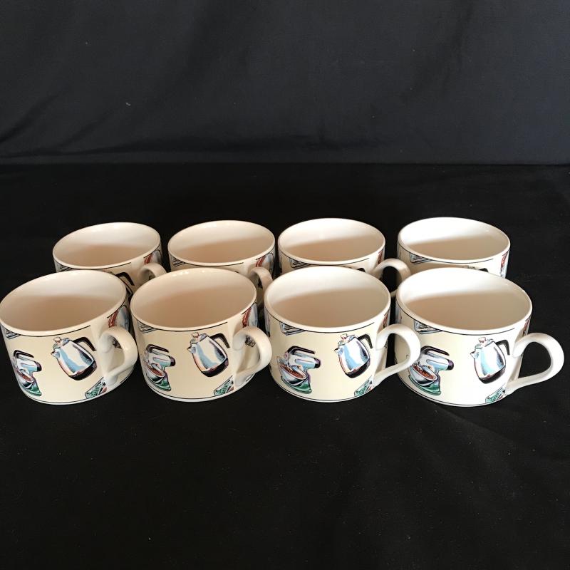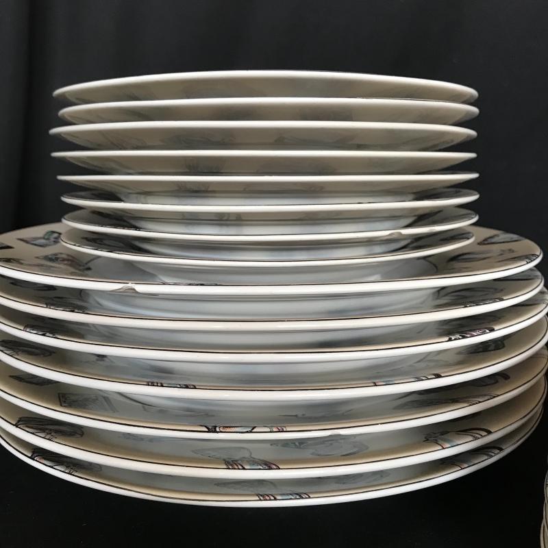 Great start to your first dining room! Americana “50’s Kitchen” plateware includes seven dinner and bread plates, eight appetizer plates, five bowls and eight mugs, one with a broken handles, see photos. Lot also includes Superior stainless silverware set along blue/gray hued timber’s- seven large, three medium and one small. Some chipping is noted in photos. No shipping.